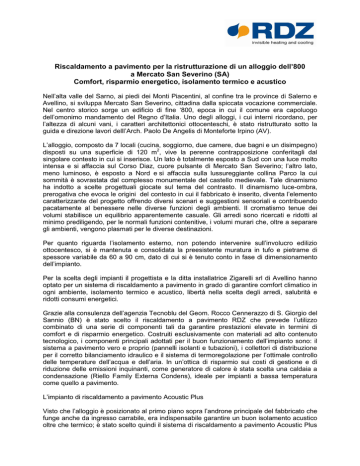 Riscaldamento a pavimento per la ristrutturazione di un alloggio dell’800 a Mercato San Severino (SA) Comfort, risparmio energetico, isolamento termico e acustico Nell’alta valle del Sarno, ai piedi dei Monti Piacentini, al confine tra le province di Salerno e Avellino, si sviluppa Mercato San Severino, cittadina dalla spiccata vocazione commerciale. Nel centro storico sorge un edificio di fine ‘800, epoca in cui il comune era capoluogo dell’omonimo mandamento del Regno d’Italia. Uno degli alloggi, i cui interni ricordano, per l’altezza di alcuni vani, i caratteri architettonici ottocenteschi, è stato ristrutturato sotto la guida e direzione lavori delll’Arch. Paolo De Angelis di Monteforte Irpino (AV). L’alloggio, composto da 7 locali (cucina, soggiorno, due camere, due bagni e un disimpegno) disposti su una superficie di 120 m2, vive la perenne contrapposizione conferitagli dal singolare contesto in cui si inserisce. Un lato è totalmente esposto a Sud con una luce molto intensa e si affaccia sul Corso Diaz, cuore pulsante di Mercato San Severino; l’altro lato, meno luminoso, è esposto a Nord e si affaccia sulla lussureggiante collina Parco la cui sommità è sovrastata dal complesso monumentale del castello medievale. Tale dinamismo ha indotto a scelte progettuali giocate sul tema del contrasto. Il dinamismo luce-ombra, prerogativa che evoca le origini del contesto in cui il fabbricato è inserito, diventa l’elemento caratterizzante del progetto offrendo diversi scenari e suggestioni sensoriali e contribuendo pacatamente al benessere nelle diverse funzioni degli ambienti. Il cromatismo tenue dei volumi stabilisce un equilibrio apparentemente casuale. Gli arredi sono ricercati e ridotti al minimo prediligendo, per le normali funzioni contenitive, i volumi murari che, oltre a separare gli ambienti, vengono plasmati per le diverse destinazioni. Per quanto riguarda l’isolamento esterno, non potendo intervenire sull’involucro edilizio ottocentesco, si è mantenuta e consolidata la preesistente muratura in tufo e pietrame di spessore variabile da 60 a 90 cm, dato di cui si è tenuto conto in fase di dimensionamento dell’impianto. Per la scelta degli impianti il progettista e la ditta installatrice Zigarelli srl di Avellino hanno optato per un sistema di riscaldamento a pavimento in grado di garantire comfort climatico in ogni ambiente, isolamento termico e acustico, libertà nella scelta degli arredi, salubrità e ridotti consumi energetici. Grazie alla consulenza dell’agenzia Tecnoblu del Geom. Rocco Cennerazzo di S. Giorgio del Sannio (BN) è stato scelto il riscaldamento a pavimento RDZ che prevede l’utilizzo combinato di una serie di componenti tali da garantire prestazioni elevate in termini di comfort e di risparmio energetico. Costruiti esclusivamente con materiali ad alto contenuto tecnologico, i componenti principali adottati per il buon funzionamento dell’impianto sono: il sistema a pavimento vero e proprio (pannelli isolanti e tubazioni), i collettori di distribuzione per il corretto bilanciamento idraulico e il sistema di termoregolazione per l’ottimale controllo delle temperature dell’acqua e dell’aria. In un’ottica di risparmio sui costi di gestione e di riduzione delle emissioni inquinanti, come generatore di calore è stata scelta una caldaia a condensazione (Riello Family Externa Condens), ideale per impianti a bassa temperatura come quello a pavimento. L’impianto di riscaldamento a pavimento Acoustic Plus Visto che l’alloggio è posizionato al primo piano sopra l’androne principale del fabbricato che funge anche da ingresso carrabile, era indispensabile garantire un buon isolamento acustico oltre che termico; è stato scelto quindi il sistema di riscaldamento a pavimento Acoustic Plus di RDZ, certificato DIN Certco (7F310-F), prodotto in polistirene sinterizzato espanso a doppia densità ed elasticizzato. I materiali impiegati e la tecnologia di produzione lo rendono unico per le prestazioni acustiche, assicurando una riduzione del livello sonoro da calpestio di 26 dB secondo UNI EN 140-8. In un’unica soluzione si è riusciti a combinare le buone prestazioni termiche del pavimento radiante con gli alti livelli di attenuazione dei rumori da calpestio. Tra le altre caratteristiche del pannello isolante possiamo citare la rigidità dinamica SD 20 MN/m3 secondo UNI EN 29052-1, la conducibilità termica di 0,037 W/(m*K) e la resistenza termica pari a 1,10 (m²*K)/W secondo i parametri delle norme UNI EN 12667 e UNI EN 13163. Il pannello di dimensioni 1161x663x30 mm è rivestito superficialmente da una pellicola dello spessore di 0,15 mm che permette di aumentare la resistenza meccanica nella fase di installazione. Le caratteristiche costruttive del pannello permettono un’installazione semplice e veloce: la forma delle nocche in sottosquadra e la pellicola di spessore elevato garantiscono un perfetto accoppiamento con la tubazione RDZ Clima in PE-Xc Ø 17-13 e gli accoppiamenti sui quattro lati permettono la formazione di un piano perfettamente uniforme senza ponti termici e acustici. Sopra il sistema a pavimento è stato posato un massetto autolivellante Massettomix Paris della ditta Leca, a basso spessore ed elevata conducibilità termica, specifico per impianti a pavimento. La pavimentazione scelta è un gres porcellanato Must della ditta Novabell, una collezione in ceramica che rispetta l’ambiente con il 40% di materie prime riciclate. La termoregolazione con Kit PF Duplex Per il corretto funzionamento dell’impianto è stato installato non un semplice collettore di distribuzione ma un organo in grado di gestire la distribuzione, la regolazione e il controllo dell’impianto: il Kit PF Duplex di RDZ. All’interno di questo dispositivo trovano spazio tutti i componenti necessari per la regolazione di un impianto misto ad alta e bassa temperatura. È dotato di valvola miscelatrice con testa termostatica per una regolazion