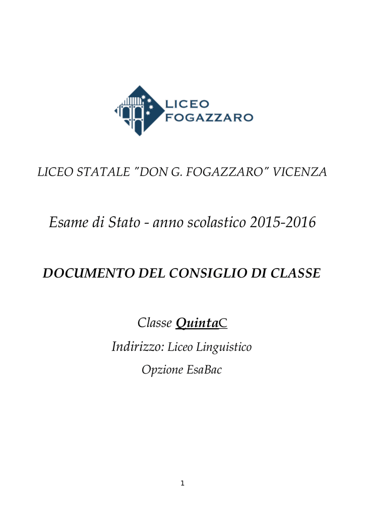 LICEO STATALE "DON G. FOGAZZARO" VICENZA Esame di Stato anno scolastico 20152016 DOCUMENTO DEL CONSIGLIO DI CLASSE Classe Quinta C Indirizzo: Liceo Linguistico Opzione EsaBac 1 Indice 1. Presentazione sintetica della classe 2. Programmazione collegiale e obiettivi raggiunti 3. Attività extracurricolari, progetti e concorsi 4. Simulazioni delle prove d'Esame 5. Allegati 2 LICEO STATALE "FOGAZZARO" VICENZA DOCUMENTO DEL CONSIGLIO DI CLASSE (Regolamento, art.5; O. M. 38 art.6) Anno scolastico 20152016 Classe: 5CLL Indirizzo: LINGUISTICO ESABAC Coordinatore di classe: Elisabetta Facco 1. PRESENTAZIONE SINTETICA DELLA CLASSE 1.1 Comportamento della classe, capacità relazionali e competenze disciplinari maturate nel triennio L’attuale classe 5Cl è composta da 19 studentesse. Il gruppo classe si è progressivamente assottigliato nel corso del quinquennio perdendo man mano tutti gli elementi maschili. Nel triennio dopo un ritiro e due mancate ammissioni alla fine del terzo anno, il numero delle alunne si è mantenuto stabile. Nel corso del triennio la classe ha dimostrato un forte interesse per tutte le materie corredato da una partecipazione che ha consentito alle studentesse più motivate di affinare strumenti espressivi e critici. Malgrado il forte desiderio di crescita personale e culturale da parte di tutte, l’impegno e lo studio sono stati in alcuni casi altalenanti sia per la mancanza di strumenti metodologici adeguati che per difficoltà personali. Il clima di classe è stato sereno e vivace, non sempre tuttavia seguito da una rielaborazione personale. Il rapporto tra gli insegnanti e le alunne è stato collaborativo ma,in alcuni casi, non si è riusciti a colmare pienamente difficoltà linguistico espressive e cognitive. Il gruppo classe ha però dimostrato un atteggiamento positivo nei confronti di esperienze che le proiettavano all’estero. Nell’estate del 2014 alla fine del terzo anno, 12 alunne hanno aderito al progetto MOVE for the FUTURE proposto dalla regione Veneto che consisteva in 60 ore di corso ripartito tra lezioni in Italia e in Spagna a Salamanca. Al loro ritorno in Italia molte di loro hanno superato la certificazione DELE B2 o C1. Durante l’estate successiva al termine del quarto anno, molte alunne hanno voluto mettersi alla prova con esperienze lavorative o di studio all’estero in Spagna, Canada, i Caraibi, Londra o in Italia così da usare e migliorare le lingue studiate. All’inizio dell’anno scolastico e anche in corso d’anno, cinque di loro hanno superato la certificazione C1 di inglese mentre buona parte della classe ha ottenuto la certificazione di livello B2 di inglese. La classe ha seguito due percorsi CLIL nel triennio: Storia in lingua francese, percorso EsaBac dalla classe terza (60 ore in quinta) eFilosofia in inglese dalla quarta (16 ore in quinta). A questo si aggiungono le seguenti attività svolte in inglese nel corrente anno scolastico: la partecipazione al laboratorio di biotecnologie (3 ore) in scienze e il modulo sul cricket in scienze motorie (2 ore). 1.2 Storia della classe nel triennio Classe 3° anno 4° anno 5° anno Iscritti 22 19 19 Ritirati 1 0 0 Nuovi inserimenti 0 0 0 Scrutinati a giugno 21 19 / 3 Promossi a giugno 14 17 / Giudizio sospeso 5 2 / Non ammessi 2 0 / 1.3 Composizione del consiglio di classe nel secondo biennio e quinto anno DISCIPLINE DOCENTI I anno secondo biennio CALEARI GIORGIA BIANCHIN LUCIA II anno secondo biennio CALEARI GIORGIA BIANCHIN LUCIA V anno CALEARI GIORGIA BIANCHIN LUCIA ELISABETTA FACCO Conversazione: MILLER DENISE GREGORI GRAZIELLA Conversazione: MATTANA FRANCOISE GRESELE STEFANIA Conversazione: GUASCH DOMENECH NURIA ELISABETTA FACCO Conversazione: MILLER DENISE GREGORI GRAZIELLA Conversazione: MATTANA FRANCOISE GRESELE STEFANIA Conversazione: GUASCH DOMENECH NURIA ELISABETTA FACCO Conversazione: MILLER DENISE GREGORI GRAZIELLA Conversazione: MATTANA FRANCOISE Storia Filosofia Scienze Naturali TRESSO PAOLO CARLI EDDJ CRACCO AMELIA TRESSO PAOLO CARLI EDDJ CRACCO AMELIA Fisica Matematica Storia dell’arte Scienze Motorie e Sportive ANTONIETTI STEFANO ANTONIETTI STEFANO ZACCARIA EMANUELA IOTTI FERNANDA ANTONIETTI STEFANO ANTONIETTI STEFANO ZACCARIA EMANUELA IOTTI FERNANDA TRESSO PAOLO CARLI EDDJ GRENDENE ALESSANDRA PESAVENTO STEFANO SCAPIN MICHELA ZACCARIA EMANUELA IOTTI FERNANDA Religione Lingua e letteratura italiana Lingua e cultura inglese Lingua e cultura francese Lingua e cultura spagnola SCHIRATO MONICA conversazione: MORA NORIS 2. PROGRAMMAZIONE COLLEGIALE E OBIETTIVI RAGGIUNTI 2.1 Obiettivi della Programmazione annuale e livelli raggiunti dalla classe Con riferimento allo Schema di regolamento recante “Revisione dell’assetto ordinamentale, organizzativo e didattico dei licei ai sensi dell’articolo 64, comma 4, del decreto legge 25 giugno 2008, n. 112, convertito dalla legge 6 agosto 2008, n. 133”, “Il percorso del liceo linguistico è indirizzato allo studio di più sistemi linguistici e culturali. Guida lo studente ad approfondire e a sviluppare le conoscenze e le abilità, a maturare le competenze necessarie per acquisire la padronanza comunicativa di tre lingue, oltre l’italiano e per comprendere criticamente l’identità storica e culturale di tradizioni e civiltà diverse” (art. 6 comma 1). Da settembre 2010 è entrato in vigore un nuovo percorso formativo che consente di conseguire simultaneamente due diplomi, l’Esame di Stato italiano e il Baccalauréat francese, in un unico esame. Oltre a raggiungere i risultati di apprendimento comuni a quelli del Liceo Linguistico, gli studenti EsaBac: ▪ studiano in modo più approfondito e in una prospettiva europea e internazionale la lingua, la cultura e la letteratura francese. Il programma tratta nove moduli culturali, dal Medioevo ad oggi; ▪ seguono un programma di storia comune ai licei EsaBac in Italia e in Francia. Questo programma ha l’ambizione di costruire una cultura storica comune ai due paesi, fornendo 