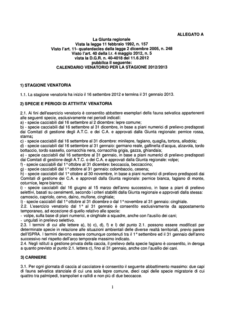 La Giunta regionale Vista la legge 11 febbraio 1992, n. 157 Visto l'art. 11- quaterdecies della legge 2 dicembre 2005, n. 248 Visto l'art. 40 della I.r. 4 maggio 2012, n. 5 vista la D.G.R. n. 40-4018 del 11.6.2012 pubblica il seguente: CALENDARIO VENATORIO PER LA STAGIONE 2012/2013 1) STAGIONE VENATORIA