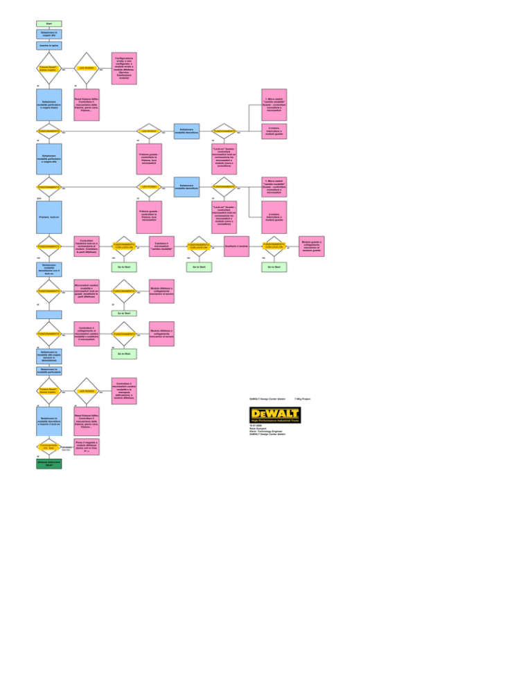 Start Selezionare la coppia alta inserire la spina Frizione Reset? (bassa coppia) LED ROSSO no si si Selezionare modalità perforatore e coppia bassa Reset frizione fallitoControllare il meccanismo della frizione, perno cavo, frizione… FUNZIONAMENTO no Configurazione errata, o non configurato, o modulo errato o modulo difettoso. (ServiceSostituzione modulo) 1. Micro switch "cambio modalità" Guasto - controllare connettore e microswitch LED ROSSO no si no Selezionare modalità demolitore si FUNZIONAMENTO LED ROSSO no yes "Lock-on" Guasto controllare microswitch lock-on connessione tra microswitch e modulo (cavo e connettore) no Controllare l'assieme lock-on e connessione al modulo (Cambiare le parti difettose) FUNZIONAMENTO CON LOCK-ON si no Cambiare il microswitch "cambio modalità" no Selezionare modalità demolizione con il lock on no FUNZIONAMENTO si no 1. Micro switch "cambio modalità" Guasto - controllare connettore e microswitch "Lock-on" Guasto controllare microswitch lock-on connessione tra microswitch e modulo (cavo e connettore) FUNZIONAMENTO CON LOCK-ON no no si Sostituire il modulo 2.motore, Interruttore o modulo guasto FUNZIONAMENTO CON LOCK-ON si Modulo guasto o collegamento meccanico al sensore guasto no Go to Start Go to Start Microswitch cambio modalità e microswitch lock-on guasti. (sostituire le parti difettose) FUNZIONAMENTO si Frizione guasta controllare la frizione, leva microswitch FUNZIONAMENTO FUNZIONAMENTO Selezionare modalità demolitore si Premere lock-on 2.motore, Interruttore o modulo guasto no si Frizione guasta controllare la frizione, leva microswitch Selezionare modalità perforatore e coppia alta FUNZIONAMENTO Go to Start Modulo difettoso o collegamento meccanico al senore si Go to Start FUNZIONAMENTO no Controllare il collegamento al microswitch cambio modalità o sostituire il microswitch FUNZIONAMENTO si no Modulo difettoso o collegamento meccanico al senore si Selezionare la modalità alta coppia (ancora in demolizione) Go to Start Selezionare la modalità perforatore Frizione Reset? (bassa coppia) LED ROSSO no si si Selezionare la modalità demolitore e inserire il lock-on Reset frizione fallitoControllare il meccanismo della frizione, perno cavo, frizione… Funzionamento min. 3sec si Sistema elettronico OKAY LED ROSSO dopo-2sec Perso il magnete o modulo difettoso (tacho coil or triac or µc) no Controllare il microswitch cambio modalità e la manopola (attivazione), o modulo difettoso. DeWALT Design Center Idstein 19.07.2006 René Gumpert Electr. Technology Engineer DeWALT Design Center Idstein 7-9Kg Project