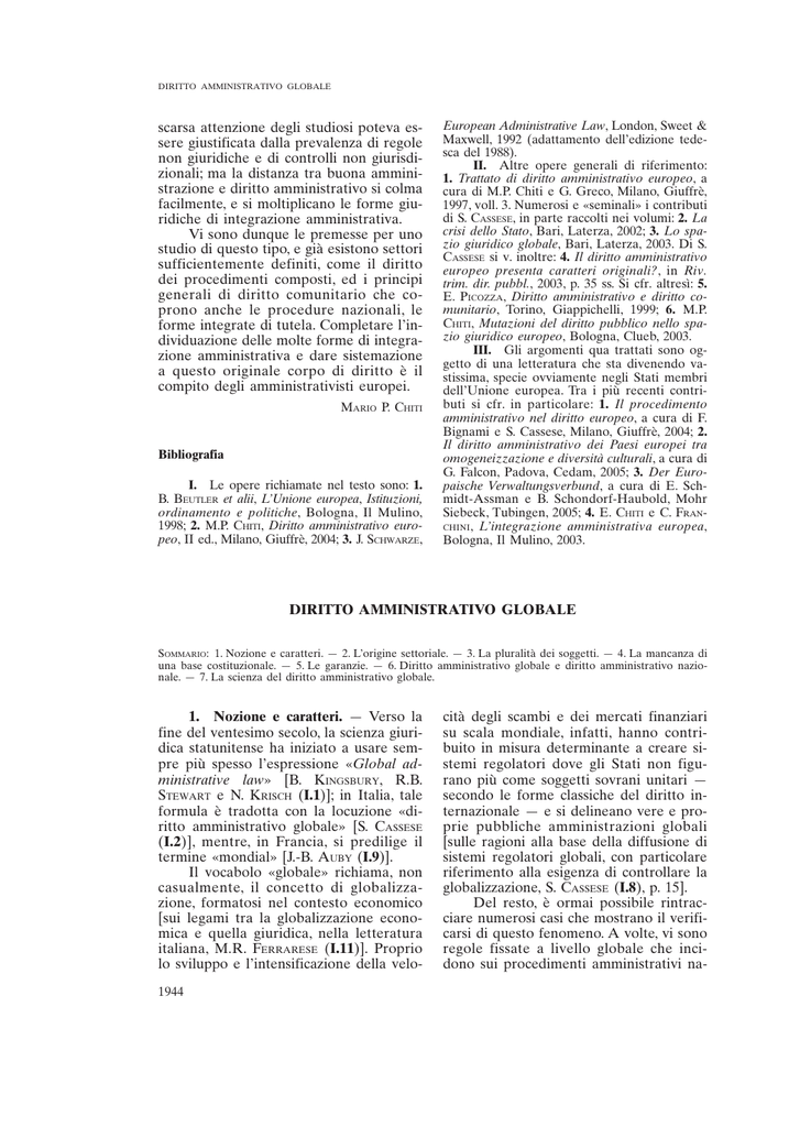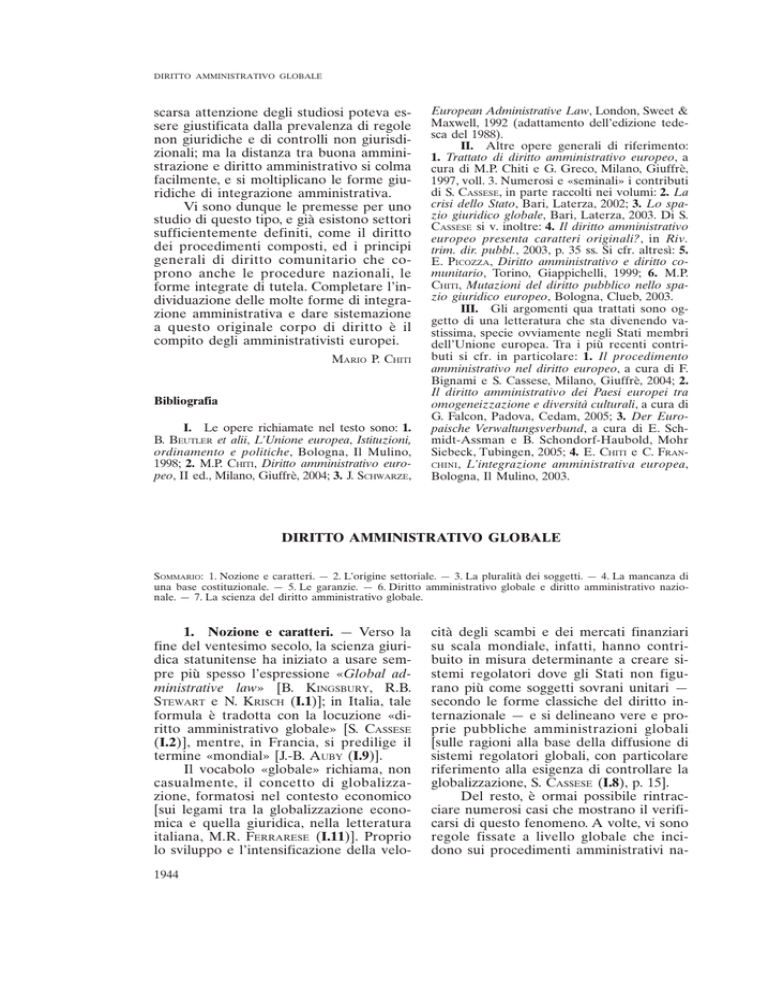 DIRITTO AMMINISTRATIVO GLOBALE scarsa attenzione degli studiosi poteva essere giustificata dalla prevalenza di regole non giuridiche e di controlli non giurisdizionali; ma la distanza tra buona amministrazione e diritto amministrativo si colma facilmente, e si moltiplicano le forme giuridiche di integrazione amministrativa. Vi sono dunque le premesse per uno studio di questo tipo, e già esistono settori sufficientemente definiti, come il diritto dei procedimenti composti, ed i principi generali di diritto comunitario che coprono anche le procedure nazionali, le forme integrate di tutela. Completare l’individuazione delle molte forme di integrazione amministrativa e dare sistemazione a questo originale corpo di diritto è il compito degli amministrativisti europei. MARIO P. CHITI Bibliografia I. Le opere richiamate nel testo sono: 1. B. BEUTLER et alii, L’Unione europea, Istituzioni, ordinamento e politiche, Bologna, Il Mulino, 1998; 2. M.P. CHITI, Diritto amministrativo europeo, II ed., Milano, Giuffrè, 2004; 3. J. SCHWARZE, European Administrative Law, London, Sweet & Maxwell, 1992 (adattamento dell’edizione tedesca del 1988). II. Altre opere generali di riferimento: 1. Trattato di diritto amministrativo europeo, a cura di M.P. Chiti e G. Greco, Milano, Giuffrè, 1997, voll. 3. Numerosi e «seminali» i contributi di S. CASSESE, in parte raccolti nei volumi: 2. La crisi dello Stato, Bari, Laterza, 2002; 3. Lo spazio giuridico globale, Bari, Laterza, 2003. Di S. CASSESE si v. inoltre: 4. Il diritto amministrativo europeo presenta caratteri originali?, in Riv. trim. dir. pubbl., 2003, p. 35 ss. Si cfr. altresı̀: 5. E. PICOZZA, Diritto amministrativo e diritto comunitario, Torino, Giappichelli, 1999; 6. M.P. CHITI, Mutazioni del diritto pubblico nello spazio giuridico europeo, Bologna, Clueb, 2003. III. Gli argomenti qua trattati sono oggetto di una letteratura che sta divenendo vastissima, specie ovviamente negli Stati membri dell’Unione europea. Tra i più recenti contributi si cfr. in particolare: 1. Il procedimento amministrativo nel diritto europeo, a cura di F. Bignami e S. Cassese, Milano, Giuffrè, 2004; 2. Il diritto amministrativo dei Paesi europei tra omogeneizzazione e diversità culturali, a cura di G. Falcon, Padova, Cedam, 2005; 3. Der Europaische Verwaltungsverbund, a cura di E. Schmidt-Assman e B. Schondorf-Haubold, Mohr Siebeck, Tubingen, 2005; 4. E. CHITI e C. FRANCHINI , L’integrazione amministrativa europea, Bologna, Il Mulino, 2003. DIRITTO AMMINISTRATIVO GLOBALE SOMMARIO: 1. Nozione e caratteri. — 2. L’origine settoriale. — 3. La pluralità dei soggetti. — 4. La mancanza di una base costituzionale. — 5. Le garanzie. — 6. Diritto amministrativo globale e diritto amministrativo nazionale. — 7. La scienza del diritto amministrativo globale. 1. Nozione e caratteri. — Verso la fine del ventesimo secolo, la scienza giuridica statunitense ha iniziato a usare sempre più spesso l’espressione «Global administrative law» [B. KINGSBURY, R.B. STEWART e N. KRISCH (I.1)]; in Italia, tale formula è tradotta con la locuzione «diritto amministrativo globale» [S. CASSESE (I.2)], mentre, in Francia, si predilige il termine «mondial» [J.-B. AUBY (I.9)]. Il vocabolo «globale» richiama, non casualmente, il concetto di globalizzazione, formatosi nel contesto economico [sui legami tra la globalizzazione economica e quella giuridica, nella letteratura italiana, M.R. FERRARESE (I.11)]. Proprio lo sviluppo e l’intensificazione della velo1944 cità degli scambi e dei mercati finanziari su scala mondiale, infatti, hanno contribuito in misura determinante a creare sistemi regolatori dove gli Stati non figurano più come soggetti sovrani unitari — secondo le forme classiche del diritto internazionale — e si delineano vere e proprie pubbliche amministrazioni globali [sulle ragioni alla base della diffusione di sistemi regolatori globali, con particolare riferimento alla esigenza di controllare la globalizzazione, S. CASSESE (I.8), p. 15]. Del resto, è ormai possibile rintracciare numerosi casi che mostrano il verificarsi di questo fenomeno. A volte, vi sono regole fissate a livello globale che incidono sui procedimenti amministrativi na- DIRITTO AMMINISTRATIVO GLOBALE zionali, per esempio garantendo ai cittadini il diritto di partecipazione. In campo ambientale, la Dichiarazione di Rio de Janeiro (1992) ha stabilito che «a livello nazionale ogni individuo dovrà avere idoneo accesso alle informazioni riguardanti l’ambiente in possesso delle autorità pubbliche, comprese le informazioni su materiali e attività pericolose nelle loro comunità, e dovrà avere la possibilità di partecipare ai processi decisionali» (Principio 10). Sulla base di questa disposizione, la Convenzione di Aarhus (1998) ha sancito il principio di «public participation» (art. 1.1), riconoscendo il diritto di accesso alle informazioni ambientali (art. 6) e prevedendo idonee garanzie partecipative ai procedimenti (art. 7 e 8). Oppure esistono casi in cui istituzioni globali prevedono forme di intervento dei privati nei propri procedimenti, «superando» il filtro delle amministrazioni degli Stati a cui tali privati appartengono: si v., con riferimento allo sport, il codice mondiale in materia anti-doping, in base a cui si garantisce alle parti coinvolte il diritto di essere ascoltati non solo di fronte alle autorità anti-doping nazionali, ma anche davanti al Comitato Olimpico Internazionale o alle Federazioni internazionali (art. 8 World Anti-Doping Code). In altre ipotesi, analoghe forme di partecipazione sono previste per gli Stati: per es. le linee guida per l’attuazione della World Heritage Convention, nel dettare regole sulla compilazione della lista di beni appartenenti al patrimonio culturale mondiale, stabilisce modalità di coordinamento e consultazione tra Stati e Segretariato dell’Unesco World Heritage Centre (art. 149-150 e 159-169). In altri casi ancora, po
