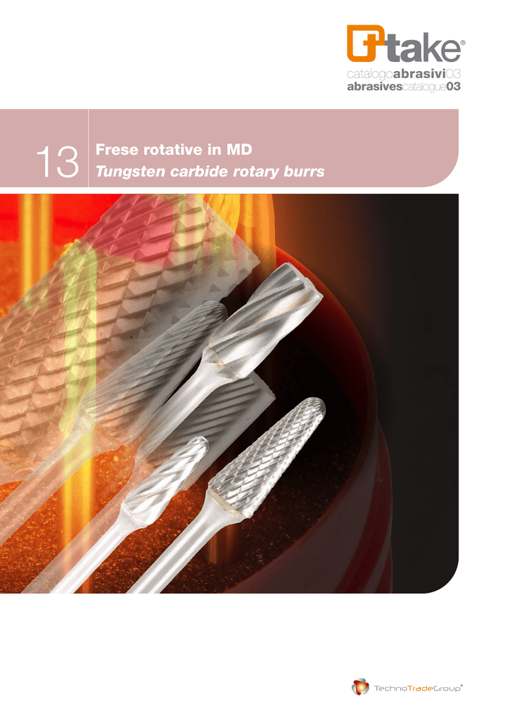 catalogoabrasivi03 abrasivescatalogue03 13 Frese rotative in MD Tungsten carbide rotary burrs 13 Guida per la scelta del taglio Cut selection guide Taglio Z3 | Cut Z3 Tagliente standard utilizzato per cordoni di saldatura, acciai, acciai fusi e acciai temprati. Ottimo rendimento con buona finitura superficiale. Standard cutting edge for general applications on steel, cast steel, tempered steel and for welding seam removal. Very good performance with good surface finish. Taglio Z6 | Cut Z6 Tagliente incrociato universale; riduce le vibrazioni durante la lavorazione, consentendo un miglior controllo della fresa da parte dell’operatore. Indicato per applicazioni su tutti i tipi di acciai, anche quelli resistenti alla corrosione. Ottimo controllo del truciolo e buona finitura. Double cutting edge for general purpose use; vibrations’ reduction and better control of the burr. Recommended for applications on all types of steels, stainless steel included. Considerable chips’ reduction and good finish. Taglio Z-ALU | Cut Z-ALU Tagliente specifico per grandi asportazioni di materiali e facile evacuazione del truciolo. Indicato per lavorazioni su alluminio, materie plastiche e gomme dure. Fast mill cutting edge for heavy and rapid stock removal operations. Recommended for applications on non-ferrous materials, including plastics and hard rubber. Guida alle velocità di utilizzo Recommended operating speeds guide ALLUMINIO ALUMINIUM GHISA - BRONZO CAST IRON - BRONZE Diametro fresa (mm.) Giri al min. max Burr head diameter (mm.) Max operating speeds Giri Speed range Giri di partenza Recommended start point Giri Speed range Giri di partenza Recommended start point 60.000-80.000 15.000-60.000 10.000-50.000 7.000-30.000 6.000-20.000 65.000 40.000 25.000 20.000 15.000 45.000-80.000 22.000-60.000 15.000-40.000 11.000-30.000 9.000-20.000 65.000 45.000 30.000 25.000 20.000 3 6 10 12 16 100.000 65.000 55.000 35.000 25.000 ACCIAIO STEEL ACCIAIO TEMPRATO - ACCIAIO INOX HARDENED STEEL - STAINLESS STEEL Diametro fresa (mm.) Giri al min. max Burr head diameter (mm.) Max operating speeds Giri Speed range Giri Speed range 3 6 10 12 16 60.000-80.00080.000 45.000-60.000 50.000 30.000-40.000 30.000 22.000-30.000 25.000 18.000-20.000 20.000 114 100.000 65.000 55.000 35.000 25.000 Giri di partenza Recommended start point Giri di partenza Recommended start point 60.000-80.000 80.000 30.000-45.000 40.000 19.000-30.000 25.000 15.000-22.000 20.000 12.000-18.000 15.000 catalogoabrasivi03 abrasivescatalogue03 Frese rotative in metallo duro cilindriche 8100 | Tungsten carbide rotary burrs 8100 - cylinder without endcut GAMBO 3 mm. | 3 mm. SHANK Dimensioni (mm.) Size (mm.) d1 l1 d2 Codice Code l2 Taglio Z3 | Cut Z3 3 14 3 6,3 12,73 38 45 GAMBO 6 mm. | 6 mm. SHANK Dimensioni (mm.) Size (mm.) Codice Code Taglio Z6 | Cut Z6 Taglio Z-ALU | Cut Z-ALU AB81001203303Z6 AB81001203306Z6 d1 l1 d2 l2 Taglio Z3 | Cut Z3 Taglio Z6 | Cut Z6 Taglio Z-ALU | Cut Z-ALU 6 8 9,6 12,7 16 18 19 19 25 25 6 6 6 6 6 50 64 64 70 70 AB81001203606Z3AB81001203606Z6AB81001203606ZA AB81001203608Z3AB81001203608Z6AB81001203608ZA AB81001203609Z3AB81001203609Z6AB81001203609ZA AB81001203612Z3AB81001203612Z6AB81001203612ZA AB81001203616Z3AB81001203616Z6AB81001203616ZA Frese rotative in MD Tungsten carbide rotary burrs Frese rotative in metallo duro cilindriche con denti frontali 8111 | Tungsten carbide rotary burrs 8111 - cylinder with endcut GAMBO 3 mm. | 3 mm. SHANK Dimensioni (mm.) Size (mm.) d1 116 l1 d2 Codice Code l2 Taglio Z3 | Cut Z3 3 14 3 6,3 12,73 38 45 GAMBO 6 mm. | 6 mm. SHANK Dimensioni (mm.) Size (mm.) Codice Code Taglio Z6 | Cut Z6 Taglio Z-ALU | Cut Z-ALU AB81111203303Z6 AB81111203306Z6 d1 l1 d2 l2 Taglio Z3 | Cut Z3 Taglio Z6 | Cut Z6 Taglio Z-ALU | Cut Z-ALU 6 8 9,6 12,7 16 18 19 19 25 25 6 6 6 6 6 50 64 64 70 70 AB81111203606Z3AB81111203606Z6AB81111203606ZA AB81111203608Z3AB81111203608Z6AB81111203608ZA AB81111203609Z3AB81111203609Z6AB81111203609ZA AB81111203612Z3AB81111203612Z6AB81111203612ZA AB81111203616Z3AB81111203616Z6AB81111203616ZA catalogoabrasivi03 abrasivescatalogue03 Frese rotative in metallo duro a testa sferica 8200 | Tungsten carbide rotary burrs 8200 - ball nosed cylinder GAMBO 3 mm. | 3 mm. SHANK Dimensioni (mm.) Size (mm.) d1 l1 d2 Codice Code l2 Taglio Z3 | Cut Z3 3 14 3 6,3 12,73 38 45 GAMBO 6 mm. | 6 mm. SHANK Dimensioni (mm.) Size (mm.) Codice Code Taglio Z6 | Cut Z6 Taglio Z-ALU | Cut Z-ALU AB82001203303Z6 AB82001203306Z6 d1 l1 d2 l2 Taglio Z3 | Cut Z3 Taglio Z6 | Cut Z6 Taglio Z-ALU | Cut Z-ALU 6 8 9,6 12,7 16 18 19 19 25 25 6 6 6 6 6 50 64 64 70 70 AB82001203606Z3AB82001203606Z6AB82001203606ZA AB82001203608Z3AB82001203608Z6AB82001203608ZA AB82001203609Z3AB82001203609Z6AB82001203609ZA AB82001203612Z3AB82001203612Z6AB82001203612ZA AB82001203616Z3AB82001203616Z6AB82001203616ZA Frese rotative in MD Tungsten carbide rotary burrs Frese rotative in metallo duro sferiche 8300 | Tungsten carbide rotary burrs 8300 - ball GAMBO 3 mm. | 3 mm. SHANK Dimensioni (mm.) Size (mm.) d1 l1 d2 3 2,5 3 6,3 5 3 Codice Code l2 Taglio Z3 | Cut Z3 38 38 Taglio Z6 | Cut Z6 Taglio Z-ALU | Cut Z-ALU AB83001203303Z6 AB83001203306Z6 GAMBO 6 mm. | 6 mm. SHANK Dimensioni (mm.) Size (mm.) d1 l1 d2 Codice Code l2 Taglio Z3 | Cut Z3 Taglio Z6 | Cut Z6 Taglio Z-ALU | Cut Z-ALU 6 4,7 6 50 AB83001203606Z3AB83001203606Z6 AB83001203606ZA 866 52 AB83001203608Z3 AB83001203608Z6 AB83001203608ZA 9,6 8 6 54 AB83001203609Z3AB83001203609Z6 AB83001203609ZA 12,7 11 6 56 AB83001203612Z3AB83001203612Z6 AB83001203612ZA 16146 59 AB83001203616Z3 AB83001203616Z6 AB83001203616ZA 118 catalogoabrasivi03 abrasivescatalogue03 Frese rotative in metallo duro ovali 8400 | Tungsten carbide rotary burrs 8400 - oval GAMBO 3 mm. | 3 mm. SHANK Dimensioni (mm.) Size (mm.) d1 l1 d2 3 14 3 6,3 12,73 Codice Code l2 Taglio Z3 | Cut Z3 38 45 Taglio Z6 | Cut Z6 Taglio Z-ALU | Cut Z-ALU AB84001203303Z6 AB84001203306Z6 GAMBO 6 mm. | 6 mm. SHANK Dimensioni (mm.) Size (mm.) d1 l1 d2 6 10 6 8 15 