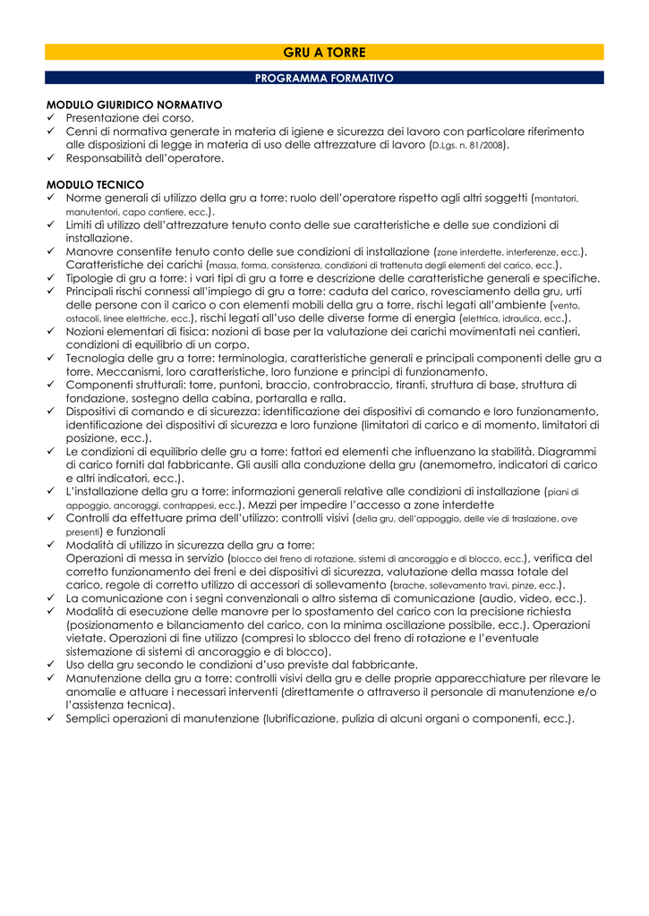 GRU A TORRE PROGRAMMA FORMATIVO MODULO GIURIDICO NORMATIVO Presentazione dei corso. Cenni di normativa generate in materia di igiene e sicurezza dei lavoro con particolare riferimento alle disposizioni di legge in materia di uso delle attrezzature di lavoro (D.Lgs. n. 81/2008). Responsabilità dell’operatore. MODULO TECNICO Norme generali di utilizzo della gru a torre: ruolo dell’operatore rispetto agli altri soggetti (montatori, manutentori, capo cantiere, ecc.). Limiti dì utilizzo dell’attrezzature tenuto conto delle sue caratteristiche e delle sue condizioni di installazione. Manovre consentite tenuto conto delle sue condizioni di installazione (zone interdette, interferenze, ecc.). Caratteristiche dei carichi (massa, forma, consistenza, condizioni di trattenuta degli elementi del carico, ecc.). Tipologie di gru a torre: i vari tipi di gru a torre e descrizione delle caratteristiche generali e specifiche. Principali rischi connessi all’impiego di gru a torre: caduta del carico, rovesciamento della gru, urti delle persone con il carico o con elementi mobili della gru a torre, rischi legati all’ambiente (vento, ostacoli, linee elettriche, ecc.), rischi legati all’uso delle diverse forme di energia (elettrica, idraulica, ecc.). Nozioni elementari di fisica: nozioni di base per la valutazione dei carichi movimentati nei cantieri, condizioni di equilibrio di un corpo. Tecnologia delle gru a torre: terminologia, caratteristiche generali e principali componenti delle gru a torre. Meccanismi, loro caratteristiche, loro funzione e principi di funzionamento. Componenti strutturali: torre, puntoni, braccio, controbraccio, tiranti, struttura di base, struttura di fondazione, sostegno della cabina, portaralla e ralla. Dispositivi di comando e di sicurezza: identificazione dei dispositivi di comando e loro funzionamento, identificazione dei dispositivi di sicurezza e loro funzione (limitatori di carico e di momento, limitatori di posizione, ecc.). Le condizioni di equilibrio delle gru a torre: fattori ed elementi che influenzano la stabilità. Diagrammi di carico forniti dal fabbricante. Gli ausili alla conduzione della gru (anemometro, indicatori di carico e altri indicatori, ecc.). L’installazione della gru a torre: informazioni generali relative alle condizioni di installazione (piani di appoggio, ancoraggi, contrappesi, ecc.). Mezzi per impedire l’accesso a zone interdette Controlli da effettuare prima dell’utilizzo: controlli visivi (della gru, dell’appoggio, delle vie di traslazione, ove presenti) e funzionali Modalità di utilizzo in sicurezza della gru a torre: Operazioni di messa in servizio (blocco del freno di rotazione, sistemi di ancoraggio e di blocco, ecc.), verifica del corretto funzionamento dei freni e dei dispositivi di sicurezza, valutazione della massa totale del carico, regole di corretto utilizzo di accessori di sollevamento (brache, sollevamento travi, pinze, ecc.). La comunicazione con i segni convenzionali o altro sistema di comunicazione (audio, video, ecc.). Modalità di esecuzione delle manovre per lo spostamento del carico con la precisione richiesta (posizionamento e bilanciamento del carico, con la minima oscillazione possibile, ecc.). Operazioni vietate. Operazioni di fine utilizzo (compresi lo sblocco del freno di rotazione e l’eventuale sistemazione di sistemi di ancoraggio e di blocco). Uso della gru secondo le condizioni d’uso previste dal fabbricante. Manutenzione della gru a torre: controlli visivi della gru e delle proprie apparecchiature per rilevare le anomalie e attuare i necessari interventi (direttamente o attraverso il personale di manutenzione e/o l’assistenza tecnica). Semplici operazioni di manutenzione (lubrificazione, pulizia di alcuni organi o componenti, ecc.). MODULO PRATICO (GRU A ROTAZIONE ALTA E BASSA) Individuazione dei componenti strutturali: torre, puntoni, braccio, controbraccio tiranti, struttura di base, struttura di fondazione, sostegno della cabina, portaralla e ralla, vie di traslazione (per gru traslanti). Individuazione dei dispositivi di comando e di sicurezza: identificazione dei dispositivi di comando e loro funzionamento, identificazione dei dispositivi di sicurezza e loro funzione. Controlli pre-utilizzo: controlli visivi e funzionali della gru, dei dispositivi di comando e di sicurezza previsti dal costruttore e dal manuale di istruzioni della gru. Diagrammi di carico. Prove dei dispositivi di ausilio alla conduzione e dei dispositivi di sicurezza (anemometro, indicatori di carico e altri indicatori, limitatori di carico e di momento, dispositivi anti-interferenza, ecc.). Condizioni di installazione (piani di appoggio, ancoraggi, contrappesi, barriere contro l’accesso a zone interdette). Utilizzo della gru a torre; operazioni di messa in servizio (blocco del freno di rotazione, sistemi di ancoraggio e di blocco, ecc.). Verifica del corretto funzionamento dei freni e dei dispositivi di sicurezza. Accesso alla cabina. Valutazione della massa totale del carico. Utilizzo di accessori di sollevamento (brache, sollevamento travi, pinze, ecc.). Esecuzione delle manovre per lo spostamento del carico con la precisione richiesta (posizionamento e bilanciamento del carico, con la minima oscillazione possibile, ecc.). Uso dei comandi posti su pulsantiera pensile. Uso dei comandi posti su unità radio-mobile. Uso accessori d’imbracatura, sollevamento e sgancio dei carichi. Spostamento del carico attraverso ostacoli fissi e aperture, avvicinamento e posizionamento al suolo e su piani rialzati- Arresto della gru sul luogo di lavoro (messa fuori servizio in caso d’interruzione dell’esercizio normale). Controlli giornalieri della gru a torre, prescrizioni operative per la messa fuori servizio e misure precauzionali in caso di avverse condizioni meteorologiche. Operazioni di fine-utilizzo: controlli visivi e funzionali della gru, dei dispositivi di comando e di sicurezza previsti dal costruttore e dal manuale