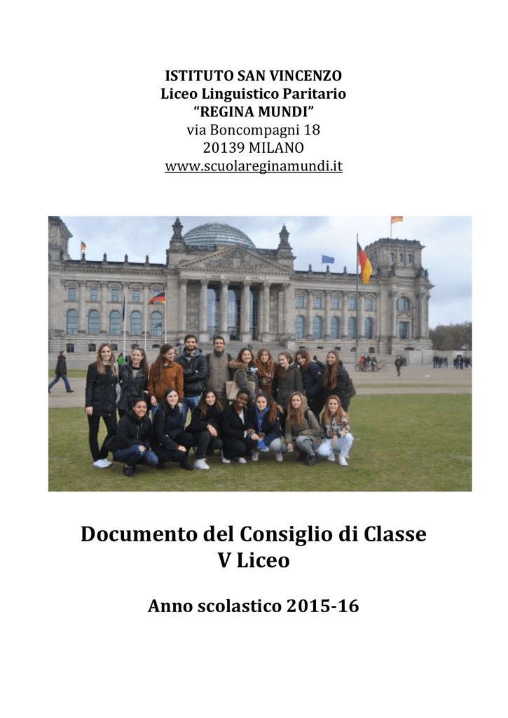 ISTITUTO SAN VINCENZO Liceo Linguistico Paritario “REGINA MUNDI” via Boncompagni 18 20139 MILANO www.scuolareginamundi.it Documento del Consiglio di Classe V Liceo Anno scolastico 2015-16 Istituto San Vincenzo – Scuole Regina Mundi - Liceo Linguistico paritario __________________________________________________________________________________________________________________________________ Indice Contesto culturale - territoriale …………………………………………………………………………… p. 3 Infrastrutture esterne e risorse della scuola…………………………………………………………. p. 3 Situazione della classe ………………………………………………………………………………………… p. 4 Tabella dei crediti………………………………………………………………………………………………...p. 6 Situazione del Consiglio di Classe…………………………………………………………………………..p. 7 Piano di studi – quadro orario del quinquennio …………………………………………………… p. 8 Orario del Liceo Linguistico a. s. 2015-2016………………………………………………............... p. 8 Obiettivi generali del Liceo Linguistico…………………………………………………………………. p. 9 Obiettivi specifici per area…………………………………………………………………………………… p. 9 Il profilo professionale dello studente del Liceo Linguistico…………………………………... p. 11 Attività di arricchimento dell’offerta formativa…………………………………………………….. p. 11 Attività di orientamento svolte nel corso del triennio……………………………………………. p. 15 Modalità di lavoro del Consiglio di Classe…………………………………………………………… p. 15 Mezzi e strumenti utilizzati dal Consiglio di Classe……………………………………………… p. 15 Strumenti di verifica utilizzati dal Consiglio di Classe……………………………………………. p. 16 Griglie di valutazione delle prove scritte e orali:………………………………………………........ p. 16 - Griglia di valutazione della prima prova…………………………………………..................p. 16 - Griglia di valutazione della seconda prova/comprensione………………………….. p. 17 - Griglia di valutazione della terza prova……………………………………………………… p. 18 - Proposta di griglia di valutazione delle prove orali…………………………………….. p. 19 Crediti formativi per l’anno scolastico 2015-2016………………………………………………… p. 20 Tipologia delle prove somministrate durante l’anno……………………………………………... p. 21 Simulazione di Terza Prova dicembre 2015…………………………………………………………. p. 22 Simulazione di Terza Prova maggio 2016……………………………………………………………. p. 31 2 Istituto San Vincenzo – Scuole Regina Mundi - Liceo Linguistico paritario __________________________________________________________________________________________________________________________________ Contesto culturale - territoriale Il Liceo Linguistico Paritario “Regina Mundi” è situato all’interno di un plesso che comprende diversi livelli di scuola, che vanno dall’Asilo Nido al Liceo Linguistico ed all’Istituto Tecnico. L’edificio, ubicato nella periferia sud di Milano, all’interno della Zona 4, raccoglie utenza non solo dai Comuni della cintura sud, ma anche da diverse parti della città. La situazione delle famiglie da cui provengono gli alunni è varia, l’utenza risulta eterogenea sotto tutti i profili. Tuttavia è motivo prioritario del Progetto educativo della scuola l’accoglienza di tutti gli alunni le cui famiglie desiderino seguirne gli orientamenti educativi indipendentemente dalla propria identità culturale e religiosa. Infrastrutture esterne e risorse della scuola Infrastrutture esterne La zona sud di Milano, nella quale è sito l’Istituto San Vincenzo, è collegata con il centro della città e con le stazioni FF.SS. di Rogoredo e Centrale mediante la M3 e gli autobus 84, 93, 95 e 77 che permettono agili spostamenti lungo la circonvallazione esterna, mentre un buon servizio ferroviario è garantito dalla stazione di Rogoredo. La zona è dotata di biblioteche di quartiere, consultori, palestre, oratori, centri d’ascolto. Risorse della scuola Il Liceo Linguistico “Regina Mundi” nasce nell’anno scolastico 1985/1986 e dall’anno scolastico 2002/2003 è riconosciuto Paritario dal Ministero della Pubblica Istruzione. Dall’anno scolastico 2007/2008 la gestione della scuola è passata in capo alla Cooperativa Sociale Maria Consolatrice che si è impegnata a proseguire e valorizzare le linee educative dell’Istituto San Vincenzo, in stretta collaborazione con la Congregazione delle Figlie della Carità. Il Liceo Linguistico Paritario “Regina Mundi” dispone di una palestra dotata di buone attrezzature, spogliatoi e tensostruttura attrezzata secondo le richieste del CONI e di una biblioteca per la consultazione ed il prestito in comodato, attualmente in fase di riallestimento. E’ dotato inoltre di un’aula multimediale, di una videoteca e di aule speciali di fisica, chimica, scienze naturali, corredate di attrezzature inerenti la specializzazione. Da tre anni in ogni classe è stata installata una LIM con PC collegato ed è stato allestito uno spazio con IMAC disponibili per svolgere lavori multimediali con il supporto della tecnologia Apple. Tutti gli studenti possiedono un IPAD a supporto dell’attività didattica. 3 Istituto San Vincenzo – Scuole Regina Mundi - Liceo 