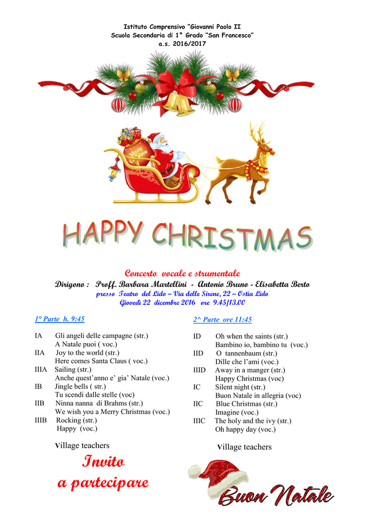 Istituto Comprensivo “Giovanni Paolo II Scuola Secondaria di 1° Grado “San Francesco” a.s. 2016/2017 Concerto vocale e strumentale Dirigono : Proff. Barbara Martellini - Antonio Bruno - Elisabetta Berto presso Teatro del Lido – Via delle Sirene, 22 – Ostia Lido Giovedì 22 dicembre 2016 ore 9.45/13.00 1° Parte h. 9:45 2^ Parte ore 11:45 IA ID IIA IIIA IB IIB IIIB Gli angeli delle campagne (str.) A Natale puoi ( voc.) Joy to the world (str.) Here comes Santa Claus ( voc.) Sailing (str.) Anche quest’anno e’ gia’ Natale (voc.) Jingle bells ( str.) Tu scendi dalle stelle (voc) Ninna nanna di Brahms (str.) We wish you a Merry Christmas (voc.) Rocking (str.) Happy (voc.) Village teachers Invito a partecipare IID IIID IC IIC IIIC Oh when the saints (str.) Bambino io, bambino tu (voc.) O tannenbaum (str.) Dille che l’ami (voc.) Away in a manger (str.) Happy Christmas (voc) Silent night (str.) Buon Natale in allegria (voc) Blue Christmas (str.) Imagine (voc.) The holy and the ivy (str.) Oh happy day (voc.) Village teachers