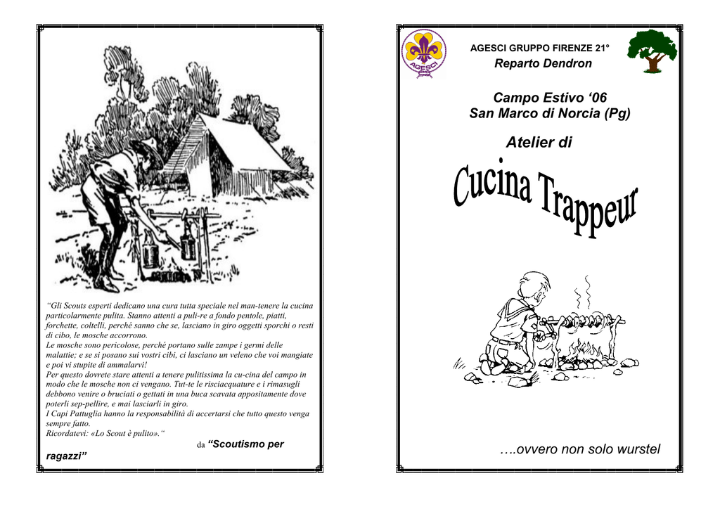 AGESCI GRUPPO FIRENZE 21° Reparto Dendron Campo Estivo ‘06 San Marco di Norcia (Pg) Atelier di “Gli Scouts esperti dedicano una cura tutta speciale nel man-tenere la cucina particolarmente pulita. Stanno attenti a puli-re a fondo pentole, piatti, forchette, coltelli, perché sanno che se, lasciano in giro oggetti sporchi o resti di cibo, le mosche accorrono. Le mosche sono pericolose, perché portano sulle zampe i germi delle malattie; e se si posano sui vostri cibi, ci lasciano un veleno che voi mangiate e poi vi stupite di ammalarvi! Per questo dovrete stare attenti a tenere pulitissima la cu-cina del campo in modo che le mosche non ci vengano. Tut-te le risciacquature e i rimasugli debbono venire o bruciati o gettati in una buca scavata appositamente dove poterli sep-pellire, e mai lasciarli in giro. I Capi Pattuglia hanno la responsabilità di accertarsi che tutto questo venga sempre fatto. Ricordatevi: «Lo Scout è pulito».“ da “Scoutismo per ragazzi” 16 ….ovvero non solo wurstel ...un po’ di storia Pesce al cartoccio I Trappeurs.... All'inizio del 1800 solo pochi bianchi percorrevano le grandi praterie e le montagne dell'ovest americano: erano i trappeurs. Erano uomini solitari che risalivano i corsi dei fiumi vivendo di caccia e di pesca: erano chiamati "mountain men" uomini della montagna e li possiamo catalogare tra i più avventurosi uomini che siano vissuti. Vivevano oltre i confini della civiltà per cacciare, liberi di vagabondare nelle montagne e di bivaccare dove faceva loro più comodo. Solo una volta l'anno scendevano alle stazioni commerciali o ai tradizionali raduni per vendere le pellicce e acuquistare trappole, polvere da sparo, piombo, generi di prima necessità, materiale di scambio per gli indiani e talvolta una camicia nuova. Questi uomini sapevano trarre dalla natura tutto ciò che a loro serviva da vivere. Le loro vesti erano di pelli di cervo con lunghe frange cadenti dalle spalle, dalle maniche, dai calzoni. Il loro berretto era di pelle di castoro o di tasso o di volpe, e calzavano mocassini di pelle che rendevano il loro passo silenzioso come quello dei felini. Dagli indiani acquistavano tabacco, granoturco, legumi, cuoio e coperte di pelli di bisonte, in cambio gli davano un coltello o un'accetta. Queste erano le sole monete che avevano corso presso le tribù dei pellerossa. La cucina trappeur I pionieri del West, i cacciatori di pelli del Canada, gli uomini che vivevano alle frontiere della civiltà sapevano cucinare il loro cibo, senza adoperare pentole e tegami per non essere appesantiti nei loro spostamenti da bagagli ingombranti. Erano chiamati trappeurs e il loro modo di cucinare è detto ancora oggi cucina trappeur. Il primo segreto per cucinare come i trapperus è di utilizzare solo la brace e non la fiamma viva. Occorre quindi alimentare il fuoco con legna grossa e aspettare che si consumi bene, fino a ottenere una buona brace. Il focolare dovrà avere intorno pietre piatte o tronchetti, che facciano da 2 Ingredienti e materiale necessario: Pesce (orata, trota, dentice), funghi secchi, prezzemolo, limone, olio, vino bianco, sale, carta argentata. Preparazione: Pulire e squamare il pesce. Tritare il prezzemolo con i funghi secchi fatti rinvenire in acqua calda e strizzati. Ungere con abbondante olio uno o due fogli di carta argentata, disporvi sopra metà del trito, salare ed adagiare il pesce. Coprirlo col rimanente trito, salare e spruzzare col vino. Chiudere bene il cartoccio. Cuocere sulla brace per 40 minuti. Al cartoccio si possono cucinare anche altri cibi come il cosciotto di pollo. ...e dopo un lauto pasto A fine pranzo è dovere di ogni scout, ripulire la zona nella quale ha operato. La buca del vostro fuoco dovrà essere riempita con la terra o le zolle che avete scavato all' inizio e che avete poi messo da parte. Se avete cucinato alla trappeur spegnete le braci con la tanica dell' acqua o con la vostra borraccia; potete altrimenti aprire le braci e schiacciarle con un ramo verde; poi coprite le braci con la terra e comprimetela bene sopra. Un consiglio, abbiate l' accortezza di verificare l' effettivo spegnimento delle braci e riportate a casa l' alluminio nonchè ogni cosa che prima del vostro arrivo non c'era. Cercate di lasciare il posto migliore di come l' avete trovato. 15 essenzialmente quando si arriva alla fase di cottura; i tempi per cuocere un pollo sono molto labili. Può capitare di mangiare polli di tutti i tipi: fuori ben cotti e croccanti, dentro crudi al massimo, o viceversa stracotti dentro ma con la pelle cruda. Il pollo comunque richiede molto più tempo di qualsiasi altro cibo cotto alla trapper. Secondo me ci vogliono due elementi per cuocere bene un pollo: una buona dose di fortuna e il saper stimare perfettamente i tempi di cottura, oltre a verificare ogni 20 minuti lo stato del volatile. … prepariamo le braci Nella pratica, dopo aver pulito il pollo, spennatolo e tolto le interiora (magari potete anche aromatizzarlo con qualche ripieno alle erbe), date un' occhiata ai disegni sottostanti che vi illustrano alcuni dei migliori modi per cuocere un pollo. Per produrre le braci adatte alla cucina trapper è necessario accendere un fuoco, avendo l'accortezza di scegliere particolari tipi di essenze. Solitamente il pino, la quercia o il carpino sono quelle più indicate per la cucina trapper in quanto la loro combustione produce un' ottima brace; scegliete l' essenza non tanto quanto per la sua velocità di combustione ma quanto per la qualità del carbone prodotto. I vostri cibi impiegheranno un tot di tempo per cuocere per cui è sempre meglio abbondare con le braci; quando il vostro fuoco sarà acceso caricatelo abbondantemente (ma senza esagerare) con la legna e A) il “girarrosto” B) appeso C) pianta per terra un paletto di legno verde, infilaci un barattolo di latta di lamiera non saldata e sopra il pollo. Attorno accedi il fuoco. lasciatela bruciare tranquillamente. ... realizziamo gli uten