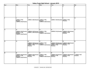 Valley Forge High School - January 2015 Sun 4 Mon 5 Tue Wed 6 7 Thur Fri Sat 1 2 3 8 9 10 4:00PM C V TRA 3:00PM C V SW (Practice) 4:00PM C V TRA 3:00PM C V SW (Practice) 4:00PM C V TRA (Practice) (Practice) (Practice) 7:00PM G V SB (Practice) 7:00PM G V SB (Practice) 11 12 13 14 15 16 17 3:00PM B V FB (Practice) 3:00PM B V FB (Practice) 4:00PM C V TRA 3:00PM B V FB (Practice) 3:00PM B V FB (Practice) 4:00PM C V TRA 3:00PM C V SW (Practice) (Practice) 4:00PM C V TRA (Practice) 7:00PM G V SB (Practice) (Practice) 7:00PM G V SB (Practice) 18 25 19 26 20 21 22 23 3:00PM B V FB (Practice) 4:00PM C V TRA 3:00PM C V SW (Practice) (Practice) 4:00PM C V TRA 7:00PM G V SB (Practice) (Practice) 3:00PM B V FB (Practice) 3:00PM B V FB (Practice) 3:00PM C V SW (Practice) 4:00PM C V TRA 4:00PM C V TRA (Practice) (Practice) 27 29 28 30 24 31 3:00PM B V FB (Practice) 3:00PM B V FB (Practice) 4:00PM C V TRA 3:00PM B V FB (Practice) 3:00PM B V FB (Practice) 11:00AM G V SB 4:00PM C V TRA 4:00PM C V TRA (Practice) 4:00PM C V TRA 4:00PM C V TRA (Practice) (Practice) (Practice) 7:00PM G V SB (Practice) (Practice) (Practice) 7:00PM G V SB (Practice) 01/02/2015 Schedule Star 800-822-9433 Valley Forge High School - February 2015 Sun Mon Tue Wed Thur Fri Sat 1 2 3 4 5 6 7 8 15 3:00PM B V FB (Practice) 3:00PM B V FB (Practice) 4:00PM C V TRA 4:00PM C V TRA 4:00PM C V TRA (Practice) (Practice) (Practice) 7:00PM G V SB (Practice) 7:00PM G V SB (Practice) 3:00PM B V FB (Practice) 3:00PM B V FB (Practice) 4:00PM C V TRA 4:00PM C V TRA (Practice) (Practice) 7:00PM G V SB (Practice) 9 12 10 11 13 3:00PM B V FB (Practice) 3:00PM B V FB (Practice) 4:00PM C V TRA 4:00PM C V TRA 4:00PM C V TRA (Practice) (Practice) (Practice) 7:00PM G V SB (Practice) 7:00PM G V SB (Practice) 3:00PM B V FB (Practice) 3:00PM B V FB (Practice) 4:00PM C V TRA 4:00PM C V TRA (Practice) (Practice) 7:00PM G V SB (Practice) 16 19 17 18 20 14 21 3:00PM B V FB (Practice) 4:00PM C V TRA 3:00PM B V FB (Practice) 3:00PM B V FB (Practice) 4:00PM C V TRA (Practice) 4:00PM C V TRA 4:00PM C V TRA (Practice) 7:00PM G V SB (Practice) (Practice) (Practice) 7:00PM G V SB (Practice) 22 23 24 25 3:00PM B V FB (Practice) 3:00PM B V FB (Practice) 4:00PM C V TRA 4:00PM C V TRA 4:00PM C V TRA (Practice) (Practice) (Practice) 7:00PM G V SB (Practice) 7:00PM G V SB (Practice) 01/02/2015 26 27 3:00PM B V FB (Practice) 3:00PM B V FB (Practice) 4:00PM C V TRA 4:00PM C V TRA (Practice) (Practice) 7:00PM G V SB (Practice) Schedule Star 800-822-9433 28