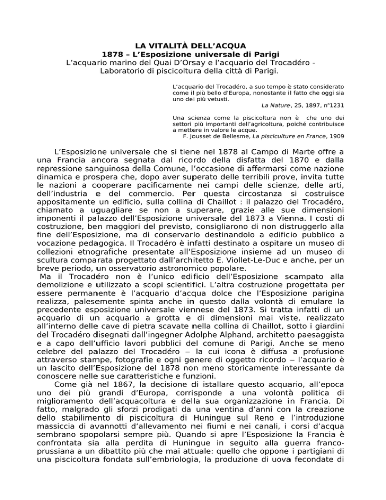 LA VITALITÀ DELL’ACQUA 1878 – L’Esposizione universale di Parigi L’acquario marino del Quai D’Orsay e l’acquario del Trocadéro Laboratorio di piscicoltura della città di Parigi. L’acquario del Trocadéro, a suo tempo è stato considerato come il più bello d’Europa, nonostante il fatto che oggi sia uno dei più vetusti. La Nature, 25, 1897, no1231 Una scienza come la piscicoltura non è che uno dei settori più importanti dell’agricoltura, poiché contribuisce a mettere in valore le acque. F. Jousset de Bellesme, La pisciculture en France, 1909 L’Esposizione universale che si tiene nel 1878 al Campo di Marte offre a una Francia ancora segnata dal ricordo della disfatta del 1870 e dalla repressione sanguinosa della Comune, l’occasione di affermarsi come nazione dinamica e prospera che, dopo aver superato delle terribili prove, invita tutte le nazioni a cooperare pacificamente nei campi delle scienze, delle arti, dell’industria e del commercio. Per questa circostanza si costruisce appositamente un edificio, sulla collina di Chaillot : il palazzo del Trocadéro, chiamato a uguagliare se non a superare, grazie alle sue dimensioni imponenti il palazzo dell’Esposizione universale del 1873 a Vienna. I costi di costruzione, ben maggiori del previsto, consigliarono di non distruggerlo alla fine dell’Esposizione, ma di conservarlo destinandolo a edificio pubblico a vocazione pedagogica. Il Trocadéro è infatti destinato a ospitare un museo di collezioni etnografiche presentate all’Esposizione insieme ad un museo di scultura comparata progettato dall’architetto E. Viollet-Le-Duc e anche, per un breve periodo, un osservatorio astronomico popolare. Ma il Trocadéro non è l’unico edificio dell’Esposizione scampato alla demolizione e utilizzato a scopi scientifici. L’altra costruzione progettata per essere permanente è l’acquario d’acqua dolce che l’Esposizione parigina realizza, palesemente spinta anche in questo dalla volontà di emulare la precedente esposizione universale viennese del 1873. Si tratta infatti di un acquario di un acquario a grotta e di dimensioni mai viste, realizzato all’interno delle cave di pietra scavate nella collina di Chaillot, sotto i giardini del Trocadéro disegnati dall’ingegner Adolphe Alphand, architetto paesaggista e a capo dell’ufficio lavori pubblici del comune di Parigi. Anche se meno celebre del palazzo del Trocadéro ‒ la cui icona è diffusa a profusione attraverso stampe, fotografie e ogni genere di oggetto ricordo ‒ l’acquario è un lascito dell’Esposizione del 1878 non meno storicamente interessante da conoscere nelle sue caratteristiche e funzioni. Come già nel 1867, la decisione di istallare questo acquario, all’epoca uno dei più grandi d’Europa, corrisponde a una volontà politica di miglioramento dell’acquacoltura e della sua organizzazione in Francia. Di fatto, malgrado gli sforzi prodigati da una ventina d’anni con la creazione dello stabilimento di piscicoltura di Huningue sul Reno e l’introduzione massiccia di avannotti d’allevamento nei fiumi e nei canali, i corsi d’acqua sembrano spopolarsi sempre più. Quando si apre l’Esposizione la Francia è confrontata sia alla perdita di Huningue in seguito alla guerra francoprussiana a un dibattito più che mai attuale: quello che oppone i partigiani di una piscicoltura fondata sull’embriologia, la produzione di uova fecondate di 2 pesce e l’immissione a tappeto di avannotti, e coloro che invece si dedicano allo studio minuzioso delle specifiche condizioni di vita delle singole specie nei loro rispettivi ambienti naturali: Certe persone pensano che se questi animali sono scomparsi dai nostri corsi d’acqua in modo così disastroso è perché non vi trovavano più le condizioni necessarie per il loro sviluppo, sarebbe sufficiente restituire loro queste ultime perché l’abbondanza si sostituisse alla penuria. Altri viceversa ne attribuiscono la colpa all’attività devastatrice dell’uomo, credendo che le condizioni biologiche siano sufficienti e che non si debba fare altro che lasciar prolificare degli esseri viventi. È quest’ultimo modo di vedere che ha ispirato i tentativi di ripopolamento attraverso quella fecondazione artificiale, che viene spesso considerata, a torto, come il fattore costitutivo dell’acquacoltura (Léon Vaillant, Exposition universelle de 1878 à Paris. Les poissons, crustacés et mollusques, Imprimérie Nationale, Paris, 1889, p. 17). Cosciente del ruolo primordiale della pesca e dell’acquacoltura nell’approvvigionamento dei grandi agglomerati industriali, il senatore JeanBaptiste Sébastien Krantz, commissario generale dell’Esposizione del 1878, prende personalmente la decisione di far costruire un acquario permanente per l’allestimento dello stand della classe di prodotti n o 84 intitolata «Piscicoltura e ostricoltura». Il comitato organizzatore dell’esposizione di questa classe di prodotti, posta sotto la responsabilità di un rappresentante del ministero della Marina, riunisce lo zoologo del Muséum d’histoire naturelle di Parigi Emile Blanchard, il segretario del Collège de France Germain Bouchon-Brandély, il naturalista Herny de la Blanchère e il piscicoltore parigino Pierre Carbonnier. L’aspirazione a promuovere la piscicoltura non è nuova: come si è visto, già in occasione dell’Esposizione universale di Venna del 1873, il ministero della Pubblica istruzione aveva dato incarico al naturalista Germain BouchonBrandély di svolgere un’inchiesta sugli stabilimenti della piscicoltura in Francia e nei paesi vicini, apparsa nel 1876 con il titolo di Traité de pisciculture et d’acquaculture e con una prestigiosa prefazione dell’ingegnere e economista sansimoniano Michel Chevalier, già presidente della giuria dell’Esposizione universale del 1867: […] Sono stato costretto a riconoscere – scriveva BouchonBrandely nel 1877 al commissario generale Krantz – che 
