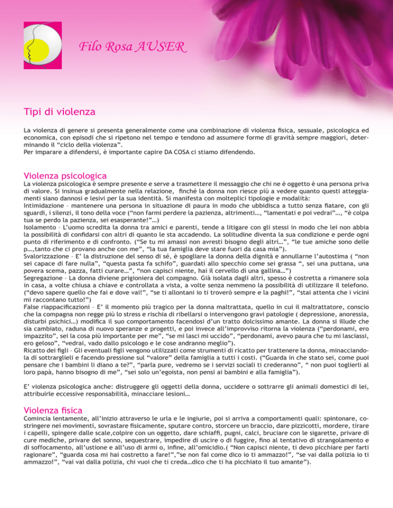 Filo Rosa AUSER Tipi di violenza La violenza di genere si presenta generalmente come una combinazione di violenza fisica, sessuale, psicologica ed economica, con episodi che si ripetono nel tempo e tendono ad assumere forme di gravità sempre maggiori, determinando il “ciclo della violenza”. Per imparare a difendersi, è importante capire DA COSA ci stiamo difendendo. Violenza psicologica La violenza psicologica è sempre presente e serve a trasmettere il messaggio che chi ne è oggetto è una persona priva di valore. Si insinua gradualmente nella relazione, finché la donna non riesce più a vedere quanto questi atteggiamenti siano dannosi e lesivi per la sua identità. Si manifesta con molteplici tipologie e modalità: Intimidazione – mantenere una persona in situazione di paura in modo che ubbidisca a tutto senza fiatare, con gli sguardi, i silenzi, il tono della voce (“non farmi perdere la pazienza, altrimenti…, “lamentati e poi vedrai”…, “è colpa tua se perdo la pazienza, sei esasperante!”…) Isolamento – L’uomo scredita la donna tra amici e parenti, tende a litigare con gli stessi in modo che lei non abbia la possibilità di confidarsi con altri di quanto le sta accadendo. La solitudine diventa la sua condizione e perde ogni punto di riferimento e di confronto. (“Se tu mi amassi non avresti bisogno degli altri…”, “le tue amiche sono delle p…,tanto che ci provano anche con me”, “la tua famiglia deve stare fuori da casa mia”). Svalorizzazione – E’ la distruzione del senso di sé, è spogliare la donna della dignità e annullarne l’autostima ( “non sei capace di fare nulla”, “questa pasta fa schifo”, guardati allo specchio come sei grassa “, sei una puttana, una povera scema, pazza, fatti curare…”, “non capisci niente, hai il cervello di una gallina…”) Segregazione – La donna diviene prigioniera del compagno. Già isolata dagli altri, spesso è costretta a rimanere sola in casa, a volte chiusa a chiave e controllata a vista, a volte senza nemmeno la possibilità di utilizzare il telefono. (“devo sapere quello che fai e dove vai!”, “se ti allontani io ti troverò sempre e la paghi!”, “stai attenta che i vicini mi raccontano tutto!”) False riappacificazioni – E’ il momento più tragico per la donna maltrattata, quello in cui il maltrattatore, conscio che la compagna non regge più lo stress e rischia di ribellarsi o intervengono gravi patologie ( depressione, anoressia, disturbi psichici…) modifica il suo comportamento facendosi d’un tratto dolcissimo amante. La donna si illude che sia cambiato, raduna di nuovo speranze e progetti, e poi invece all’improvviso ritorna la violenza (“perdonami, ero impazzito”, sei la cosa più importante per me”, “se mi lasci mi uccido”, “perdonami, avevo paura che tu mi lasciassi, ero geloso”, “vedrai, vado dallo psicologo e le cose andranno meglio”). Ricatto dei figli – Gli eventuali figli vengono utilizzati come strumenti di ricatto per trattenere la donna, minacciandola di sottrarglieli e facendo pressione sul “valore” della famiglia a tutti i costi. (“Guarda in che stato sei, come puoi pensare che i bambini li diano a te?”, “parla pure, vedremo se i servizi sociali ti crederanno”, “ non puoi toglierli al loro papà, hanno bisogno di me”, “sei solo un’egoista, non pensi ai bambini e alla famiglia”). E’ violenza psicologica anche: distruggere gli oggetti della donna, uccidere o sottrarre gli animali domestici di lei, attribuirle eccessive responsabilità, minacciare lesioni… Violenza fisica Comincia lentamente, all’inizio attraverso le urla e le ingiurie, poi si arriva a comportamenti quali: spintonare, costringere nei movimenti, sovrastare fisicamente, sputare contro, storcere un braccio, dare pizzicotti, mordere, tirare i capelli, spingere dalle scale,colpire con un oggetto, dare schiaffi, pugni, calci, bruciare con le sigarette, privare di cure mediche, privare del sonno, sequestrare, impedire di uscire o di fuggire, fino al tentativo di strangolamento e di soffocamento, all’ustione e all’uso di armi o, infine, all’omicidio.( “Non capisci niente, ti devo picchiare per farti ragionare”, “guarda cosa mi hai costretto a fare!”,”se non fai come dico io ti ammazzo!”, “se vai dalla polizia io ti ammazzo!”, “vai vai dalla polizia, chi vuoi che ti creda…dico che ti ha picchiato il tuo amante”).   Filo Rosa AUSER Violenza economica E’ ogni forma di privazione e controllo che limiti l’accesso all’indipendenza economica di una persona. Vi sono inclusi comportamenti quali: vietare alla donna di svolgere un lavoro o un percorso formativo, sfruttarla come forza lavoro, limitarla o privarla del denaro per le spese domestiche,controllare gli scontrini della spesa e perquisire la borsa,escluderla dalle decisioni relative al bilancio familiare, impedirle le informazioni relative al conto corrente, alla situazione patrimoniale e al reddito del partner, costringerla a fare debiti, a volta costringerla a firmare documenti o a intraprendere iniziative economiche illecite, rifiutarsi di pagare un adeguato assegno di mantenimento o costringerla a umilianti trattative per averlo. Violenza sessuale Ogni imposizione di pratiche sessuali non desiderate. Vi sono compresi comportamenti quali: la coercizione alla sessualità, essere insultata, umiliata o brutalizzata durante un rapporto sessuale, la costrizione ad avere rapporti sessuali con altri, l’imposizione a guardare e ripetere scene pornografiche, imporre gravidanze, costringere a prostituirsi fino al tentato stupro e allo stupro. Comportamento persecutorio (stalking) E’ una serie di comportamenti di persecuzione protratti nel tempo messi in atto quando la donna cerca di allontanarsi da una relazione violenta e atti a danneggiare la vittima e a farla sentire costantemente in uno stato di paura e pericolo. Il maltrattatore perseguita la ex seguendola