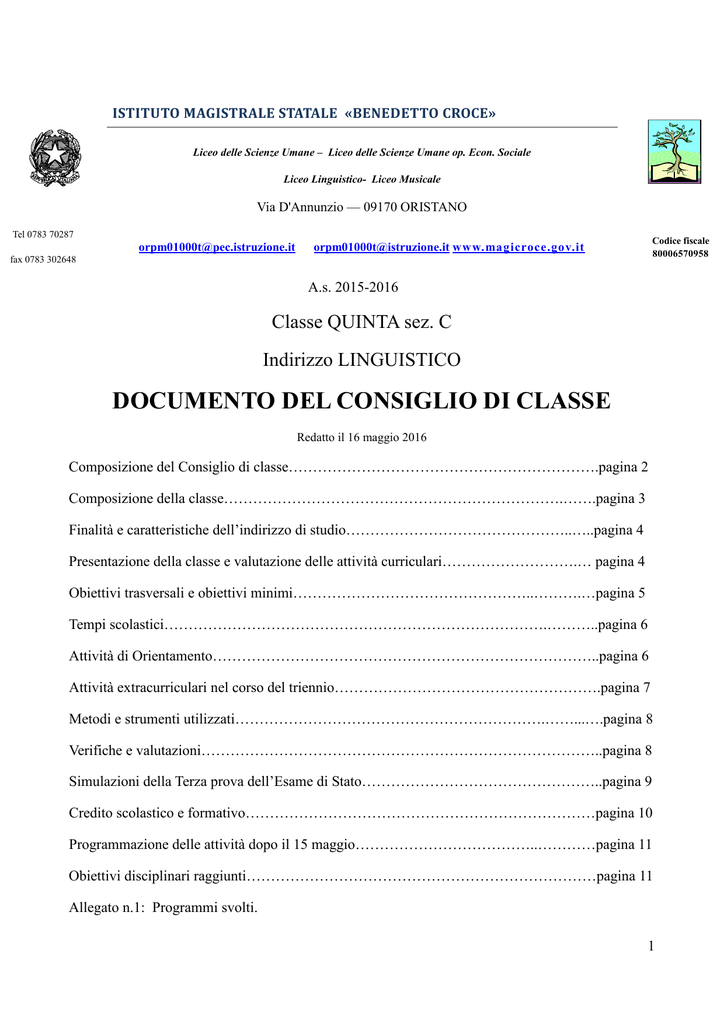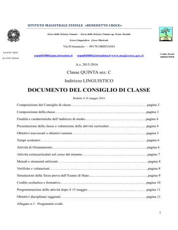 ISTITUTO MAGISTRALE STATALE «BENEDETTO CROCE» Liceo delle Scienze Umane – Liceo delle Scienze Umane op. Econ. Sociale Liceo Linguistico- Liceo Musicale Via D'Annunzio — 09170 ORISTANO Tel 0783 70287 [email protected] Codice fiscale 80006570958 [email protected] www.magicroce.gov.it fax 0783 302648 A.s. 2015-2016 Classe QUINTA sez. C Indirizzo LINGUISTICO DOCUMENTO DEL CONSIGLIO DI CLASSE Redatto il 16 maggio 2016 Composizione del Consiglio di classe……………………………………………………….pagina 2 Composizione della classe…………………………………………………………….…….pagina 3 Finalità e caratteristiche dell’indirizzo di studio………………………………………..…..pagina 4 Presentazione della classe e valutazione delle attività curriculari……………………….… pagina 4 Obiettivi trasversali e obiettivi minimi…………………………………………..……….…pagina 5 Tempi scolastici…………………………………………………………………….………..pagina 6 Attività di Orientamento……………………………………………………………………..pagina 6 Attività extracurriculari nel corso del triennio……………………………………………….pagina 7 Metodi e strumenti utilizzati……………………………………………………….……...….pagina 8 Verifiche e valutazioni………………………………………………………………………..pagina 8 Simulazioni della Terza prova dell’Esame di Stato…………………………………………..pagina 9 Credito scolastico e formativo………………………………………………………………pagina 10 Programmazione delle attività dopo il 15 maggio………………………………..…………pagina 11 Obiettivi disciplinari raggiunti………………………………………………………………pagina 11 Allegato n.1: Programmi svolti. 1 COMPOSIZIONE DEL CONSIGLIO DI CLASSE Continuità didattica Materia Docente I II III IV RELIGIONE Stefano Mele * * * * ITALIANO Eliana Tuveri INGLESE Antonello Pitzalis FRANCESE Stefania Muscas TEDESCO Tonina Uccheddu SOSTEGNO Monika Havasi STORIA Franca Mugittu FILOSOFIA Francesca Concu MATEMATICA Katiusha Monica Piras FISICA Roberto Muzzetto STORIA DELL’ARTE Luigi Santus SCIENZE NATURALI Anna Maria Onorato EDUCAZIONE FISICA Salvatore Melis CONVERSAZIONE D’INGLESE Margaret Ann Platt CONVERSAZIONE DI FRANCESE CONVERSAZIONE DI TEDESCO * * * * * * * * * * * * * * * * * Salvatorica Falchi * * * * Rachele Perria * * * * 2 2 COMPOSIZIONE DELLA CLASSE 1 ARDU FEDERICA Con questa classe dalla I 2 CADDEO MELISSA Con questa classe dalla III 3 CADEDDU MICHAELA Con questa classe dalla II 4 CAREDDU SIRIA Con questa classe dalla I 5 CASCIU SABRINA Con questa classe dalla I 6 COMINA JESSICA Con questa classe dalla I 7 CONTU CHIARA Con questa classe dalla I 8 DESSI DALILA Con questa classe dalla I 9 LITTERA VANESSA Con questa classe dalla II 10 MANCA ANTONELLA Con questa classe dalla II 11 MARONGIU CHIARA Con questa classe dalla V 12 MELIS ARIANNA Con questa classe dalla I 13 MURA MONICA Con questa classe dalla II 14 ORRU ALESSIA Con questa classe dalla I 15 PERRIA CRISTIANA Con questa classe dalla I 16 PINNA MARTA Con questa classe dalla I 17 PIRAS CLAUDIA Con questa classe dalla I 18 SARAIS GIORGIA Con questa classe dalla I 19 SERRA FEDERICA Con questa classe dalla I 20 SERRA SERENA Con questa classe dalla I 21 SINI ALESSIA Con questa classe dalla I 22 SPANU FEDERICA Con questa classe dalla I 3 3 FINALITÀ E CARATTERISTICHE DELL’INDIRIZZO LINGUISTICO -L’indirizzo linguistico è caratterizzato dall’insegnamento di tre lingue straniere, finalizzato sia all’acquisizione di competenze linguistiche e comunicative che all’incontro con patrimoni di Storia, Letteratura e Civiltà. -La caratterizzazione di questo corso di studi non è data soltanto dalle lingue straniere, ma anche dal rinvio ad una continua comparazione analogica, contrastiva e storica con l’Italiano e il Latino. Il confronto con queste ultime lingue, in particolare, consente una migliore analisi delle lingue moderne nella loro struttura, una viva sensibilizzazione alla loro storicità, quindi la consapevolezza della loro continua evoluzione. Un’ampia dimensione formativa deriva anche da tutte le altre discipline che fanno capo alle tre aree fondamentali: linguistico – letterario – artistica, storico – filosofica, matematicoscientifica. -Gli studenti, a conclusione del percorso di studio, oltre a raggiungere i risultati di apprendimento comuni: -saranno in grado di affrontare in lingua diversa dall'italiano specifici contenuti disciplinari; -conosceranno le principali caratteristiche culturali dei paesi di cui si è studiata la lingua, attraverso lo studio e l'approfondimento di opere letterarie, estetiche, visive, musicali, cinematografiche, delle linee fondamentali della loro storia e delle loro tradizioni; -si sapranno confrontare con la cultura degli altri popoli, avvalendosi delle occasioni di contatto e di scambio. BREVE PRESENTAZIONE DELLA CLASSE La classe V C linguistico è formata da 22 alunne, tutte provenienti dalla IV C linguistico tranne l'alunna CHIARA MARONGIU che proviene dalla classe V C Linguistico dello scorso anno. L’iter formativo della classe è stato abbastanza regolare nell’arco del quinquennio, anche se la classe ha subito alcune integrazioni. Discreti progressi nella condotta e nell’impegno hanno consentito a tutte le alunne, seppure in modo diversificato, di conseguire le finalità e gli obiettivi prefissati. Non tutte le alunne si sono impegnate e dimostrate disponibili e interessate al dialogo educativo e al conseguimento di adeguate competenze e conoscenze per affrontare proficuamente le prove di esame. Le alunne manifestano infatti una certa eterogeneità nel profitto: alcune si sono distinte pe