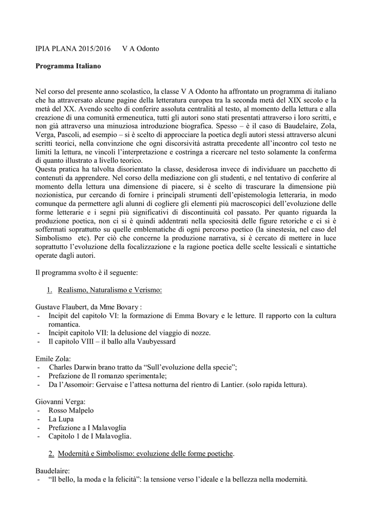 IPIA PLANA 2015/2016 V A Odonto Programma Italiano Nel corso del presente anno scolastico, la classe V A Odonto ha affrontato un programma di italiano che ha attraversato alcune pagine della letteratura europea tra la seconda metà del XIX secolo e la metà del XX. Avendo scelto di conferire assoluta centralità al testo, al momento della lettura e alla creazione di una comunità ermeneutica, tutti gli autori sono stati presentati attraverso i loro scritti, e non già attraverso una minuziosa introduzione biografica. Spesso – è il caso di Baudelaire, Zola, Verga, Pascoli, ad esempio – si è scelto di approcciare la poetica degli autori stessi attraverso alcuni scritti teorici, nella convinzione che ogni discorsività astratta precedente all’incontro col testo ne limiti la lettura, ne vincoli l’interpretazione e costringa a ricercare nel testo solamente la conferma di quanto illustrato a livello teorico. Questa pratica ha talvolta disorientato la classe, desiderosa invece di individuare un pacchetto di contenuti da apprendere. Nel corso della mediazione con gli studenti, e nel tentativo di conferire al momento della lettura una dimensione di piacere, si è scelto di trascurare la dimensione più nozionistica, pur cercando di fornire i principali strumenti dell’epistemologia letteraria, in modo comunque da permettere agli alunni di cogliere gli elementi più macroscopici dell’evoluzione delle forme letterarie e i segni più significativi di discontinuità col passato. Per quanto riguarda la produzione poetica, non ci si è quindi addentrati nella speciosità delle figure retoriche e ci si è soffermati soprattutto su quelle emblematiche di ogni percorso poetico (la sinestesia, nel caso del Simbolismo etc). Per ciò che concerne la produzione narrativa, si è cercato di mettere in luce soprattutto l’evoluzione della focalizzazione e la ragione poetica delle scelte lessicali e sintattiche operate dagli autori. Il programma svolto è il seguente: 1. Realismo, Naturalismo e Verismo: Gustave Flaubert, da Mme Bovary : - Incipit del capitolo VI: la formazione di Emma Bovary e le letture. Il rapporto con la cultura romantica. - Incipit capitolo VII: la delusione del viaggio di nozze. - Il capitolo VIII – il ballo alla Vaubyessard Emile Zola: - Charles Darwin brano tratto da “Sull’evoluzione della specie”; - Prefazione de Il romanzo sperimentale; - Da l’Assomoir: Gervaise e l’attesa notturna del rientro di Lantier. (solo rapida lettura). Giovanni Verga: - Rosso Malpelo - La Lupa - Prefazione a I Malavoglia - Capitolo 1 de I Malavoglia. 2. Modernità e Simbolismo: evoluzione delle forme poetiche. Baudelaire: - “Il bello, la moda e la felicità”: la tensione verso l’ideale e la bellezza nella modernità. - Da I fiori del male: “Corrispondenze” “Albatro” “A una passante” Paul Verlaine: - Da Jadis et Naguère, “L’arte poetica” Arthur Rimbaud: - Alba - Il dormiente nella Valle 3. Giovanni Pascoli - “Il fanciullino” - da Myricae: - X agosto - Temporale - Novembre 4. Gabriele D’Annunzio: - Da Il Piacere, Andrea Sperelli, eroe dell’estetismo. Da Alcyone, La pioggia del pineto. 5. La crisi dell’io e delle certezze cartesiane nella narrativa italiana del primo Novecento James Joyce: da l’ Ulisse “Il monologo di Molly” (solo rapida lettura) Italo Svevo: - da La coscienza di Zeno: - Lo schiaffo del padre - La proposta di matrimonio - Lo scambio di funerale - La vita è una malattia (lettura affidata agli studenti). Luigi Pirandello: - “Il treno ha fischiato” - “La patente” - Da Il fu Mattia Pascal: - Adriano Meis e la sua ombra - Pascal porta i fiori alla propria tomba 6. Giuseppe Ungaretti: da Allegria: - In Memoria - San martino del Carso - Veglia - Soldati - Natale 7: Eugenio Montale: - Da Ossi di seppia: - “I Limoni” - “Meriggiare pallido e assorto” - “Spesso il male di vivere ho incontrato” Da Xenia - Satura - “Ho sceso, dandoti il braccio” 8. L’Einaudi a Torino nel secondo dopo guerra Natalia Ginsburg Lessico familiare Storia V A Odonto: Nel corso dell anno scolastico la classe ha affrontato il programma dell ultimo anno partendo non già dal primo Novecento bensì dalla seconda metà dell Ottocento, per arrivare ad affrontare molto superficialmente (attraverso un percorso tematico sui muri) la seconda metà del secolo attraverso due direttrici: la decolonizzazione e la guerra fredda. In considerazione di alcune lacune concettuali riscontrate all inizio dell anno si è molto insistito, nello svolgimento del programma, sulla dimensione terminologica e concettuale (in linea con una didattica della storia più orientata alla world history e allo studio di tematiche trasversali). Contestualmente nel corso dell anno si è cercato di esplicitare alcuni meccanismi propri della ricerca storica in quest ottica abbiamo analizzato diverse tipologie di fonti storiche e ne abbiamo sperimentato l esercizio della schedatura e dell analisi Al contempo si è scelto, in conseguenza agli attentati di Parigi del novembre 2015, di dare ampio spazio con un lavoro cooperativo e di ricerca a gruppi all approfondimento dell accaduto Il lavoro di ricerca ha toccato diversi campi d indagine dalla ricostruzione della storia dell area mediorientale alla storicizzazione del conflitto tra sciiti e sunniti, alla ricostruzione cronologica del conflitto in Siria, alle questioni legate al profilo dei foreing fighters e infine agli stereotipi legati all Islam Purtroppo il lavoro nato sull onda di un primigenio interesse degli studenti e orientato a dar risposta ai loro interrogativi, ha visto tramontare l entusiasmo iniziale L esito di questo lavoro cui si è scelto di dedicare quasi un mese di lavoro non è stato all altezza dell investimento 1. L Italia post-unitaria: - L età della destra storica (la situazione socio-economica, le principali riforme); - La sinistra storica; - Età di Crispi; 2. La seconda Rivoluzione industriale; 3. L Età delle