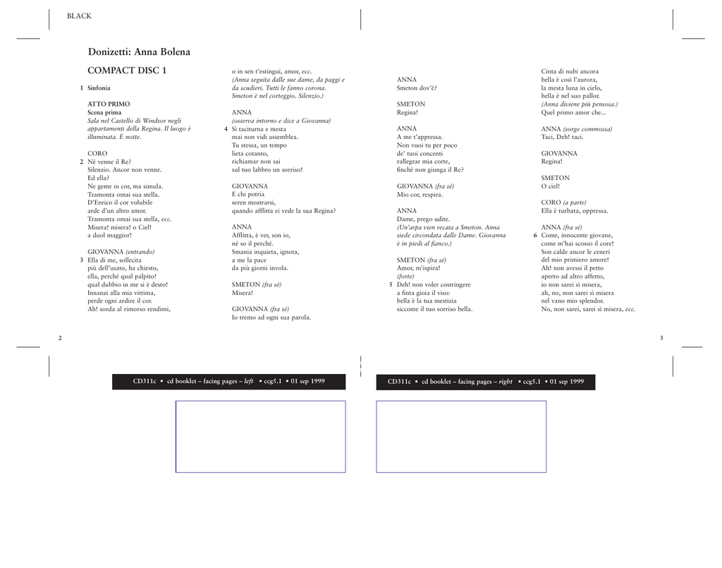 BLACK Donizetti: Anna Bolena COMPACT DISC 1 1 Sinfonia ATTO PRIMO Scena prima Sala nel Castello di Windsor negli appartamenti della Regina. Il luogo è illuminata. È notte. CORO 2 Né venne il Re? Silenzio. Ancor non venne. Ed ella? Ne geme in cor, ma simula. Tramonta omai sua stella. D’Enrico il cor volubile arde d’un altro amor. Tramonta omai sua stella, ecc. Misera! misera! o Ciel! a duol maggior! GIOVANNA (entrando) 3 Ella di me, sollecita più dell’usato, ha chiesto, ella, perché qual palpito! qual dubbio in me si è desto! Innanzi alla mia vittima, perde ogni ardire il cor. Ah! sorda al rimorso rendimi, o in sen t’estingui, amor, ecc. (Anna seguita dalle sue dame, da paggi e da scudieri. Tutti le fanno corona. Smeton è nel corteggio. Silenzio.) ANNA (osserva intorno e dice a Giovanna) 4 Sì taciturna e mesta mai non vidi assemblea. Tu stessa, un tempo lieta cotanto, richiamar non sai sul tuo labbro un sorriso! GIOVANNA E chi potria seren mostrarsi, quando afflitta ei vede la sua Regina? ANNA Afflitta, è ver, son io, né so il perché. Smania inquieta, ignota, a me la pace da più giorni invola. SMETON (fra sé) Misera! GIOVANNA (fra sé) Io tremo ad ogni sua parola. ANNA Smeton dov’è? SMETON Regina! ANNA A me t’appressa. Non vuoi tu per poco de’ tuoi concenti rallegrar mia corte, finché non giunga il Re? GIOVANNA (fra sé) Mio cor, respira. ANNA Dame, prego udite. (Un’arpa vien recata a Smeton. Anna siede circondata dalle Dame. Giovanna è in piedi al fianco.) SMETON (fra sé) Amor, m’ispira! (forte) 5 Deh! non voler costringere a finta gioia il viso: bella è la tua mestizia siccome il tuo sorriso bella. Cinta di nubi ancora bella è così l’aurora, la mesta luna in cielo, bella è nel suo pallor. (Anna diviene più pensosa.) Quel primo amor che... ANNA (sorge commossa) Taci, Deh! taci. GIOVANNA Regina! SMETON O ciel! CORO (a parte) Ella è turbata, oppressa. ANNA (fra sé) 6 Come, innocente giovane, come m’hai scosso il core! Son calde ancor le ceneri del mio primiero amore! Ah! non avessi il petto aperto ad altro affetto, io non sarei sì misera, ah, no, non sarei sì misera nel vano mio splendor. No, non sarei, sarei sì misera, ecc. 3 2 CD311c • cd booklet – facing pages – left • ccg5.1 • 01 sep 1999 CD311c • cd booklet – facing pages – right • ccg5.1 • 01 sep 1999 BLACK (scuotendosi, agli astanti) Ma poche omai rimangono ore di notte, io credo. GIOVANNA L’alba è vicina a sorgere. ANNA Signori, io vi congedo. È vana speme attendere, che omai più giunga il Re. Andiam, Seymour. (Si appoggia a Giovanna.) GIOVANNA Che v’agita? ANNA 7 Legger potessi in me! Non v’ha sguardo cui sia dato penetrar nel mesto core; mi condanna crudo fato, solitaria, a sospirar. Ah! se mai di regio soglio ti seduce lo splendore, ti rammenta il mio cordoglio, non lasciarti, non lasciarti lusingar. SMETON e GIOVANNA (fra sé) Non ardisco favellar. CORO (a parte) Qualche istante di riposo possa il sonno a lei recar. (Anna parte accompagnata da Giovanna e dalle ancelle. A poco a poco la scena si sgombra, e non rimane dei lumi che una gran lampada che rischiara la galleria.) GIOVANNA 8 O! qual parlar fu il suo! Come il cor mi colpì! Tradita forse, scoperta io mi sarei? Sul mio sembiante avria letto il misfatto? Ah no, mi strinse teneramente al petto; riposa ignara che il serpente ha stretto. Potessi almen ritrarre da questo abisso il piede; e far che il tempo corso non fosse. Ahi! la mia sorte è fissa, fissa nel cielo, come il dì tremendo. (È battuto ad una porta segreta.) Ecco, ecco il Re. (Va ad aprire, e entra Enrico.) ENRICO Tremate voi? GIOVANNA Sì, tremo. ENRICO Che fa colei? GIOVANNA Riposa. ENRICO Non io. Sotterra vorrei celar la mia vergogna. ENRICO È gloria l’amor d’Enrico. Ed era tal per Anna agli occhi pur dell’Inghilterra intera. GIOVANNA Dopo l’Imene ei l’era, dopo l’Imene solo. ENRICO E in questa guisa m’ama Seymour? GIOVANNA Riposo io forse? Ultimo sia questo colloquio nostro, ultimo, o Sire; ve ne scongiuro. GIOVANNA E il Re così pur m’ama? ENRICO E tal sarà, sì, tal sarà. Vederci alla luce del sole omai dobbiamo: la terra e il cielo han da saper ch’io v’amo. GIOVANNA Amore e fama. GIOVANNA Giammai, giammai. ENRICO Ingrata, e che bramate? ENRICO 9 Fama! Sì: l’avrete, e tale che nel mondo egual non fia: l’avrete, l’avrete. 5 4 CD311c • cd booklet – facing pages – left • ccg5.1 • 01 sep 1999 CD311c • cd booklet – facing pages – right • ccg5.1 • 01 sep 1999 BLACK GIOVANNA 10 La mia fama è a’ piè dell’ara; onta altrove è a me serbata: e quell’ara è a me vietata. Lo sa il cielo, il Re lo sa. Ah! s’è ver che al Re son cara, l’onor mio, l’onor mio più caro avrà. E quell’ara è a me vietata, ecc. ENRICO (risentito) Sì, v’intendo. GIOVANNA O cielo! Sire! ENRICO V’intendo. GIOVANNA E tanto, tanto è in voi lo sdegno? ENRICO È sdegno e duolo. GIOVANNA Sire! ENRICO Amate il Re soltanto: vi preme il trono solo. né un marito offeso avrò. GIOVANNA Io! Io! Sire! ENRICO Ella pure amor m’offria, ecc. ENRICO V’intendo, v’intendo. GIOVANNA Oh! non io, non io v’offria, ecc. (Giovanna si allontana piangendo.) GIOVANNA No, Sire. ENRICO V’intendo. 11 Anna pure amor m’offria vagheggiando il soglio inglese. Ella pure il serto ambìa dell’altera, dell’altera Aragonese. L’ebbe alfin; ma l’ebbe appena che sul crin le vacillò. Per suo danno, per sua pena, d’altra donna il cor tentò. GIOVANNA Ah! non io, non io v’offria questo cor a torto offeso. Il mio Re me lo rapìa; dal mio Re mi venga reso; più infelice, più infelice di Bolena, più da piangere sarò. D’un ripudio avrò la pena, ENRICO Tu mi lasci? GIOVANNA Il deggio. ENRICO Arresta. GIOVANNA Io nol posso. ENRICO Ascolta: il voglio. Già l’altar per te si appresta: avrai sposo e scettro e soglio. GIOVANNA Cielo! ed Anna? ENRICO Io l’odio. GIOVANNA Ah! Sire. ENRICO Giunto è il giorno di punire.