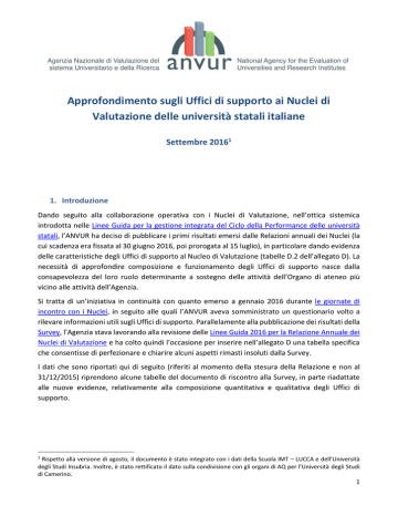 Approfondimento sugli Uffici di supporto ai Nuclei di Valutazione delle università statali italiane Settembre 20161 1. Introduzione Dando seguito alla collaborazione operativa con i Nuclei di Valutazione, nell’ottica sistemica introdotta nelle Linee Guida per la gestione integrata del Ciclo della Performance delle università statali, l’ANVUR ha deciso di pubblicare i primi risultati emersi dalle Relazioni annuali dei Nuclei (la cui scadenza era fissata al 30 giugno 2016, poi prorogata al 15 luglio), in particolare dando evidenza delle caratteristiche degli Uffici di supporto al Nucleo di Valutazione (tabelle D.2 dell’allegato D). La necessità di approfondire composizione e funzionamento degli Uffici di supporto nasce dalla consapevolezza del loro ruolo determinante a sostegno delle attività dell’Organo di ateneo più vicino alle attività dell’Agenzia. Si tratta di un’iniziativa in continuità con quanto emerso a gennaio 2016 durante le giornate di incontro con i Nuclei, in seguito alle quali l’ANVUR aveva somministrato un questionario volto a rilevare informazioni utili sugli Uffici di supporto. Parallelamente alla pubblicazione dei risultati della Survey, l’Agenzia stava lavorando alla revisione delle Linee Guida 2016 per la Relazione Annuale dei Nuclei di Valutazione e ha colto quindi l’occasione per inserire nell’allegato D una tabella specifica che consentisse di perfezionare e chiarire alcuni aspetti rimasti insoluti dalla Survey. I dati che sono riportati qui di seguito (riferiti al momento della stesura della Relazione e non al 31/12/2015) riprendono alcune tabelle del documento di riscontro alla Survey, in parte riadattate alle nuove evidenze, relativamente alla composizione quantitativa e qualitativa degli Uffici di supporto. 1 Rispetto alla versione di agosto, il documento è stato integrato con i dati della Scuola IMT – LUCCA e dell’Università degli Studi Insubria. Inoltre, è stato rettificato il dato sulla condivisione con gli organi di AQ per l’Università degli Studi di Camerino. 1 2. Composizione quantitativa Dai colloqui e dagli scambi di email intercorsi con diversi atenei dopo la pubblicazione dei risultati della rilevazione di aprile, è emersa la necessità di misurare i cosiddetti full time equivalent assegnati a supporto dei Nuclei, perché di rado avviene che le risorse siano dedicate a tempo pieno a queste funzioni. Ne emerge infatti una fotografia molto più definita, con un solo caso – quello di Milano Bicocca – in cui non c’è neanche una risorsa dedicata ai Nuclei, mentre la maggior parte degli atenei si colloca nella fascia compresa tra 2 e 3 persone (tabella 1). Tabella 1 – Numerosità componenti Uffici di Supporto Numero di persone equivalenti a tempo pieno 0 Numero Atenei Atenei 1 Milano Bicocca SISSA – Trieste; Tuscia; Scuola Superiore Sant'Anna; Pavia; Macerata; Palermo; Roma "Tor Vergata"; Trieste; Bergamo; Roma TRE; Politecnica delle Marche; Camerino; Udine; Basilicata; Scuola Normale Superiore di Pisa; Politecnico di Bari; Stranieri di Siena; Teramo; Roma "Foro Italico"; Sannio di Benevento; I.U.S.S. – Pavia; IMT- Lucca; Insubria Bologna; Cassino e Lazio Meridionale; Genova; Parma; Perugia; Pisa; Torino; Università IUAV di Venezia; Molise; "Parthenope" di NAPOLI; "L'Orientale" di NAPOLI; Mediterranea di Reggio Calabria; Trento; Urbino Carlo Bo; Stranieri di Perugia; Catanzaro; Piemonte Orientale; Politecnico di Torino; Messina; Catania; Ferrara; Sassari; Siena; "Ca' Foscari" Venezia; L'Aquila; Foggia Milano; Padova; Brescia; Verona; Bari; Firenze; Salento; Modena e Reggio Emilia; Napoli "Federico II"; Roma "La Sapienza"; Salerno Politecnico di Milano; Chieti-Pescara; Seconda Univ. Napoli; Calabria; Cagliari [0,5 - 1,5] 23 [2 – 3] 26 [3,5 – 4] 11 Oltre 4 5 Totale 66 Rispetto a quanto emerso nella precedente rilevazione – in cui era stato utilizzato un termine forse ambiguo, perché troppo legato alla funzione OIV dei Nuclei (“Struttura Tecnica Permanente”, come definito dal d.lgs.150/2009) – il numero di persone dedicate all’Ufficio di supporto al Nucleo è aumentato. Essendo il “numero di personale equivalente dedicato a tempo pieno” una variabile quantitativa continua, si è deciso di raggruppare i dati in classi chiuse. Nella classe 0,5-1,5 sono compresi: 4 atenei che hanno dichiarato 0,5 unità di personale equivalente; 1 ateneo che ha dichiarato 0,8 unità di personale equivalente; 2 10 atenei che hanno dichiarato 1 unità di personale equivalente; 1 ateneo che ha dichiarato 1,2 unità di personale equivalente; 7 atenei che hanno dichiarato 1,5 unità di personale equivalente. Non essendoci atenei che dichiarano valori >1,5 e <2 la classe successiva è 2-3 (compreso). In questa classe fanno parte: 18 atenei che hanno dichiarato 2 unità di personale equivalente; 1 ateneo che ha dichiarato 2,5 unità di personale equivalente; 7 atenei che hanno dichiarato 3 unità di personale equivalente. Anche nell’intervallo tra 3,1 e 3,5 non si è collocato alcun ateneo e dunque la classe successiva è 3,5-4 (compreso), nella quale rientrano: 2 atenei che hanno dichiarato 3,5 unità di personale equivalente; 2 atenei che hanno dichiarato 3,8 unità di personale equivalente; 7 atenei che hanno dichiarato 4 unità di personale equivalente. Infine, 5 atenei hanno dichiarato che l’Ufficio di supporto dispone di oltre 4 unità di personale equivalente. È interessante approfondire i 14 casi degli atenei che avevano dichiarato nella survey di febbraio di non disporre di personale; come abbiamo visto di questi uno solo (Milano Bicocca) conferma di non disporre di un Ufficio di supporto, mentre dei restanti 13: 5 atenei si collocano nella classe 0,5-1,5; 6 atenei si collocano nella classe 2-3; 1 ateneo dichiara 4 unità di personale equivalente; 1 ateneo dichiara 6 unità di personale equivalente. Evidentemente la formulazione della domanda che indagava sull’esistenza di una “Struttura Tecnica Perm