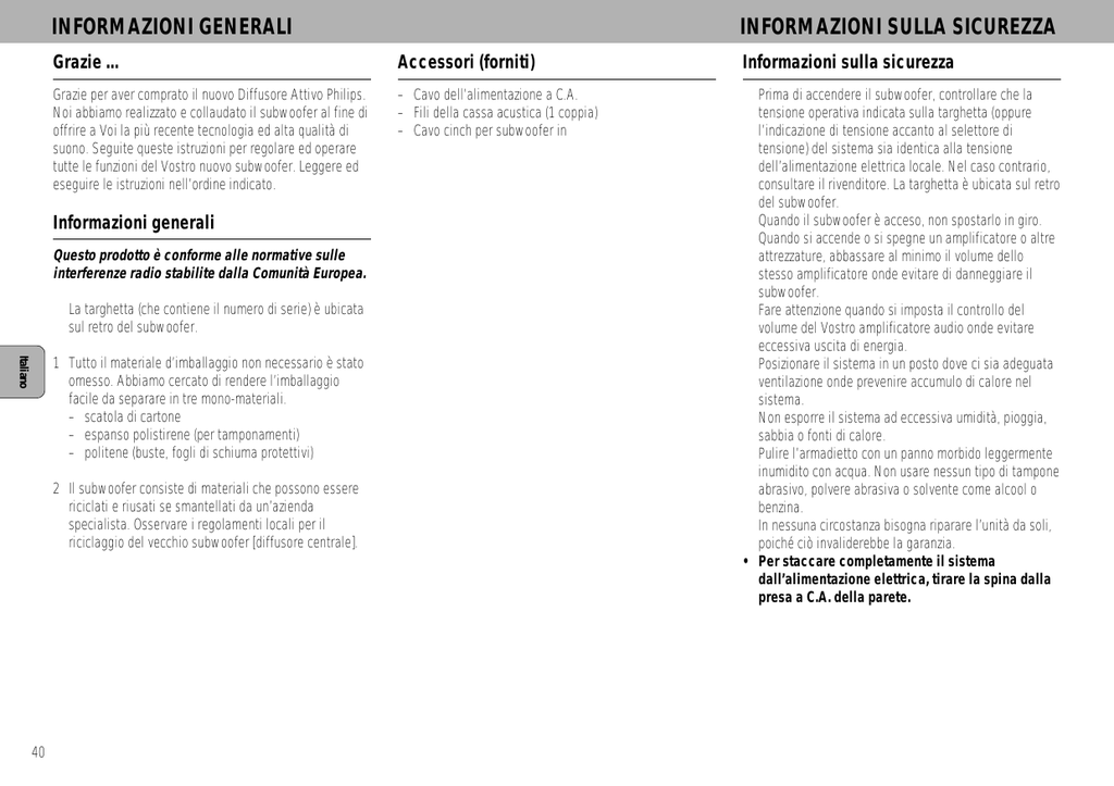 INFORMAZIONI GENERALI Grazie … Accessori (forniti) Informazioni sulla sicurezza Grazie per aver comprato il nuovo Diffusore Attivo Philips. Noi abbiamo realizzato e collaudato il subwoofer al fine di offrire a Voi la più recente tecnologia ed alta qualità di suono. Seguite queste istruzioni per regolare ed operare tutte le funzioni del Vostro nuovo subwoofer. Leggere ed eseguire le istruzioni nell’ordine indicato. – Cavo dell’alimentazione a C.A. – Fili della cassa acustica (1 coppia) – Cavo cinch per subwoofer in • Prima di accendere il subwoofer, controllare che la tensione operativa indicata sulla targhetta (oppure l’indicazione di tensione accanto al selettore di tensione) del sistema sia identica alla tensione dell’alimentazione elettrica locale. Nel caso contrario, consultare il rivenditore. La targhetta è ubicata sul retro del subwoofer. • Quando il subwoofer è acceso, non spostarlo in giro. • Quando si accende o si spegne un amplificatore o altre attrezzature, abbassare al minimo il volume dello stesso amplificatore onde evitare di danneggiare il subwoofer. • Fare attenzione quando si imposta il controllo del volume del Vostro amplificatore audio onde evitare eccessiva uscita di energia. • Posizionare il sistema in un posto dove ci sia adeguata ventilazione onde prevenire accumulo di calore nel sistema. • Non esporre il sistema ad eccessiva umidità, pioggia, sabbia o fonti di calore. • Pulire l’armadietto con un panno morbido leggermente inumidito con acqua. Non usare nessun tipo di tampone abrasivo, polvere abrasiva o solvente come alcool o benzina. • In nessuna circostanza bisogna riparare l’unità da soli, poiché ciò invaliderebbe la garanzia. • Per staccare completamente il sistema dall’alimentazione elettrica, tirare la spina dalla presa a C.A. della parete. Informazioni generali Questo prodotto è conforme alle normative sulle interferenze radio stabilite dalla Comunità Europea. • La targhetta (che contiene il numero di serie) è ubicata sul retro del subwoofer. Italiano 1 Tutto il materiale d’imballaggio non necessario è stato omesso. Abbiamo cercato di rendere l’imballaggio facile da separare in tre mono-materiali. – scatola di cartone – espanso polistirene (per tamponamenti) – politene (buste, fogli di schiuma protettivi) 2 Il subwoofer consiste di materiali che possono essere riciclati e riusati se smantellati da un’azienda specialista. Osservare i regolamenti locali per il riciclaggio del vecchio subwoofer [diffusore centrale]. 40 INFORMAZIONI SULLA SICUREZZA COLLEGAMENTO POSTERIORE E Selettore di fase Questo serve a selezionare il migliore effetto di riproduzione di basso in alcuni ambienti di ascolto. F Regolazione della tensione di esercizio L+ L– R– R+ IN L+ L– R– R+ E PHASE SELECTOR LINE INPUT SUBWOOFER LINE OUT B INPUT SELECTOR SPEAKER 0º G AC MAINS ~ 180 º G Alimentazione elettrica C.A. VOLTAGE SELECTOR 220V/240V 110V/127V C F Dopo che tutti i collegamenti sono stati effettuati, collegare la presa di alimentazione elettrica C.A. all’apparecchio e la spina nella presa C.A. della parete. Italiano SPEAKER A Prima di collegare il cavo di alimentazione alla presa a parete, assicurarsi che il selettore di tensione posto sul retro dell’impianto sia impostato sulla tensione di rete locale. In caso contrario, reimpostare il selettore prima di collegare il sistema alla presa a parete. D A Speaker In C Selettore di Ingresso Per collegamento ad un terminale di cassa acustica di un amplificatore. Si può selezionare l’input del subwoofer sia dai terminali SPEAKER IN che dal collegamento cinch del INPUT SUBWOOFER LINE. Regolare opportunamente il selettore di fonte. B Speaker Out Questa uscita viene usata quando l’amplificatore ha solo una serie di terminale per cassa acustica. Per collegamento alle casse acustiche anteriori. D Input Subwoofer Line Questo è un collegamento cinch, se l’amplificatore dispone di una spina jack del subwoofer fuori, collegarla al INPUT SUBWOOFER LINE sul retro di questo sistema. 41 COLLEGAMENTO DELLA CASSA ACUSTICA COLLEGAMENTO AD UN AMPLIFICATORE CON UNA SINGOLA SERIE DI TERMINALI PER CASSA ACUSTICA Collegare il subwoofer all’amplificatore, e poi collegare le casse acustiche anteriori al subwoofer. • Collegare la presa destra R, col filo rosso a + ed il filo nero a -. • Collegare la presa sinistra L, col filo rosso a + ed il filo nero a -. • Morsettare la porzione denudata del filo della cassa acustica come illustrato. 2 Collegare i terminali SPEAKER OUT del Subwoofer alle casse acustiche anteriore, sinistra e destra. Se i fili della cassa acustica sono invertiti, il suono sarà distorto ed avrà scarso basso. FRONT LEFT FRONT RIGHT –+ –+ COLLEGAMENTO AD UN AMPLIFICATORE CO DUE SERIE DI TERMINALI DI CASSA ACUSTICA (A + B) Collegare il subwoofer al terminale B di cassa acustica di un amplificatore, e quindi collegare le casse acustiche anteriori al terminale A di cassa acustica dell’amplificatore. • Collegare la presa destra R, col filo rosso a + ed il filo nero a -. • Collegare la presa sinistra L, col filo rosso a + ed il filo nero a -. • Morsettare la porzione denudata del filo della cassa acustica come illustrato. 12 mm 12 mm SUBWOOFER Italiano L+ per sbloccare per bloccare 1 Collegare i terminali SPEAKER IN del Subwoofer all’uscita delle casse acustiche dell’amplificatore. Se i fili della cassa acustica sono invertiti, il suono sarà distorto ed avrà scarso basso. L– R– SPEAKER OUT R+ per sbloccare 3 Impostare il selettore di fonte alla posizione SPEAKER IN. INPUT SELECTOR SPEAKER 1 Collegare i terminali SPEAKER IN del Subwoofer al terminale B di cassa acustica dell’amplificatore. Se i fili della cassa acustica sono invertiti, il suono sarà distorto ed avrà scarso basso. LINE FRONT SPEAKERS + L – – R per bloccare SPEAKER B + + L – – R + AMPLIFIER L+ L– R– R+ AMPLIFIER L+ L– R– SUBWOOFER SPEAKER IN 42 R+ SUBWOOFER