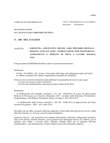 COPIA COMUNE DI STRAMBINELLO CITTA’ METROPOLITANA DI TORINO REGIONE PIEMONTE DETERMINAZIONE DEL RESPONSABILE SERVIZIO TECNICO N. 100 DEL 31/12/2015 OGGETTO: FORNITURA APPLICATIVO SISCOM ALBO PRETORIO DIGITALE HOSTING ANNUALE ALBO - PUBBLICAZIONE WEB TRASPARENZA AFFIDAMENTO E IMPEGNO DI SPESA A FAVORE WINXPAL S.R.L. Il Responsabile del SERVIZIO TECNICO, adotta la seguente determinazione : Richiamati: - il D.lgs. 18-8-2000 n. 267, recante “Testo unico delle leggi sull’ordinamento degli enti locali”; - lo Statuto comunale ed il vigente Regolamento comunale di Contabilità; Premesso che con decreti sindacali è stata attribuita la responsabile dei servizi come segue: - servizio area tecnica in data 13-06-2014; - servizio aree amministrativa, finanziaria ed altre in data 26-05-2014; Richiamate: - la deliberazione del Consiglio comunale n. 011 del 30-06-2015 di esame ed approvazione Bilancio di Previsione per l’esercizio finanziario 2015 corredato dalla Relazione Previsionale e Programmatica e del Bilancio Pluriennale relativo al triennio 2015-2016-2017; - la deliberazione della Giunta comunale n. 032 del 30-06-2015 di approvazione del Piano esecutivo di gestione – PEG – per l’anno 2015; Ricordato che gli uffici comunali utilizzano applicativi forniti dalla ditta Siscom di Cervere e dalla ditta Idea Sistemi s.r.l. di Ivrea, come di seguito dettagliato: applicativi Siscom: per la gestione area anagrafe demografica, elettorale, collegamenti telematici, stato civile (Selene, Seletell, Sesamo); per la gestione area finanziaria (Giove, Io, Callisto); per la gestione area tributi e servizio idrico (Piranha, Piranha H2O; per la gestione dell’area amministrativa – atti amministrativi (Venere Digit) e protocollo informatico (Egisto); applicativi Idea Sistemi: per la gestione area amministrativa pubblicazioni all’albo pretorio on line; - - Considerato che, con la deliberazione di Giunta n. 16 dell’11 novembre 2015, l’Unione dei Comuni Terre del Chiusella, cui il Comune di Strambinello appartiene, ha approvato un progetto informatico che prevede l’uniformazione degli applicativi in uso presso i Comuni aderenti, con utilizzo degli applicativi Siscom per tutti i comuni e l’Unione; che il sistema informatico dell’Ente deve sempre più essere svolto attraverso un sistema integrato che permetta lo scambio dei flussi dei dati tra i vari servizi dell’Ente, limitando il più possibile il data-entry manuale, la gestione automatica degli obblighi di trasparenza mediante pubblicazione sul web e la piena rispondenza del sistema a quanto previsto dal Codice dell’Amministrazione digitale; Ritenuto pertanto dotare l’area amministrativa del modulo software Siscom per la gestione dell’albo digitale e pubblicazione su web, integrato con il software di gestione atti Vener, nel rispetto del progetto di uniformazione approvato dall’Unione e per garantire una gestione automatica di tutti gli adempimenti relativi alle pubblicazioni all’albo pretorio e su web (D.lgs. n. 33/2013 artt. 15, 26, 27 e 37); Dato atto che: • Ai sensi dell’art. 33, comma 3-bis del D.Lgs. n. 163 del 2006 “ I Comuni non capoluogo di provincia procedono all'acquisizione di lavori, beni e servizi nell'ambito delle unioni dei comuni di cui all'articolo 32del decreto legislativo 18 agosto 2000, n. 267, ove esistenti, ovvero costituendo un apposito accordo consortile tra i comuni medesimi e avvalendosi dei competenti uffici anche delle province, ovvero ricorrendo ad un soggetto aggregatore o alle province, ai sensi della legge 7 aprile 2014, n. 56. In alternativa, gli stessi Comuni possono acquisire beni e servizi attraverso gli strumenti elettronici di acquisto gestiti da Consip S.p.A.o da altro soggetto aggregatore di riferimento. L'Autorità per la vigilanza sui contratti pubblici di lavori, servizi e forniture non rilascia il codice identificativo gara (CIG) ai comuni non capoluogo di provincia che procedano all'acquisizione di lavori, beni e servizi in violazione degli adempimenti previsti dal presente comma. Per i Comuni istituiti a seguito di fusione l'obbligo di cui al primo periodo decorre dal terzo anno successivo a quello di istituzione.”; • Con deliberazione del Consiglio dell’Unione n. 10 del 29.04.2013 è stata istituita la Centrale di Committenza presso l’Unione Terre del Chiusella tra i Comuni di Parella, Colleretto Giacosa, Quagliuzzo e Strambinello, con sede presso il Comune di Parella, Piazza G. Barattia, 1; • Con deliberazione di Giunta dell’Unione n. 17 del 07.12.2015 è stata approvata la struttura organizzativa provvisoria della Centrale di Committenza; • Il regolamento approvato con la deliberazione consiliare n. 10 cit. prevede che per gli affidamenti di importo inferiore a 40.000,00 euro provvede direttamente il RUP del Comune aderente; Visto il preventivo di spesa ns. prot. n. 969/2015, della ditta WinxPal, con sede legale in Rivarolo Canvese, rivenditore esclusivo di zona per i prodotti Siscom, per la fornitura di: albo pretorio digitale, hosting annuale albo pretorio, modulo di pubblicazione su web (Saturn33A26A37), Venere web viewer per pubblicazione e consultazione atti, nonché per il servizio di trascodifica e recupero banche dati esistenti; Ritenuto provvedere ad assumere il relativo impegno di spesa; determina di affidare alla ditta WinxPal, con sede legale in Via Reyneri n. 12, Rivarolo Canavese, la fornitura del software Siscom per l’area amministrativa di seguito indicato e relativo recupero banche dati, come da preventivo ns. prot. n. 969/2015, per un costo totale di euro 1.600,00 oltre iva di legge: albo pretorio digitale, hosting annuale albo pretorio, modulo di pubblicazione su web (Saturn33A26A37), Venere web viewer per pubblicazione e consultazione atti, servizio di trascodifica e recupero banche dati esistenti, di impegnare la somma complessiva pari ad euro 1.952,00 (euro 1.600,00 più euro 352,00 per iva 22%), che trova imputazione secondo quanto pr