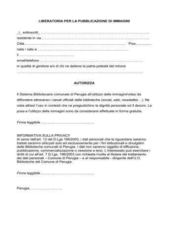 LIBERATORIA PER LA PUBBLICAZIONE DI IMMAGINI _l_ sottoscritt_ …………………………………….……..…………………………....…….. residente in via……………………………………..…….……………….…….………….... Città ….………….………………………….………………………………. Prov................ nata / nato a ………………………….………………………….…………… il ………………………………………. email/telefono …………………………………………………………………….…….. in qualità di genitore e/o di chi ne detiene la patria potestà del minore …………………………………………………………...………………………..……… AUTORIZZA Il Sistema Bibliotecario comunale di Perugia all’utilizzo delle immagini/video da diffondere attraverso i canali ufficiali delle biblioteche (social, web, newsletter…). Ne vieta altresì l’uso in contesti che ne pregiudichino la dignità personale ed il decoro. La posa e l'utilizzo delle immagini sono da considerarsi effettuate in forma gratuita. Firma leggibile ...................................................... INFORMATIVA SULLA PRIVACY Ai sensi dell'art. 13 del D.Lgs 196/2003, i dati personali che la riguardano saranno trattati saranno utilizzati solo ed esclusivamente per i fini istituzionali e divulgativi delle Biblioteche comunali di Perugia. I dati non saranno oggetto di diffusione, pubblicazione, commercializzazione o cessione a terzi. L’interessato può esercitare i diritti di cui all’art. 7 D.Lgs. 196/2003 con richiesta rivolta al titolare del trattamento dei dati personali – Comune di Perugia – e al responsabile - dirigente dell’U.O. Biblioteche del Comune di Perugia. Firma leggibile ...................................................... Perugia, ……………………...