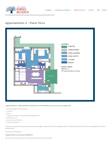 La Zona > Scegli la Tua Casa > Certificazioni e Dotazioni > > Il Progetto Blog Contatti Appartamento 3 – Piano Terra L’appartamento n. 3 della Residenza dell’Oliveto a Castel Gandolfo, misura 97 mq, ed è composto da: ampia zona giorno con caminetto 2 camere cucina 2 bagni di cui uno con vasca ed uno con piatto doccia portico di 12 mq giardino di circa 700 mq 2 posti auto esclusivi L’accesso alla proprietà avviene direttamente dal parcheggio condominiale, mentre all’appartamento si accede tramite porte-finestre firmate Eurolegno con sistema anti-effrazione. Certificazione energetica B. L’appartamento ha un prezzo di 350mila €. Nb: Le misure sono descrittive e non vincolanti. Appartamento non arredato. Zona Giorno La zona giorno, dotata di ampia porta-finestra, si compone di un unico luminoso ambiente di circa 30 mq rivestito in parquet in massello di Rovere di Slavonia. Il rovere è un’essenza dura e pregiata, dal caratteristico colore giallo con picchiettature brune, capace di dare un’immediata sensazione di calore e pregio. Ad impreziosire ulteriormente la pavimentazione, contribuisce la scelta di listoni spessi ben 14 millimetri, di grandi dimensioni e di grandezze diverse, incastrati con una posa di grande effetto estetico. Le dimensioni dei listoni raggiungono i 16 cm di larghezza e i 2 metri e 20 cm di lunghezza. Nella zona giorno è presente il caminetto a legna modello NK75 di Edikamin con rivestimento in pietra lavica grigia. Elemento di arredo, oltre che fonte di calore, il camino dà un’atmosfera unica all’ambiente. Camere Le due camere, come la zona giorno, sono pavimentate in pregiato parquet in massello Rovere di Slavonia ed hanno accesso diretto sul giardino tramite portefinestre blindate. La camera padronale è dotata di porta finestra con accesso al giardino, predisposizione per il condizionatore e bagno ensuite con finestra e vasca da bagno. La Cucina La cucina è pavimentata con mattonelle di gres porcellanato di 60×30 cm nella raffinata varietà Brazilian Slate. Bagni Il bagno con finestra ensuite è arredato con sanitari e lavabo della Linea Sfera di Catalano Ceramiche, rubinetterie della elegante ed eco-friendy collezione Nobi della Nobili, vasca da bagno 170×70 cm Calipso Plus della Novellini e scaldasalviette elettrico Lisa® a 13 elementi della Cordivari. Il bagno è rivestito in mattonelle in gres porcellanato Pietra di Valmalenco, firmate Caesar, che ricreano l’effetto ed il colore naturali delle pietre per architettura. Il bagno interno è arredato con sanitari della Linea Sfera di Catalano Ceramiche, rubinetterie della Collezione Nobi e piatto doccia. E’ dotato di estrattore d’aria per la costante aerazione e del pratico scaldasalviette elettrico a 13 elementi firmato Cardivari. Il pavimento ed il rivestimento del bagno sono in gres porcellanato effetto pietra in caldo colore quarzite. Il Giardino con Portico Il giardino di circa 700 mq è separato dai giardini adiacenti da siepi. Sul giardino si affaccia lo splendido portico di 12 mq in lamellare di legno, con pavimento rivestito in elegante cotto Sugaroni. Il giardino è inoltre dotato di piazzola in muratura per la comoda collocazione di tavoli e sdraio, ed è abbellito da un olivo secolare. Caratteristiche e Dotazioni Impianto di antifurto Impianto televisivo terrestre e satellitare centralizzato Videocitofono a colori Riscaldamento centralizzato ad elevata efficienza energetica L’appartamento è dotato di caldaia a condensazione EcoFlam High Efficiency HE CPR 25 della Elco, a 4 stelle di rendimento energetico e 3 stelle di comfort sanitario, la quale eroga acqua per il riscaldamento un sistema di serpentine collocate sotto il pavimento, senza ausilio di ingombranti caloriferi o termosifoni, sezionabile per ogni stanza. PredisposizIone per il condizionamento grazie a sistemi idraulici ed elettrici già predisposti, due attacchi per gli split e un apposito spazio esterno per collocare il motore del condizionatore. Impianto idraulico che permette la segmentazione: è possibile modulare l’acqua di ogni singolo sanitario. Isolamento termo-acustico Se un appartamento non è ben coibentato, si possono vanificare parte dei benefici di un eccellente impianto di riscaldamento. Per questo le mura esterne sono coibentate con il sistema di tamponamento Tris® della Toppetti, composto da un blocco di 32 cm in laterizio nel quale è interposto del materiale isolante. Per evitare rumori dagli appartamenti adiacenti, le pareti condivise sono state realizzate col sistema blocco acustico Toppetti. Infine, per evitare di sentire rumore di calpestio dall’appartamento al piano superiore, è stato applicato l’apposito tappetino isolante Fonostop Duo. Infissi in pino lamellare e persiane anti-effrazione Gli infissi e le persiane sono importanti sia per la coibentazione che per la sicurezza dell’appartamento. Per questo l’appartamento è dotato di infissi di prima qualità: le finestre in pino lamellare color noce firmati Eurolegno, completate da vetrocamere basso-emissive che riducono la fuoriuscita di calore verso l’esterno senza interferire col passaggio di luce solare all’interno. Completano gli infissi le persiane in ferro, sempre firmate Eurolegno, certificate in classe 3 anti-effrazione.