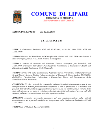 COMUNE DI LIPARI PROVINCIA DI MESSINA “Eolie Patrimonio dell’Umanità” ORDINANZA n°11/05 del 24.03.2005 IL SINDACO VISTE le Ordinanze Sindacali n°62 del 12.07.2002; n°70 del 20.04.2003; n°78 del 12.05.2003; VISTO il Decreto del Presidente del Consiglio dei Ministri del 28.12.2004 con il quale è stato prorogato, fino al 31.12.2005, lo stato d’emergenza; VISTO il verbale di riunione del Comitato Tecnico Scientifico per Stromboli, del 17.09.2003, trasmesso dall’Ufficio Pianificazione, Valutazione e Prevenzione Rischi, del Dipartimento della Protezione Civile Nazionale; VISTO il verbale n°6, della Commissione Nazionale per la Previsione e la Prevenzione dei Grandi Rischi- Sezione Rischio Vulcanico, inviato al Comune di Lipari, in data 21.03.2005, dall’Ufficio Pianificazione, Valutazione e Prevenzione Rischi, del Dipartimento della Protezione Civile Nazionale; CONSIDERATO che l’attività dei crateri del vulcano Stromboli si caratterizza per le sue manifestazioni di natura prevalentemente esplosiva e che la proiezione e la ricaduta dei prodotti dell’attività eruttiva rappresentano un pericolo, la cui entità varia al variare dello stato del vulcano, e pertanto in relazione allo stato di attività vulcanica, l’accesso agli alti versanti può essere consentito con apposita regolamentazione; RITENUTO pertanto, necessario procedere ad una regolamentazione della attività escursionistica, ed a parziale modifica ed integrazione della Ordinanza Sindacale n°62 del 12.07.2002; VISTO l’art. n°54 del D. Lg.vo n°267/2000; 1 ORDINA 1) È consentito il libero accesso dei visitatori escursionisti, al vulcano Stromboli, sino alla quota di 400 mt. s.l.m. ; 2) È consentito l’accesso dei visitatori escursionisti al successivo tratto, da quota 400 mt. s.l.m. e sino alle aree sommitali del vulcano Stromboli, soltanto se accompagnati da guide alpine e vulcanologiche autorizzate, le quali vorranno consultare il bollettino emesso dal Centro Operativo Avanzato, affisso presso la Sede di quest’ultimo, assumendo informazioni circa le condizioni dello stato di attività del vulcano e uniformandosi alle prescrizioni di cui alla regolamentazione che segue. REGOLAMENTAZIONE PER L’ACCESSO ALLA SOMMITA’ DEL VULCANO STROMBOLI E PER LE ESCURSIONI ACCOMPAGNATE DA GUIDE AUTORIZZATE 3) I gruppi di escursionisti, in numero non superiore a venti (20) persone, dovranno essere condotti a cura di una guida alpina e/o vulcanologica regolarmente autorizzata, la quale potrà essere collaborata da un esperto di primo soccorso; 4) La guida alpina e/o vulcanologica dovrà essere identificabile da un apposito cartellino munito di foto indicante la qualifica, il numero di iscrizione all’Albo regionale e le generalità; 5) Le escursioni sono consentite dalle ore 10:00 e fino alle ore 23:00, con un tempo limite massimo di un’ora di permanenza sull’area sommitale; 6) Per l’attività escursionistica al di sopra della quota dei 400 metri s.l.m. le guide autorizzate dovranno riscuotere il relativo contributo (ticket) pari ad € 3,00 per persona; 7) Gli Agenti delle Forze dell’Ordine, durante le ispezioni e i controlli di istituto, dovranno verificare l’avvenuto pagamento del contributo (ticket) previsto, e i biglietti esibiti dovranno essere annullati, mediante lacerazione. 8) L’accesso agli alti versanti del vulcano si snoda attraverso un percorso impegnativo ed è quindi necessario che la guida autorizzata verifichi l’idoneità fisica dell’escursionista e l’adeguatezza dei materiali ed attrezzature di cui lo stesso escursionista dovrà dotarsi (scarpe, indumenti, lampada, acqua, ecc.); 9) Le guide autorizzate dovranno scrupolosamente osservare e fare osservare le norme e le limitazioni che regolano l’accesso al vulcano; inoltre dovranno fornire agli escursionisti una dettagliata informazione sulle difficoltà e sui rischi cui potranno andare incontro durante la visita agli alti versanti del vulcano; a) Prima dell’escursione, la guida autorizzata avrà l’obbligo di far firmare agli escursionisti una liberatoria (scritta in cinque lingue), riguardante i rischi e l’imprevedibilità anche nell’ordinario, dell’attività parossistica del vulcano, allo scopo di informare realmente, senza malintesi e/o incomprensioni, il visitatore, contribuendo ad una reale presa di coscienza dei rischi che corre, e di sollevare da eventuali responsabilità le Guide stesse e le Autorità; b) la permanenza nell’area craterica sommitale , che ove consentita, salvo quanto previsto dal punto 5) della presente Ordinanza, dovrà comunque essere breve e a 2 c) d) e) f) g) h) i) discrezione della guida, che la valuterà sulla base delle condizioni meteorologiche e dell’attività vulcanica; Le guide autorizzate dovranno costituire, nella dislocazione più opportuna, un “Centro Escursioni”, che sia costantemente presidiato nelle ore in cui vengono svolte le attività escursionistiche; Il “Centro Escursioni” avrà il compito di regolare il flusso dei gruppi escursionisti, allo scopo di evitare prolungati assembramenti in zone a più elevato rischio: - sia dotato di generi di primo soccorso e uomini in grado di intervenire prontamente in caso di incidenti; allo scopo potrà farsi ricorso ad Associazioni di Volontariato e , specificatamente all’Associazione “Misericordia” operante su Stromboli, dichiaratasi disponibile; - assicuri il collegamento radio e/o telefonico (punto di ascolto) tra i gruppi che effettuano l’escursione e i presidi istituzionalmente preposti alle attività di soccorso e protezione civile (Carabinieri/ Vigili Urbani / Associazioni di Volontariato); Durante il corso dell’escursione, le guide autorizzate dovranno essere dotate di apparati rice-trasmittenti, che garantiscano il collegamento con un punto di ascolto costantemente presidiato (Centro Operativo Avanzato e “Centro Escursioni”); Ove l’attività escursionistica possa essere esercitata ad alta quota, i partec