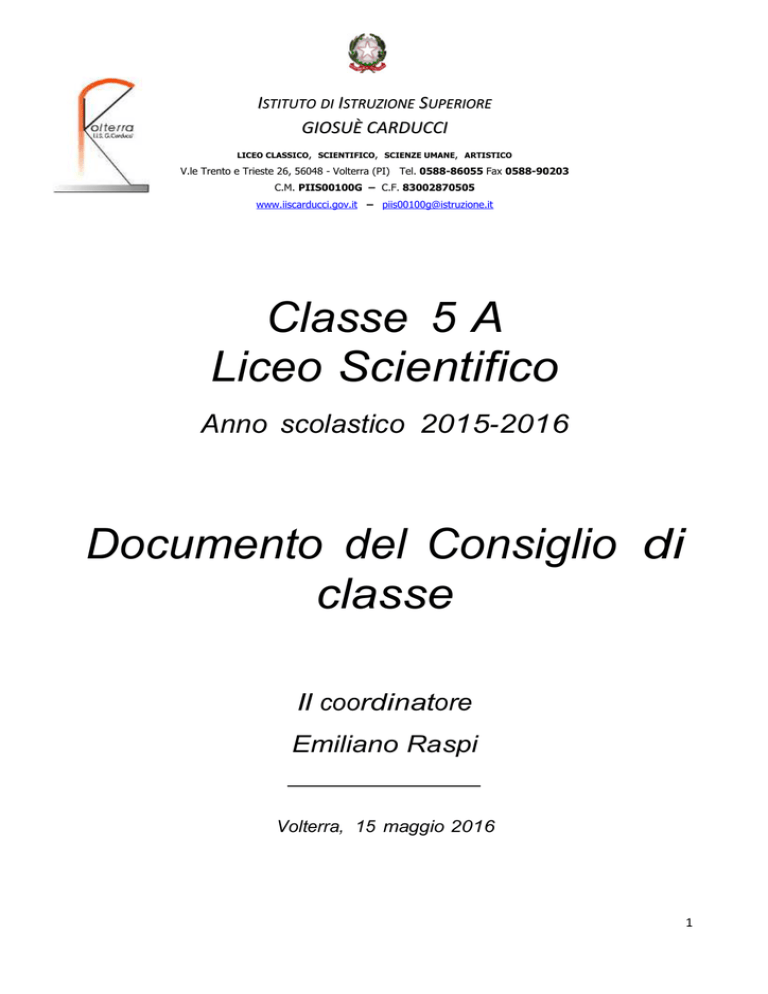ISTITUTO DI ISTRUZIONE SUPERIORE GIOSUÈ CARDUCCI LICEO CLASSICO, SCIENTIFICO, SCIENZE UMANE, ARTISTICO V.le Trento e Trieste 26, 56048 - Volterra (PI) Tel. 0588-86055 Fax 0588-90203 C.M. PIIS00100G – C.F. 83002870505 www.iiscarducci.gov.it – [email protected] Classe 5 A Liceo Scientifico Anno scolastico 2015-2016 Documento del Consiglio di classe Il coordinatore Emiliano Raspi Volterra, 15 maggio 2016 1 1- Presentazione della classe La classe quinta A del Liceo Scientifico, attualmente composta da 24 studenti, di cui 14 maschi e 10 femmine, fin dalla sua formazione è risultata piuttosto eterogenea per interessi, attitudini, livelli di preparazione e di partecipazione, ma molto unita sul piano umano. Nel corso degli ultimi tre anni, la classe è rimasta composta dal medesimo numero di studenti, eccetto l’ultimo, quando si è aggiunto un elemento. Nella classe è presente un alunna DSA (vedi allegato C) riservato alla Commissione d’Esame. Tredici dei v e n t i q u a t t r o studenti risiedono nei comuni e frazioni limitrofe e sono conseguentemente pendolari. Nel corso del secondo biennio e dell’anno conclusivo vi è stata continuità didattica in Italiano e Latino, Matematica e Fisica, Scienze, Inglese, Storia e Filosofia, e Religione. Nelle altre materie si sono avvicendati due o più docenti. Gli alunni, nel corso degli anni, hanno espresso una ottima capacità relazionale all’’interno del gruppo, ed una vivacità che non è stata messa a frutto in egual modo in tutte le discipline. Per tale motivo, se in alcune materie si è raggiunto un apprezzabile e proficuo sviluppo del “dialogo educativo", in altre il medesimo si è rivelato molto meno vivace e produttivo. Tale atteggiamento ha determinato il fatto che nel caso di un buon numero di discipline gli studenti abbiano raccolto al meglio le indicazioni ed i suggerimenti dei docenti riguardo al lavoro in classe, all’impegno a casa ed alla rielaborazione personale dei contenuti, mentre in altre, si sono riscontrate, in tal senso, alcune difficoltà. Indubbiamente alcuni alunni hanno fatto registrare negli anni u n a forte crescita dei livelli di competenza e di consapevolezza, maturando anche un buon spirito critico; a questi se se ne affiancano altri che non sono riusciti ad esprimere al meglio le proprie potenzialità. Nel complesso, quindi, i livelli di competenza nelle singole discipline differiscono a seconda del soggetto in questione. Nel caso di una parte della classe, se pure minoritaria, in alcune materie di studio la discontinuità nell’impegno e nell’attenzione ha determinato difficoltà nell’elaborazione di strategie di studio affidabili e produttive, con conseguente permanere di incertezze nella preparazione generale. A fronte del gruppo di studenti sopra decritto, ve ne sono stati altri che si sono invece impegnati con diligenza ed applicazione per lo sviluppo di un metodo di studio efficace e per il consolidamento e l’arricchimento delle conoscenze e delle competenze acquisite. La scuola nel corso dell’intero quinquennio ha messo a disposizione degli allievi insieme ai corsi di recupero lo sportello didattico per permettere loro di superare le difficoltà e le lacune, garantendo sempre alle famiglie apertura al dialogo educativo ed alla collaborazione. 2 - Linee programmatiche comuni In rapporto alle caratteristiche della classe e alle finalità e agli obiettivi generali del P.O.F. il Consiglio di classe ha individuato i seguenti obiettivi educativi e didattici: Area dei comportamenti •Favorire il dialogo e l’interazione all’interno della classe 2 •Favorire l’attiva partecipazione alle lezioni •Consolidare il senso di responsabilità nello studio e nell’esecuzione dei compiti assegnati dai docenti Area cognitiva Consolidamento delle capacità e competenze trasversali: •individuazione ed analisi dei problemi •contestualizzazione •confronto, coordinamento diacronico e sincronico, disciplinare , inter o pluridisciplinare •acquisizione e utilizzazione di conoscenze, metodi, strumenti e procedure disciplinari e trasversali •potenziamento della conoscenza dei lessici disciplinari •potenziamento della capacità argomentativa •potenziamento delle abilità linguistico-espressive 3 - Strumenti di verifica e criteri di valutazione Secondo quanto stabilito dal Collegio docenti, l’anno scolastico è stato articolato in quadrimestri all’interno di quali è stato prevista una comunicazione interperiodale alle famiglie degli studenti Il Consiglio di classe si è attenuto ai criteri di valutazione previsti dal P.O.F. La preparazione degli allievi è stata verificata mediante osservazione sistematica , dialogo didattico, prove orali e scritte ( prove strutturate e/o semistrutturate, questionari, relazioni, saggi, temi problemi,esercizi ) e pratiche secondo la normativa vigente e in conformità con le tipologie di prove fissate dall’esame di stato. In preparazione all’esame di stato sono state fatte simulazioni di tutte le prove. Per quanto riguarda la simulazione della terza prova è stata privilegiata la tipologia B. I fattori che hanno concorso alle valutazioni periodiche e finali sono stati: il metodo di studio, la partecipazione attiva all’attività didattica, la frequenza scolastica, l’impegno, il progresso rispetto ai livelli di partenza, il livello generale della classe, e la situazione individuale. 4 - Iniziative di sostegno Sono state previste attività di recupero e potenziamento mediante corsi specifici, attività laboratoriali, sportello didattico e percorsi individualizzati in itinere. A tali proposte didattiche gli allievi hanno aderito in modo diversificato e con diverso profitto 5 - Attività extra- para e intercurriculari Il Consiglio di Classe, assecondando anche le indicazioni degli allievi e nel rispetto del regolamento di Istituto, ha organizzato nel presente anno scolastico un viaggio di istruzione a Vienna. La classe, inoltre, ha aderito nell’arco d