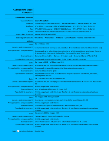 Curriculum Vitae Europass Informazioni personali Cognome Nome Chiara Marcelletti Indirizzo Sedi Municipali Comune di Arcevia Comune di Barbara e Comune di Serra de Conti Telefono 0731.9899213 (Arcevia) – 071.9674212 (Barbara) - 0731.871755 (Serra de Conti) Fax 0731.9899226( Arcevia) – 071.9674065 (Barbara) - 0731.879290 (Serra de Conti) E-mail Luogo e data di nascita Settore professionale [email protected] – [email protected] Mestre (VE) il 16 aprile 1967 Urbanistica - Architettura - Ambiente – Lavori Pubblici - Tecnico Amministrativo attività Date Lavoro o posizione ricoperti Principali attività e responsabilità datore di lavoro Tipo di attività o settore Date Lavoro o posizione ricoperti Principali attività e responsabilità datore di lavoro Tipo di attività o settore Date Lavoro o posizione ricoperti Principali attività e responsabilità datore di lavoro Tipo di attività o settore Date Lavoro o posizione ricoperti Principali attività e responsabilità datore di lavoro Tipo di attività o settore Date Lavoro o posizione ricoperti Principali attività e responsabilità datore di lavoro Tipo di attività o settore Pagina 1/2 - Curriculum professionale Dal 1 febbraio 2016 Comune di Serra dè Conti (An) con procedura di Comando dal Comune di Castelplanio (An) Responsabile area urbanistica sisma e territorio ufficio associato convenzionato Comune di Arcevia (An) - Comune di Barbara (An) Comune di Serra de’ Conti (An) Comune di Arcevia (An) - Comune di Barbara (An) - Comune di Serra de’ Conti (An) Responsabile servizi: edilizia privata SUE e SUAP e attività estrattive Dal 1 giugno 2010 – al 31 gennaio 2016 Assunzione di ruolo a tempo indeterminato con qualifica di Responsabile area tecnica Responsabile terza unità organizzativa LLpp urbanistica e ambiente Comune di Castelplanio (AN) Responsabile servizi: LLPP, Manutenzione, trasporto pubblico e scolastico, ambiente, edilizia privata e SUAP. Dal 1 settembre 2009 al 31 maggio 2010 Assunzione di ruolo a tempo piano indeterminato con qualifica di Funzionario tecnico cat. D1 Attività progettuale e istruttoria Area Urbanistica del Comune di Cervia (RV) Attività progettuale e istruttoria per il settore di pianificazione urbanistica attuativa e generale Dal maggio 2005 al maggio 2007 Assunzione a tempo determinato part-time di Alta Specialità cat. D3-D5 Attività progettuale e istruttoria Ufficio Progetti Speciali area urbanistica del Comune di Jesi (AN) Attività progettuale e istruttoria per il settore di pianificazione urbanistica attuativa e generale Dal gennaio 2000 al maggio 2005 Contratti annuali libero professionali a fattura Attività progettuale e istruttoria Ufficio Pianificazione Attuativa area urbanistica del Comune di Ancona Attività progettuale e istruttoria per il settore di pianificazione urbanistica attuativa e generale Marcelletti Chiara Date Lavoro o posizione ricoperti Principali attività e responsabilità datore di lavoro Tipo di attività o settore Date Lavoro o posizione ricoperti Principali attività e responsabilità datore di lavoro Tipo di attività o settore Date Lavoro o posizione ricoperti Principali attività e responsabilità Dal giugno 1999 al dicembre 19999 Contratto libero professionale a fattura Attività istruttoria Ufficio Tecnico del Comune di Agugliano (AN) Attività istruttoria per il settore edilizia privata 1997 -1998 Architetto Stagista (borsa di studio LOENARDO PROGRAMME) e Attività libero professionale. Attività di progettazione Architettonica e urbanistica con studi professionali, in Francia nella regione del Jura. Studio di Progettazione Balduini a Lons-Le-Saunier e studio di Progettazione Garcia a Besançon Attività di progettazione architettonica e urbanistica Dal 1995 all’ agosto 2009 Attività libero professionale con partita IVA Attività di progettazione Architettonica e urbanistica autonoma e di collaborazione con altri studi professionali, effettuata anche all’estero (Francia), Incarichi pubblici con PA datore di lavoro Ditte private, imprese edili e studi professionali e PA Tipo di attività o settore Attività di progettazione architettonica e urbanistica Titoli personali professione Università Dal 1995 Iscrizione all’albo professionale degli Architetti Pianificatori Paesaggisti e Conservatori sez.A Albo professionale Architetti Pianificatori Paesaggisti e Conservatori sez.A della Provincia di Ancona. Iscrizione n. 799 Nel 28 aprile 1994 Laurea in Architettura. Votazione 110/110 con lode e Menzione Facoltà di Architettura “la Sapienza” di Roma. Madrelingua Altre lingue competenze informatiche Patente Ulteriori informazioni Pagina 2/2 - Curriculum professionale Italiana Conoscenza delle lingue INGLESE e FRANCESE (approfondimento delle lingue all’estero e prolungati soggiorni per lavoro all’estero) Uso corrente di programmi CAD; ARC-GIS; pacchetto OFFICE e ADOBE e programmi gestione amministrativi PA. di guida cat. B Assunzione nella PA tramite Concorso pubblico per titoli ed esami al posto di Istruttore Direttivo Tecnico categoria D1 presso l’area tecnica del COMUNE DI CERVIA (RV). Marcelletti Chiara