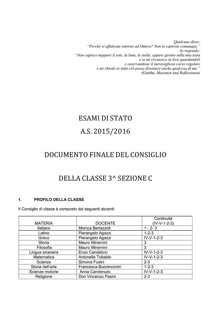 Qualcuno disse: “Perché vi affaticate intorno ad Omero? Non lo capirete comunque.” Io rispondo: “Non capisco neppure il sole, la luna, le stelle; eppure girano sulla mia testa e io mi riconosco in loro guardandoli e osservandone il meraviglioso corso regolare e mi chiedo se tutto ciò possa diventare anche qualcosa di me.” (Goethe, Maximen und Reflexionen) ESAMI DI STATO A.S. 2015/2016 DOCUMENTO FINALE DEL CONSIGLIO 1. DELLA CLASSE 3^ SEZIONE C PROFILO DELLA CLASSE Il Consiglio di classe è composto dai seguenti docenti: MATERIA Italiano Latino Greco Storia Filosofia Lingua straniera Matematica Scienze Storia dell’arte Scienze motorie Religione DOCENTE Monica Bertazzoli Pierangelo Agazzi Pierangelo Agazzi Mauro Minervini Mauro Minervini Enzo Candeloro Antonella Tobaldo Simona Fusini Francesca Buonincontri Anna Carotenuto Don Vincenzo Pasini Continuità (IV-V-1-2-3) 1 - 2- 3 1-2-3 IV-V-1-2-3 3 3 IV-V-1-2-3 IV-V-1-2-3 2-3 1-2-3 IV-V-1-2-3 2-3 Ministero dell’Istruzione, dell’Università e della Ricerca Liceo Classico Statale P aolo Sarpi P.zza Rosate, 4 – Bergamo Tel. 035 237476 Fax 035 223594 Email: [email protected] pec: [email protected] www.liceosarpi.bg.it 2. COMPOSIZIONE DELLA CLASSE 1) ANGHILERI Marco 2) BENVENUTI Matteo 3) BONFADINI Daniel 4) BREMBILLA Federico 5) CAPELLI Enrico 6) CERESOLI Chiara 7) COLOMBO Marco 8) DAGLIO Beatrice 9) DE LORENZI Veronica 10) DE PALMA Ilaria 11 ) DIFRANCESCO Anna Lucia 12) FASSI Luisa 13) FILIPPOLI Alessandro 14) GAMBIRASIO Marco 15) GIUPPONI Francesca 16) LODETTI Laura 17) MAFFEIS Marta 18) MORO Giovanni 19) MOSCA Arianna 20) PAPALIA Chiara 21) RIVA Valeria 22) ROTA Giovanni 23) SILVESTRONI Matteo 24) SPAGLIARDI Laura 3. ESITI SCOLASTICI Classe quarta: promossi: 15 con giudizio sospeso, tutti promossi a settembre: in latino: 2 in greco: 6 in matematica: 2 in inglese: 1 non promossi: 2 ritirati: 1 Nella classe IV C tre alunni si sono ritirati nel corso dell'anno. Classe quinta: promossi: 14 con sospensione del giudizio: 7 (tutti promossi a settembre) in latino: 4 in greco: 5 -2- Ministero dell’Istruzione, dell’Università e della Ricerca Liceo Classico Statale P aolo Sarpi P.zza Rosate, 4 – Bergamo Tel. 035 237476 Fax 035 223594 Email: [email protected] pec: [email protected] www.liceosarpi.bg.it in matematica: 3 in inglese: 1 in storia: 1 non promossi: 1 ---> Nell'a.s. 2013-14 la classe (prima) risultava composta da 26 elementi, e precisamente: 20 provenienti dalla V C; 3 alunni (Filippoli, Gambirasio e Rota) provenienti dalla 5^A (classe smembrata) 1 alunna (DIfrancesco), proveniente dal LIceo Classico di Caltanisetta, dove aveva frequentato la 5^ ginnasio (promossa a giugno); - L’alunna Girardi Margherita si era trasferita negli Stati Uniti d’America. Classe prima: promossi: 15 con sospensione del giudizio: 11 (tutti promossi a settembre) in latino: 9 in greco: 3 in matematica: 3 ---> Nell'a.s. 2014-15 la classe risulta composta da 23 elementi, tutti provienienti dalla I C, in quanto due alunne (Cavalleri Ottavia e Ventriglia Francesca), pur essendo state promosse a settembre si sono trasferite all’inizio dell’anno in altro istituto, mentre l’alunna Ghilardi Matilde si è trasferita ad una scuola superiore di Cambridge. L’alunna De Palma Ilaria si è trasferita in Spagna per il primo trimestre all’interno del programma di Intercultura. Classe seconda: promossi 20 con sospensione del giudizio: 3 (tutti promossi a settembre) in latino: 1 in greco: 1 in inglese: 2 ---> Nell'a.s. 2014-15 la classe III C risulta composta da 24 elementi, di cui 23 provienienti dalla II C e 1 (Spagliardi Laura) dalla classe II B di codesto stesso liceo. 4.OBIETTIVI La programmazione disciplinare generale e dei singoli ambiti si è ispirata ai principi e alle linee della programmazione d'istituto (POF) e del Documento di programmazione del Collegio docenti. Il Consiglio dei docenti focalizza per la classe i seguenti obiettivi: Obiettivi formativi • • • Acquisire coscienza di sé, delle proprie capacità e dei propri limiti Acquisire consapevolezza delle mete comuni educative, formative e disciplinari Comportarsi in modo rispettoso nei confronti di tutti (compagni, docenti e personale scolastico) -3- Ministero dell’Istruzione, dell’Università e della Ricerca Liceo Classico Statale P aolo Sarpi P.zza Rosate, 4 – Bergamo Tel. 035 237476 Fax 035 223594 Email: [email protected] pec: [email protected] www.liceosarpi.bg.it • • • • • • • • Acquisire la consapevolezza che ambienti, strutture, sussidi didattici della scuola costituiscono un bene comune e che gli allievi condividono la responsabilità di averne cura Acquisire una responsabilità collettiva, stabilendo rapporti collaborativi con i compagni e superando atteggiamenti di competitività negativa Sviluppare un approccio problematico, aperto e non emotivo nei confronti della realtà Rispettare orari e tempi della vita scolastica, consegne e scadenze connesse con il lavoro didattico Partecipare e collaborare attivamente e in modo responsabile a tutti i momenti del lavoro della classe nel riconoscimento della valenza didattico-cognitiva delle attività (spiegazione, interrogazione, discussione, assemblea) Consolidare un metodo di studio efficace ed autonomo Affinare il rigore linguistico e concettuale Consolidare un atteggiamento interdisciplinare nei confronti delle materie di studio. Obiettivi cognitivi Conoscenza: possedere conoscenze formali / astratte • Conoscere gli argomenti dagli aspetti essenziali alla completezza di dati specifici e contestuali • Conoscere il significato dei termini e il loro uso specifico • Conoscere concetti, metodi, procedure e strumenti operativi delle diverse discipline in relazione ai contenuti dei relativi programmi. Abilita': sapere utilizzare conoscenze dati in concreto e in contesti noti • Comprendere e spiegare il contenuto di un argomento • Individuare i nuclei centrali di un argomento • Cogliere le articolaz