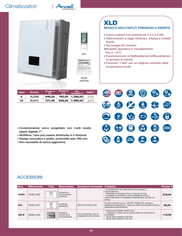 Climatizzatori | XLD MONO E MULTISPLIT PREMIUM A PARETE inea a parete con potenza da 2.5 e 3.5 kW. L Telecomando a raggi infrarossi, display a cristalli liquidi. Tecnologia DC Inverter. Modalità operativa in riscaldamento fino a -15°C. Funzionamento in Raffreddamento/Riscaldamento (pompa di calore) Funzione “I feel” per un migliore controllo della temperatura locale RC7 RCW2 (optional) Taglia Modello Prezzo € U.I. Prezzo € U.E. 9 XLD09 648,00 750,00 1.398,00 3,33 12 XLD12 721,00 838,00 1.559,00 3,33 Set completo € RAEE € FLEXY MAtCH CLASS Low Low R410A AUto tUrBo rEStArt 24 H GroUP ondizionatore unico progettato con multi media C player digitale 7”. Multiflow, l’aria può essere distribuita in 4 direzioni Design innovativo e piatto, profondità solo 160 mm. Non necessita di carica aggiuntiva. CoNtroL AUto tESt ModE - °C - °C ACCESSORI Acc. Riferimento Foto Descrizione Accessori necessari Funzione - Controllo fino a 32 unità interne come gruppo o individualmente. - Possibilità di impostare fino a 15 gruppi di zone. - Possibilità di impostare il timer (quotidianamente e settimanalmente), la modalità, la velocità della ventola e lo swing. RCW2 7ACEL1303 Comando a filo termostato ambiente RCL 7ACEL1447 Comando semlificato CBI-B P/N7ACEL1249 Funzioni semplici come : ON/OFF, MODALITA’ operativa, regolazione temperatura , selezione della velocità della ventola e temperatura dell’ambiente. 7ACEL1249 Scheda di interfaccia di comunicazione Il kit comprende i cavi di collegamento alla scheda. - Telecomandi RS485, RCW2, RCL. - 1 ingresso contatto secco (selezionabile da interruttori di profondità). - Uscita stato d’allarme (12V DC). - Uscita stato ON/OFF (12V DC). CBI-B 16 18 Prezzo € 278,00 45,00 113,00 Dati tecnici XLD Unità interne Unità esterne Raffreddamento Potenza resa* kW Potenza assorbita kW EER/Classe Riscaldamento Limiti operativi esterno °C Potenza resa* kW Potenza assorbita kW COLLEGAMENTI FRIGORIFERI 3.5 0.658 1.09 3.8/A 3.2/A 3.5 0.625 0.97 4.0/A 3.61/A °C Temperatura di bulbo secco -15°/24° Livello di pressione sonora a 1 m dB(A) 32/35/38 33/36/39 Livello di Potenza sonora dB(A) 55 56 Portata d’aria m /h 330/370/390 310/370/400 Deumidificazione l/h 1 1.6 Dimensioni (LxPxA) mm 570x160x570 570x160x570 Peso kg 13.5 14 3 7SP022850 7SP022851 Prezzo € 648,00 721,00 Livello di pressione sonora a 1 m dB(A) 51 52 Livello di potenza sonora dB(A) 61 62 Portata d’aria m /h 1780 1780 Compressore rotativo DC Inverter Compressore rotativo DC Inverter 795x290x610 795x290x610 3 Dimensioni (LxPxA) mm Peso kg Codice prodotto 1~230V - 50 Hz GC 12 DC INV R410 2.5 Limiti operativi esterno Tipo di compressore alimentazione GC 9 DC INV R410 Temperatura di bulbo secco -10°/46° Codice prodotto UNITÀ ESTERNA AWSI-XLD012-N11 2.5 COP/Classe UNITÀ INTERNA AWSI-XLD009-N11 38 38.5 7002287 7002288 Prezzo /RAEE € 750,00 / 3,33 838,00 / 3,33 Prezzo set completo / RAEE € 1398,00 / 3,33 1559,00 / 3,33 Interno Interno 2 3x1.5 3x1.5 Alimentazione su unità Sezione cavo di alimentazione mm Fusibile A 16 16 Collegamenti elettrici mm2 4x1.5 4x1.5 Linea frigorifera gas Ø pollici 3/8” 3/8” Linea frigorifera liquido Ø pollici 1/4” 1/4” Lunghezza massima m 20 20 Dislivello massimo tra unità m 10 10 * Le rese di tutti i modelli sono misurate in condizioni normali, secondo le norme UNI-EN 14511. SOLUZIONI AIRWELL chermo LCD 7”. S MP3 player. Video player AVI. Photo player. Telecomando. Memoria 1 Gb. Porta USB. Memory card SD/MMC/MS. 17 19