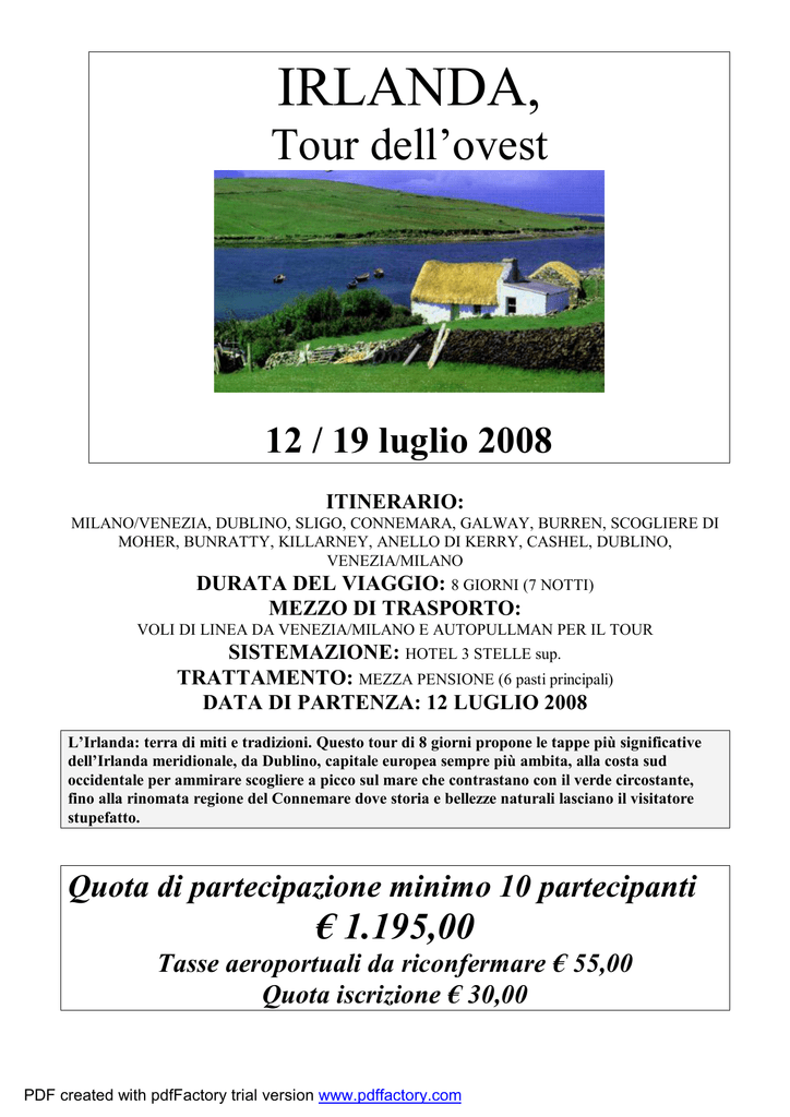 IRLANDA, Tour dell’ovest 12 / 19 luglio 2008 ITINERARIO: MILANO/VENEZIA, DUBLINO, SLIGO, CONNEMARA, GALWAY, BURREN, SCOGLIERE DI MOHER, BUNRATTY, KILLARNEY, ANELLO DI KERRY, CASHEL, DUBLINO, VENEZIA/MILANO DURATA DEL VIAGGIO: 8 GIORNI (7 NOTTI) MEZZO DI TRASPORTO: VOLI DI LINEA DA VENEZIA/MILANO E AUTOPULLMAN PER IL TOUR SISTEMAZIONE: HOTEL 3 STELLE sup. TRATTAMENTO: MEZZA PENSIONE (6 pasti principali) DATA DI PARTENZA: 12 LUGLIO 2008 L’Irlanda: terra di miti e tradizioni. Questo tour di 8 giorni propone le tappe più significative dell’Irlanda meridionale, da Dublino, capitale europea sempre più ambita, alla costa sud occidentale per ammirare scogliere a picco sul mare che contrastano con il verde circostante, fino alla rinomata regione del Connemare dove storia e bellezze naturali lasciano il visitatore stupefatto. Quota di partecipazione minimo 10 partecipanti € 1.195,00 Tasse aeroportuali da riconfermare € 55,00 Quota iscrizione € 30,00 PDF created with pdfFactory trial version www.pdffactory.com PROGRAMMA 1° GIORNO: TRENTO –VENEZIA/MILANO - DUBLINO Orari e luoghi di partenza da Trento e Rovereto per l’aeroporto di partenza, saranno comunicati con la circolare informativa circa 8 giorni prima. All’aeroporto, disbrigo delle formalità aeroportuali, quindi partenza con volo di linea per Dublino. All'arrivo, trasferimento in autopullman in Hotel. Sistemazione e pernottamento. 2° giorno: DUBLINO – SLIGO Mezza pensione. Prima colazione in hotel. Mattina dedicata alla visita di Dublino comprendente: giro panoramico, la visita al Trinity College, la piu’ antica universita’ dell’Irlanda dove sara’ possibile ammirare nella Old Library (Vecchia Biblioteca) oltre ai numerosi testi antichi, unici al mondo, il “Libro di Kells” che rappresenta uno dei libri piu’ antichi del mondo. Successivamente partenza per la citta’ di Sligo che e’ situata nella parte nord ovest dell’Irlanda. Sligo e’ la Contea immortalata dai poemi di W.B. Yeats, vincitore del premio Nobel nel 1923. E’ ricoperta da boschi, valli lussureggianti ed alte montagne. I contrasti suggestivi fra i suoi laghi, foreste e montagne donano a questa regione una straordinaria bellezza. Cena e pernottamento in hotel (a Sligo o dintorni). 3° giorno: SLIGO – GALWAY (Connemara) Mezza pensione. Prima colazione in hotel. Intera giornata dedicata all’escursione nel Connemara: regione selvaggia, caratteristica per i suoi muretti di pietra, le piccole fattorie, i cottages dai caratteristici tetti in paglia. Rimarrete affascinati dalle sue coste rocciose e frastagliate, insenature che si estendono fino alla Baia di Galway, le sue montagne dalle splendide vedute sui laghi che creano uno scenario indimenticabile. La luce ed il paesaggio variano continuamente in un susseguirsi di boschi, laghi, fiumi, spiagge dorate e dolci colline. Cena e pernottamento in albergo (a Galway o dintorni). 4° giorno: GALWAY (Isole Aran, facoltativo) Mezza pensione. Prima colazione in albergo. Intera giornata libera per visite ed escursioni facoltative. Cena e pernottamento in albergo. Consigliamo l’escursione a Inishmore, la maggiore delle Isole Aran. Visita libera di Galway: Questa cittadina e’ davvero deliziosa, con le sue stradine strette, le facciate dei vecchi negozi in pietra e in legno, i buoni ristoranti e i pub animati. Da sempre attrae folle di musicisti, artisti, intellettuali e giovani anticonfornisti. Cio’ si deve in parte alla presenza dell’Universita’, ma soprattutto all’attrattiva esercitata dalla vita notturna nei pub, dove si chiacchiera e si beve molto. La citta’, inoltre, e’ uno dei principali centri gaelici e l’irlandese e’ parlato diffusamente. Escursione facoltativa a Inishmore – la maggiore delle Isole Aran. Queste tre isole Aran sono della stessa origine calcarea del Burren nella contea di Clare e possiedono alcuni dei piu’ antichi resti di insediamenti cristiani e precristiani in Irlanda. Si partira’ con il traghetto da Rossaveal e dopo una traversata di circa 45 minuti si giungera’ su Inishmore, dove un minibus vi accompagnera’ attraverso i siti piu’ significativi dell’isola al forte Dun Angus risalente a piu’ di 2000 anni fa abbarbicato su scogliere meravigliose e intatte a picco sull’Atlantico. Tempo libero per il pranzo e eventuali acquisti dei famosi maglioni delle isole Aran. Rientro con il traghetto del pomeriggio. PDF created with pdfFactory trial version www.pdffactory.com 5° giorno: GALWAY – BURREN – scogliere di MOHER – BUNRATTY CASTLE – KILLARNEY Mezza pensione. Prima colazione in albergo. Partenza in direzione sud alla volta di Kerry. Si attraverserà il Burren (dall’Irlandese Boireann “luogo roccioso”) affascinante regione carsica dove l’acqua, scorrendo in profondità, ha creato grotte e cavità sotterranee. Il Burren e’ la piu’ estesa regione di pietra calcarea d’Irlanda e la particolarita’ del suo territorio gli conferisce l’aspetto di territorio lunare. Sosta alle maestose ed imponenti scogliere di Moher, alte 200 metri e lunghe 8 Km: sono uno spettacolo che lascia senza fiato. Trasferimento a Kerry passando per il villaggio di Adare con i suoi graziosi cottage dal tetto di paglia ed i negozietti di antiquariato. Visita al castello di Bunratty che comprende il complesso medievale piu’ completo ed autentico in tutta Irlanda. Fu costruito nel 1425 e restaurato definitivamente nel 1954. Il castello infatti aveva subito in molte occasioni saccheggi e distruzioni ma oggi lo possiamo ammirare nuovamente nel suo splendore medievale grazie all’arredamento e alla tappezzeria che richiama lo stile di quel periodo. Il Folk Park intorno al castello ricostruisce la vita rurale nell’Irlanda di 100 anni fa, con le sue fattorie appositamente ricostruite, cottage e negozi, ricreati con la massima cura e con particolare attenzione soprattutto all’arredamento. E’ come un museo vivente: si cucina il pane, si allevano gli ani