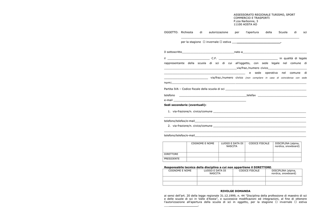 ASSESSORATO REGIONALE TURISMO, SPORT COMMERCIO E TRASPORTI P.zza Narbonne, 3 11100 AOSTA AO OGGETTO: Richiesta di autorizzazione per l'apertura della Scuola di sci ______________________________________________________________________ per la stagione invernale estiva __________________________. Il sottoscritto_______________________________nato a______________________________________ il _________________________ C.F. ___________________________________ in qualità di legale rappresentante della scuola di sci di cui all’oggetto, con sede legale nel comune di ___________________________________________via/fraz./numero civico_______________________ ________________________________________________ e sede operativa nel comune di __________________________ via/fraz./numero civico (non compilare in caso di coincidenza con sede legale)________________________________________________________________________________ Partita IVA – Codice fiscale della scuola di sci ________________________________________________ telefono ________________________________________telefax _____________________________ e-mail ___________________________________________ Sedi secondarie (eventuali): 1. via-frazione/n. civico/comune _______________________________________________________ ____________________________________________________________________________________ telefono/telefax/e-mail__________________________________________________________________ 2. via-frazione/n. civico/comune _______________________________________________________ ____________________________________________________________________________________ telefono/telefax/e-mail__________________________________________________________________ COGNOME E NOME LUOGO E DATA DI NASCITA CODICE FISCALE DISCIPLINA (alpina, nordica, snowboard) DIRETTORE PRESIDENTE Responsabile tecnico della disciplina a cui non appartiene il DIRETTORE: COGNOME E NOME LUOGO E DATA DI NASCITA CODICE FISCALE DISCIPLINA (alpina, nordica, snowboard) RIVOLGE DOMANDA ai sensi dell'art. 20 della legge regionale 31.12.1999, n. 44 "Disciplina della professione di maestro di sci e delle scuole di sci in Valle d'Aosta”, e successive modificazioni ed integrazioni, al fine di ottenere l'autorizzazione all'apertura della scuola di sci in oggetto, per la stagione invernale estiva ______________________. Sotto la propria esclusiva responsabilità e consapevole delle sanzioni previste dalla legislazione penale e dalle leggi speciali in materia di falsità degli atti DICHIARA ai sensi degli articoli 46 e 47 del D.P.R. 28 dicembre 2000, n. 445 e degli articoli 30 e 31 della legge regionale 6 agosto 2007, n. 19 a. che la scuola di sci si avvarrà dell’organico riportato nell’allegato A alla presente domanda; b. che, così come previsto dall’art. 19 comma 2 lettera a bis) della legge regionale 31 dicembre 1999 n. 44 e successive modificazioni ed integrazioni, nella scuola di sci, il numero di maestri effettivi richiesto – pari a __________ - ha svolto il numero minimo di ore di lezione previsto nella stagione precedente: n. 150 ore per le scuole di sci alpino e snowboard e n. 50 ore per le scuole di nordico; di non essere interessato da tale norma in quanto trattasi di Scuola di nuova apertura; c. che il funzionamento della scuola di sci sarà assicurato senza soluzione di continuità per tutta la stagione invernale o estiva, garantendo la presenza continuativa del numero minimo di maestri di sci effettivi commisurato alla portata oraria degli impianti di risalita esistenti nella zona, ovvero alla lunghezza e dimensione della pista di fondo, secondo i parametri indicati nell’allegato A della legge regionale 31 dicembre 1999 n. 44 e successive modificazioni ed integrazioni; d. che la scuola dispone di una sede adeguata al numero di maestri e alle esigenze del servizio offerto alla clientela, ubicata nella medesima località, in locali autonomi destinati in modo esclusivo all’attività di scuola di sci o, comunque, in locali ad uso promiscuo destinati a servizi di interesse pubblico; e. che la scuola di sci si avvarrà della collaborazione degli impianti di risalita della società ____________________________________________ubicata nel comune di ___________________________________________________vista l’effettiva disponibilità di un bacino sciabile, ovvero, per la disciplina nordica, di due o più piste di fondo, della lunghezza di almeno tre chilometri, di diversa difficoltà, classificate ai sensi della legislazione regionale vigente; f. che la scuola di sci possiede uno statuto deliberato dall'Assemblea dei maestri di sci a maggioranza degli stessi, approvato con decreto dell’Assessore regionale competente in materia di turismo, già in Vostro possesso, al quale non sono state apportate variazioni; che la scuola ha apportato delle modifiche allo statuto precedentemente approvato (vedi allegati); g. che la la scuola di sci è coperta da una polizza assicurativa contro la responsabilità civile della medesima e dei suoi addetti, stipulata dall’Associazione Valdostana maestri di sci/Collegio regionale professionale, nel quadro delle coperture assicurative di tutti i maestri di sci ad essa associati. _________________________lì, ____________ Firma legale rappresentante e timbro scuola di sci _______________________ Allegati: - tabella organico scuola di sci (allegato A) - n. _____ dichiarazioni di svolgimento dell’attività di maestro di sci effettivo copia statuto (qualora variato rispetto a quello depositato nella stagione precedente)