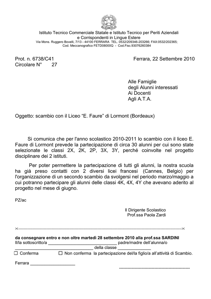 Istituto Tecnico Commerciale Statale e Istituto Tecnico per Periti Aziendali e Corrispondenti in Lingue Estere Via Mons. Ruggero Bovelli, 7/13 - 44100 FERRARA TEL. 0532/209346-203266; FAX:0532/202365; Cod. Meccanografico FETD08000Q - Cod.Fisc.93076260384 Prot. n. 6738/C41 Circolare N° 27 Ferrara, 22 Settembre 2010 Alle Famiglie degli Alunni interessati Ai Docenti Agli A.T.A. Oggetto: scambio con il Liceo “E. Faure” di Lormont (Bordeaux) Si comunica che per l'anno scolastico 2010-2011 lo scambio con il liceo E. Faure di Lormont prevede la partecipazione di circa 30 alunni per cui sono state selezionate le classi 2X, 2K, 2P, 3X, 3Y, perché coinvolte nel progetto disciplinare dei 2 istituti. Per poter permettere la partecipazione di tutti gli alunni, la nostra scuola ha già preso contatti con 2 diversi licei francesi (Cannes, Belgio) per l'organizzazione di un secondo scambio da svolgersi nel periodo marzo/maggio a cui potranno partecipare gli alunni delle classi 4K, 4X, 4Y che avevano aderito al progetto nel mese di giugno. PZ/ac Il Dirigente Scolastico Prof.ssa Paola Zardi ----------------------------------------------------------------------------------------------------------------------------------------------------------------------------- da consegnare entro e non oltre martedì 28 settembre 2010 alla prof.ssa SARDINI Il/la sottoscritto/a _____________________________ padre/madre dell’alunna/o _________________________________ della classe ______________ Conferma Non conferma la partecipazione del/la figlio/a all’attività di Scambio. Ferrara ___________________ --------------------------------------------------