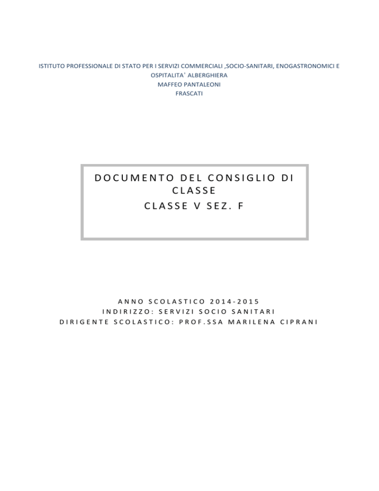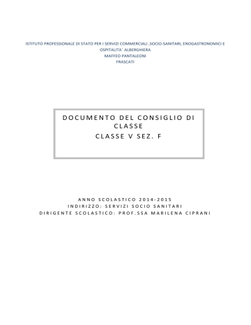 ISTITUTO PROFESSIONALE DI STATO PER I SERVIZI COMMERCIALI ,SOCIO-‐SANITARI, ENOGASTRONOMICI E OSPITALITA’ ALBERGHIERA MAFFEO PANTALEONI FRASCATI D O C U M E N T O D E L C O N S I G L I O D I CLASSE C L A S S E V S E Z . F A N N O S C O L A S T I C O 2 0 1 4 -‐ 2 0 1 5 I N D I R I Z Z O : S E R V I Z I S O C I O S A N I T A R I D I R I G E N T E S C O L A S T I C O : P R O F . S S A M A R I L E N A C I P R A N I Istituto professionale di stato “Maffeo Pantaleoni” Dirigente scolastico: Prof.ssa Marilena Ciprani DOCUMENTO DEL CONSIGLIO DI CLASSE Anno scolastico 2014/2015 • • Classe 5^ sez. F Indirizzo : Operatore servizi socio sanitari Coordinatrice : Prof.ssa Marta Esuperanzi Composizione del Consiglio di classe: Docente MATERIA insegnata Religione Aniceto Adriana Italiano Esuperanzi Marta Storia Esuperanzi Marta Lingua straniera -‐ Inglese Agnese Rosa Lingua straniera -‐ Francese Ventriglia Santina – Spalletta Sara Psicologia gen.le e applicata Vittori Marina Cultura medica D’Alessandro Ermelinda Matematica Smacchia Arcangela Diritto Di Salvatore Maria Pia Tecnica amministrativa ed Economia sociale Romani Giancarlo Scienze motorie e sportive Broccolato Walter Sostegno Tavaniello Brigida Greco Michele Il Consiglio di classe ha designato i commissari interni titolari di materie diverse da quelle affidate ai membri esterni. Segue l’elenco dei docenti individuati come commissari interni: DOCENTE COMMISSARIO INTERNO -‐ MATERIA Prof.Broccolato Walter ( Scienze motorie e sportive ) Prof.ssa Esuperanzi Marta ( Italiano e Storia) Prof. Romani Giancarlo (Tecnica amministrativa) INDICE: 1. 2. 3. 4. 5. 6. 7. 8. 9. 10. 11. 12. 13. 14. 15. 16. PRESENTAZIONE DELL’ISTITUTO ARTICOLAZIONE DELL’OFFERTA FORMATIVA PROFILO PROFESSIONALE DEL DIPLOMATO DEI SERVIZI SOCIO-‐SANITARI PRESENTAZIONE DELLA CLASSE ELENCO DEGLI ALUNNI LIVELLI DI PARTENZA DELLA CLASSE PROFILO SINTETICO DELLACLASSE ATTUALE PROGRAMMAZIONE GENERALE DEL CONSIGLIO DI CLASSE OBIETTIVI OBIETTIVI DIDATTICI DISCIPLINARI COMPETENZE -‐ OBIETTIVI TRASVERSALI METODOLOGIA E TECNICHE D’INSEGNAMENTO – STRUMENTI VERIFICA E VALUTAZIONE CRITERI DI ATTRIBUZIONE DEI CREDITI SCOLASTICI E VALUTAZIONE DEI CREDITI FORMATIVI ATTIVITA’ DI RECUPERO, INTEGRAZIONE E SOSTEGNO, DI APPROFONDIMENTO ATTIVITA’ DI SCUOLA – LAVORO, STAGE, ATTIVITA’ CURRICULARI ED EXTRACURRICULARI, VISITE D’ISTRUZIONE 17. ATTIVITA’ DI ALTERNANZA SCUOLA – LAVORO 18. SIMULAZIONI DELLE PROVE SCRITTE DEGLI ESAMI DI STATO -‐ -‐ -‐ -‐ -‐ -‐ -‐ ALLEGATI Relazioni e programmi delle singole discipline Programmazione didattico – educativa individualizzata alunni Testi delle prove di simulazione svolte Testi di simulazione 1^ prova Testi di simulazione 2^ prova Testi di simulazione 3^ prova -‐ Griglie di valutazione relative alla 1^, 2^,3^ prova scritta e al colloquio degli Esami di Stato 1 PRESENTAZIONE DELL’ISTITUTO Presente nella realtà di Frascati da oltre quaranta anni, il ”Maffeo Pantaleoni” ha da tempo assunto un ruolo importante, costituendosi come qualificato polo di riferimento per la formazione secondaria superiore sia per l’utenza cittadina, sia per quella dei Comuni limitrofi. L’istituto ha sede nella storica “Villa Innocenti” che nel 1970, presa in affitto dal Comune di Frascati, divenne Scuola Professionale. La denominazione della scuola fu dovuta alla volontà del Preside Ippolito di onorare il concittadino Maffeo Pantaleoni, economista di fama mondiale. Più tardi, l’Amministrazione comunale acquistò la villa dandole l’attuale sistemazione. L’Istituto professionale nasce come istituto per il commercio e inizialmente funzionava solo con corsi biennali: stenografia e computisteria. Successivamente al 1962, quando la scuola di avviamento professionale si fonde con la neo scuola media inferiore, nel Professionale vengono attivati corsi triennali per il conseguimento delle qualifiche di : addetti agli uffici turistici; addetti alla contabilità d’azienda; addetti alla segreteria d’azienda; assistenza all’infanzia; accompagnatori turistici. I nuovi corsi sostituiscono i precedenti e la scuola cambia denominazione, viene infatti denominata Istituto Professionale di Stato per i servizi Commerciali, turistici, della pubblicità e sociali. Viene inserito anche il nuovo corso di grafica pubblicitaria. Successivamente, il progetto scolastico è rinnovato con la delibera del progetto 2002, un proseguo del progetto ’98 con rivisitazione di alcuni contenuti. In questa nuova struttura progettuale alcune discipline, nel primo biennio, con la riduzione oraria lasciano maggiore spazio a quelle di tipo professionalizzanti. Anche la riduzione settimanale delle ore di lezioni concorrono al rinnovo didattico. L’anno scolastico 2010/2011 vede un nuovo cambiamento, quello della Riforma Gelmini con la quale si introduce il nuovo ordinamento dal primo anno, che proprio nell’attuale anno scolastico è andato a regime. Pertanto gli indirizzi presenti nel nostro istituto sono: Servizi socio-‐sanitari; Servizi commerciali; servizi commerciali con opzione “promozione commerciale e pubblicitaria”; Servizi per l’enogastronomia e ospitalità alberghiera. La riforma ha puntato all’integrazione con il territorio e il mondo produttivo; infatti il riordino degli istituti professionali risponde all’esigenza di organizzare percorsi formativi quinquennali, finalizzati al conseguimento di un titolo di studio, fondati su una solida base di istruzione generale e tecnico-‐ professionale riferita a filiere produttive di rilevanza nazionale e locale. Pur concordi sulle finalità della riforma non si può, però, prescindere da ciò che essa ha comportato come conseguenza al nostro istituto stravolgendo quella che era la sua identità. Gli indirizzi che qualificavano il “Maffeo Pantaleoni” tranne quello socio-‐sanitario, sono venuti meno, anche se grazie agli spazi di flessibilità e le quote di autonomia l’isti