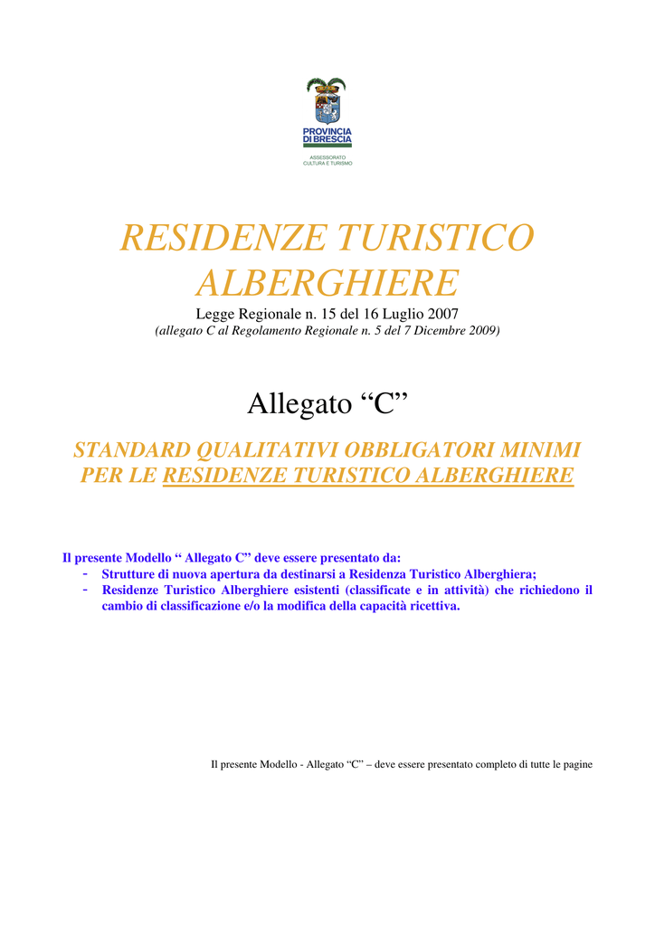 RESIDENZE TURISTICO ALBERGHIERE Legge Regionale n. 15 del 16 Luglio 2007 (allegato C al Regolamento Regionale n. 5 del 7 Dicembre 2009) Allegato “C” STANDARD QUALITATIVI OBBLIGATORI MINIMI PER LE RESIDENZE TURISTICO ALBERGHIERE Il presente Modello “ Allegato C” deve essere presentato da: - Strutture di nuova apertura da destinarsi a Residenza Turistico Alberghiera; - Residenze Turistico Alberghiere esistenti (classificate e in attività) che richiedono il cambio di classificazione e/o la modifica della capacità ricettiva. Il presente Modello - Allegato “C” – deve essere presentato completo di tutte le pagine RESIDENZE TURISTICO ALBERGHIERE a 2 stelle 1. SERVIZIO DI RICEVIMENTO E DI PORTINERIA INFORMAZIONE assicurato 12/24 ore 1.1 Servizio di notte addetto disponibile a chiamata 2. SERVIZI ALLE CAMERE 2.1 Servizio di pulizia nelle camere ad ogni cambio di cliente e due volte alla settimana 2.2 Cambio della biancheria da camera (camera all’interno della unità abitativa ed eventuale camera esterna all’unità abitativa) e da bagno ad ogni cambio del cliente e due volte alla settimana, salvo diversa scelta del cliente a tutela dell’ambiente 3. SERVIZI VARI Assistenza di manutenzione delle unità abitative e di riparazione e sostituzione di arredi, corredi e dotazioni 4. SALE O AREE COMUNI Un’area per uso comune (che può coincidere con la sala ristorante o il bar) 5. DOTAZIONE DELL’ESERCIZIO ALBERGHIERO 5.1 Riscaldamento in tutto l’esercizio: unità abitative ed eventuali parti comuni (l’obbligo non sussiste per gli esercizi con licenza stagionale estiva) 5.2 Ascensore negli esercizi con locali oltre i primi due piani, escluso il piano terreno (con possibilità di deroga per gli esercizi esistenti se non realizzabile in base alle normative vigenti) 5.3 Posto telefonico per clienti 6. DOTAZIONE DELLE UNITA’ ABITATIVE 6.1 Dotazioni per il soggiorno ed il pernottamento letti e coperte pari al numero delle persone ospitabili armadio, cassetti, grucce, comodini o ripiani, illuminazione, lampade o appliques tavolo per la consumazione dei pasti con sedie pari al numero dei posti letto 6.2 Per la preparazione dei cibi cucina con due fuochi o piastre e relativa alimentazione frigorifero lavello con scolapiatti per ciascuna persona ospitabile 2 coltelli 2 forchette 2 cucchiai 2 piatti piani 1 piatto fondo 2 bicchieri 1 tazza 1 tazzina per ciascuna unità abitativa 1 batteria da cucina 2 coltelli da cucina 1 zuccheriera 1 caffettiera 1 scolapasta 1 1 mestolo 1 insalatiera 1 grattugia 1 spremiagrumi 1 apribottiglia/cavatappi 1 bricco per il latte 1 pattumiera con sacchetti di plastica tovaglia, tovaglioli e canovacci da cucina 6.3 Dotazioni generali impianto di erogazione acqua calda e fredda scopa, paletta, secchio, ramazza, straccio per pavimenti 7. DOTAZIONE DEI BAGNI lavandino, doccia o vasca, tazza 7.1 Oggettistica e materiale d’uso per l’igiene della persona saponetta telo bagno per persona asciugamano per persona salvietta per persona carta igienica con riserva sacchetti igienici cestino rifiuti specchio e contigua presa per energia elettrica mensola scopino Segno distintivo della classe che verrà assegnata dalla Provincia, realizzato in conformità al modello stabilito dalla Regione Lombardia, esposto in modo visibile all’esterno e all’interno della Residenza Turistico Alberghiera (Delibera Giunta Regione Lombardia 15 gennaio 1985 n. 47073) – (Da installare successivamente al rilascio del provvedimento di classificazione) (esempio classe 4 stelle) RESIDENZE TURISTICO ALBERGHIERE a 3 stelle 1. SERVIZIO DI RICEVIMENTO E DI PORTINERIA INFORMAZIONE assicurato 14/24 ore da personale addetto 1.1 Servizio di notte addetto disponibile a chiamata 1.2 Servizio di trasporto bagagli assicurato 8/24 ore 1.3 Servizio di custodia valori 2. SERVIZIO BAR in locale comune o nelle unità abitative, assicurato 12/24 ore 3. SERVIZI ALLE CAMERE 3.1 Servizio di pulizia nelle camere ad ogni cambio di cliente e a giorni alterni 2 3.2 Cambio della biancheria da camera (camera all’interno della unità abitativa ed eventuale camera esterna all’unità abitativa) ad ogni cambio di cliente e a giorni alterni 3.3 Cambio della biancheria da bagno tutti i giorni 4. LINGUE ESTERE correntemente parlate dal personale di ricevimento portineria-informazioni: 1 lingua 5. SERVIZI VARI Assistenza di manutenzione delle unità abitative e di riparazione e sostituzione di arredi, corredi e dotazioni 6. SALE O AREE COMUNI una sala di uso comune di superficie complessiva (esclusa l’eventuale sala ristorante o il bar con licenza separata di pubblico esercizio) non inferiore a mq. 4 per ognuna delle prime 10 unità abitative, mq. 1 per ognuna delle ulteriori unità abitative fino alla ventesima e di mq. 0,5 per ogni unità oltre la ventesima 7. DOTAZIONE DELL’ESERCIZIO ALBERGHIERO 7.1 Riscaldamento in tutto l’esercizio: unità abitative ed eventuali parti comuni (l’obbligo non sussiste per gli esercizi con licenza stagionale estiva) 7.2 Ascensore negli esercizi con locali oltre i primi due piani, escluso il piano terreno (con possibilità di deroga per gli esercizi esistenti se non realizzabile in base alle normative vigenti) 7.3 Aria condizionata o impianto di raffrescamento (L’obbligo non sussiste per gli esercizi posti ad una altitudine superiore ai 600 metri s.l.m.) 7.4 Posto telefonico per clienti 8. DOTAZIONE DELLE UNITA’ ABITATIVE 8.1 Dotazioni per il soggiorno ed il pernottamento letti e coperte pari al numero delle persone ospitabili armadio, cassetti, grucce, comodini o ripiani, illuminazione, lampade o appliques tavolo per la consumazione dei pasti con sedie pari al numero dei posti letto poltrone o divano nel soggiorno 8.2 Dotazione per la preparazione dei cibi cucina con due fuochi o piastre e relativa alimentazione frigorifero lavello con scolapiatti per ciascuna persona ospitabile 2 coltelli 2 forchette 2 cucchiai 2 piatti piani 1 piatto fondo 2 bicchieri 1 tazza 1 tazzin