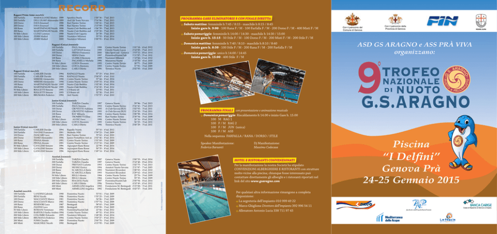 RECORD 7°ed. 2013 7°ed. 2013 7°ed. 2013 7°ed. 2013 7°ed. 2013 7°ed. 2013 7°ed. 2013 8°ed. 2014 8°ed. 2014 Junior (Unica) femminile 100 Farfalla TARZIA Claudia 200 Farfalla PAUL Simona 100 Dorso CROVETTO Adriana 200 Dorso CROVETTO Adriana 100 Rana BAT Mihaela 200 Rana TROMBETTI Elisa 50 Stile Libero ALESCI Sara 100 Stile Libero COSTA Eleonora 200 Stile Libero CARLI Diletta Junior (Unica) maschile 100 Farfalla CARLIER Davide 200 Farfalla PAVONE Francesco 100 Dorso PANCARI Luca 200 Dorso TASSO Alessandro 100 Rana PINNA Alessio 200 Rana PINNA Alessio 50 Stile Libero GANGEMI Simone 100 Stile Libero GANGEMI Simone 200 Stile Libero GANGEMI Simone Assoluti maschile 100 Farfalla 200 Farfalla 100 Dorso 200 Dorso 100 Rana 200 Rana 50 Stile Libero 100 Stile Libero 200 Stile Libero 400 Stile Libero 200 Misti 400 Misti 1994 1991 1993 1996 1991 1991 1996 1996 1996 Rapallo Nuoto Multedo 1930 Rari Nantes Torino Junior Pentathlon Asti as Centro Nuoto Torino Centro Nuoto Torino Aqvasport Rane Rosse Aqvasport Rane Rosse Aqvasport Rane Rosse Assoluti femminile 100 Farfalla 200 Farfalla 100 Dorso 200 Dorso 100 Rana 200 Rana 50 Stile Libero 100 Stile Libero 200 Stile Libero 400 Stile Libero 200 Misti 400 Misti LANDINI Gabriele 1990 BENI Nicolò 1986 MACCIANTI Marco 1981 MACCIANTI Marco 1981 RESIDORI Luca 1987 PIZZINI Luca 1989 ROMANI Tommaso 1992 BARTOLO Sasha Andrea1994 COLOMBO Edoardo 1995 BRUMANA Federico 1994 FOSSI Claudio 1989 MASCHILE Nicolò 1990 1997 1992 1995 1995 1998 1993 1998 1995 1996 55”10 1’59”23 55”62 2’02”46 1’01”69 2’15”10 22”99 50”35 1’49”14 TARZIA Claudia TARZIA Claudia PREVIATI Carlotta MUSSO Enrica SCARCELLA Ilaria SCARCELLA Ilaria REGLI Alessia REGLI Alessia BIAGIOLI Paola CARLI Diletta ARMELLINI Angelica ARMELLINI Angelica Fiorentina Nuoto Fiorentina Nuoto Fiorentina Nuoto Fiorentina Nuoto Bentegodi Bentegodi FiorentinaNuotoClub Centro Nuoto Torino Nuotatori Milanesi Centro Nuoto Torino Fiorentina Nuoto Bentegodi - 1997 1997 1993 1994 1993 1993 1984 1984 1997 1996 1992 1992 53”01 1’55”25 54”06 1’57”74 58”65 2’09”09 22”66 49”52 1’48”08 3’50”27 2’00”70 4’15”95 6°ed. 2012 7°ed. 2013 8°ed. 2014 5°ed. 2011 6°ed. 2012 4°ed. 2010 3°ed. 2009 3°ed. 2009 4°ed. 2010 TROFEO Domenica mattina: femminile h 7:40 / 8:10 - maschile h 8:10 / 8:40 Inizio gare h. 8:50 - 100 Stile F / M - 200 Rana F / M - 200 Farfalla F / M Domenica pomeriggio: unico h 14:00 / 14:45 Inizio gare h. 15:00 - 400 Stile F / M 3°ed. 2009 3°ed. 2009 3°ed. 2009 3°ed. 2009 3°ed. 2009 3°ed. 2009 6°ed. 2012 8°ed. 2014 8°ed. 2014 8°ed. 2014 3°ed. 2009 3°ed. 2009 9 ASD GS ARAGNO e ASS PRÀ VIVA organizzano: ° TROFEO NAZIONALE 59”96 2’16”41 1’02”93 2’16”20 1’08”98 2’30”54 26”16 56”25 2’00”29 - 7°ed. 2013 7°ed. 2013 5°ed. 2011 5°ed. 2011 8°ed. 2014 3°ed. 2009 8°ed. 2014 5°ed. 2011 5°ed. 2011 PROGRAMMA FINALI con presentazione e animazione musicale Domenica pomeriggio: Riscaldamento h 14.00 e inizio Gare h. 15.00 100 M RAG 1 100 F / M RAG 2 100 F / M JUN (unica) 100 F / M ASS Nella sequenza FARFALLA / RANA / DORSO / STILE 6°ed. 2012 3°ed. 2009 4°ed. 2010 8°ed. 2014 3°ed. 2009 3°ed. 2009 8°ed. 2014 8°ed. 2014 8°ed. 2014 Genova Nuoto Genova Nuoto Centro Nuoto Torino Amatori Nuoto Savona Nuotatori Rivarolesi Nuotatori Rivarolesi Centro Nuoto Torino Centro Nuoto Torino FiorentinaNuotoClub Tirrenica Nuoto Fondazione M. Bentegodi Fondazione M. Bentegodi - - 4°ed. 2010 4°ed. 2010 8°ed. 2014 8°ed. 2014 8°ed. 2014 8°ed. 2014 5°ed. 2011 5°ed. 2011 4°ed. 2010 Genova Nuoto Centro Nuoto Torino A-Club-Savosa (SUI) A-Club-Savosa (SUI) Centro Nuoto Torino Rari Nantes Torino Centro Nuoto Torino Centro Nuoto Torino Tirrenica Nuoto - 1’01”18 2’14”85 1’03”11 2’21”07 1’10”66 2’33”70 26”71 57”91 2’02”95 Sabato pomeriggio: femminile h 14:00 / 14:30 - maschile h 14:30 / 15:00 Inizio gare h. 15:15 - 50 Stile F / M - 100 Dorso F / M - 200 Misti F / M - 200 Stile F / M Speaker Manifestazione: Federica Barsanti 1’00”33 2’14”48 1’02”75 2’11”87 1’08”83 2’29”62 25”76 55”35 2’00”94 4’10”49 2’15”08 4’43”57 - 8°ed. 2014 8°ed. 2014 7°ed. 2013 7°ed. 2003 4°ed. 2010 4°ed. 2010 3°ed. 2009 3°ed. 2009 8°ed. 2014 6°ed. 2012 5°ed. 2011 5°ed. 2011 Dj Manifestazione: Massimo Codecasa NUOTO HOTEL E RISTORANTI CONVENZIONATI Per la manifestazione la nostra Società ha stipulato CONVENZIONI ALBERGHIERE E RISTORANTI con strutture molto vicine alla piscina; chiunque fosse interessato può contattare direttamente gli alberghi e i ristoranti riportati nel link del sito www.gsaragno.com Per qualsiasi altra informazione rimangono a completa disposizione: La segreteria dell’impianto 010 999 49 22 Marco Ghiglione Direttore dell’impianto 392 996 54 11 Allenatore Antonio Lucia 338 711 97 45 di NUOTO ARAG S. ● NO 57”25 2’04”87 57”44 2’05”33 1’02”49 2’16”45 23”95 52”30 1’53”57 O T RAPALLO Nuoto RAPALLO Nuoto Centro Nuoto Torino Centro Nuoto Torino Nuoto Club Brebbia Nuoto Club Brebbia CS Roero srl CS Roero srl Asti Nuoto Con il patrocinio della Provincia di Genova Con il patrocinio del Comune di Genova NUO Ragazzi (Unica) maschile 100 Farfalla CARLIER Davide 1994 200 Farfalla CARLIER Davide 1994 100 Dorso MIRESSI Alessandro 1998 200 Dorso MIRESSI Alessandro 1998 100 Rana MARTINENGHI Nicolo’ 1999 200 Rana MARTINENGHI Nicolo’ 1999 50 Stile Libero BOGGETTI Simone 1995 100 Stile Libero BOGGETTI Simone 1995 200 Stile Libero BRUMARA Federico 1994 Sabato mattina: femminile h 7:45 / 8:15 - maschile h 8:15 / 8:45 Inizio gare h. 9:00 - 100 Rana F / M - 100 Farfalla F / M - 200 Dorso F / M - 400 Misti F / M TO Ragazzi (Unica) femminile 100 Farfalla PAUL Simona 1998 Centro Nuoto Torino 200 Farfalla LATTANZI Jessica 1999 Circolo Nuoto Lucca 100 Dorso FRESIA Francesca 2000 Idea Sport ssd - Genova 200 Dorso SERNI Daria 1997 FiorentinaNuoto