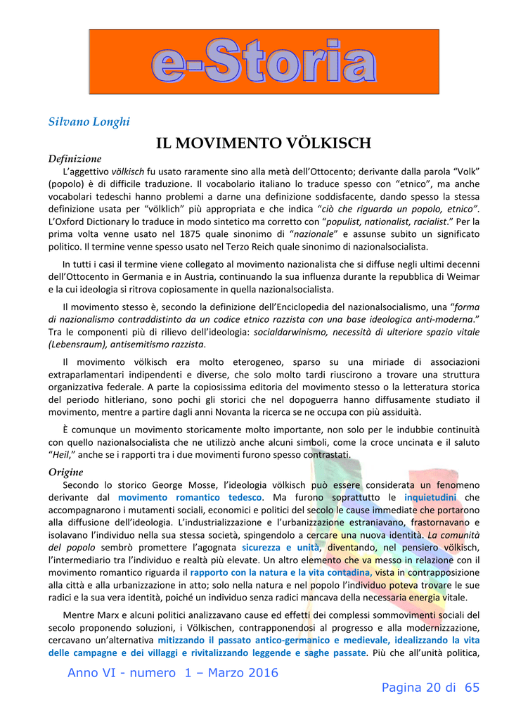 Silvano Longhi IL MOVIMENTO VÖLKISCH Definizione L’aggettivo völkisch fu usato raramente sino alla metà dell’Ottocento; derivante dalla parola “Volk” (popolo) è di difficile traduzione. Il vocabolario italiano lo traduce spesso con “etnico”, ma anche vocabolari tedeschi hanno problemi a darne una definizione soddisfacente, dando spesso la stessa definizione usata per “völklich” più appropriata e che indica “ciò che riguarda un popolo, etnico”. L’Oxford Dictionary lo traduce in modo sintetico ma corretto con “populist, nationalist, racialist.” Per la prima volta venne usato nel 1875 quale sinonimo di “nazionale” e assunse subito un significato politico. Il termine venne spesso usato nel Terzo Reich quale sinonimo di nazionalsocialista. In tutti i casi il termine viene collegato al movimento nazionalista che si diffuse negli ultimi decenni dell’Ottocento in Germania e in Austria, continuando la sua influenza durante la repubblica di Weimar e la cui ideologia si ritrova copiosamente in quella nazionalsocialista. Il movimento stesso è, secondo la definizione dell’Enciclopedia del nazionalsocialismo, una “forma di nazionalismo contraddistinto da un codice etnico razzista con una base ideologica anti-moderna.” Tra le componenti più di rilievo dell’ideologia: socialdarwinismo, necessità di ulteriore spazio vitale (Lebensraum), antisemitismo razzista. Il movimento völkisch era molto eterogeneo, sparso su una miriade di associazioni extraparlamentari indipendenti e diverse, che solo molto tardi riuscirono a trovare una struttura organizzativa federale. A parte la copiosissima editoria del movimento stesso o la letteratura storica del periodo hitleriano, sono pochi gli storici che nel dopoguerra hanno diffusamente studiato il movimento, mentre a partire dagli anni Novanta la ricerca se ne occupa con più assiduità. È comunque un movimento storicamente molto importante, non solo per le indubbie continuità con quello nazionalsocialista che ne utilizzò anche alcuni simboli, come la croce uncinata e il saluto “Heil,” anche se i rapporti tra i due movimenti furono spesso contrastati. Origine Secondo lo storico George Mosse, l’ideologia völkisch può essere considerata un fenomeno derivante dal movimento romantico tedesco. Ma furono soprattutto le inquietudini che accompagnarono i mutamenti sociali, economici e politici del secolo le cause immediate che portarono alla diffusione dell’ideologia. L’industrializzazione e l’urbanizzazione estraniavano, frastornavano e isolavano l’individuo nella sua stessa società, spingendolo a cercare una nuova identità. La comunità del popolo sembrò promettere l’agognata sicurezza e unità, diventando, nel pensiero völkisch, l’intermediario tra l’individuo e realtà più elevate. Un altro elemento che va messo in relazione con il movimento romantico riguarda il rapporto con la natura e la vita contadina, vista in contrapposizione alla città e alla urbanizzazione in atto; solo nella natura e nel popolo l’individuo poteva trovare le sue radici e la sua vera identità, poiché un individuo senza radici mancava della necessaria energia vitale. Mentre Marx e alcuni politici analizzavano cause ed effetti dei complessi sommovimenti sociali del secolo proponendo soluzioni, i Völkischen, contrapponendosi al progresso e alla modernizzazione, cercavano un’alternativa mitizzando il passato antico-germanico e medievale, idealizzando la vita delle campagne e dei villaggi e rivitalizzando leggende e saghe passate. Più che all’unità politica, Anno VI - numero 1 – Marzo 2016 Pagina 20 di 65 raggiunta in Germania nel corso del secolo, i Völkische aspiravano alla vera unità, cioè quella del popolo, che veniva minacciata dal progresso economico e sociale accelerato proprio dal processo di unità politica. Anche se questo articolo si occupa per lo più degli sviluppi in Germania, va tenuto presente che il movimento völkisch era parimenti diffuso anche tra la popolazione austriaca dell’impero danubiano e l’aspirazione völkisch di unione di tutti i tedeschi riguardava anche questi. Pertanto il termine tedesco vale nel prosieguo per la popolazione germanica di entrambi gli stati. Quello völkisch fu un movimento collettore nel quale confluirono coloro che, per qualche motivo, ritenevano impellente riformare uno o più aspetti della società tedesca, come il settore agrario, artistico, sociale ed economico, la lingua tedesca, ecc. e comprendeva inoltre ammiratori e seguaci di Bismarck, Gobineau, Wagner, Chamberlain, insieme ad anti-papisti, antisemiti, ecc. In comune sentivano tutti l’esigenza della rinascita della cultura nazionale in tema di religione e di razza, liberandola da elementi estranei. All’eterogeneità degli esponenti e delle correnti corrispose la multiforme organizzazione, che andava dalle semplici riunioni serali in un locale a vere e proprie associazioni, federazioni, logge e ordini, con l’edizione di numerose riviste e testi. Gli esponenti völkisch non intendevano fondare un partito politico, ma influenzare scelte politiche, infiltrandosi in tutti gli strati sociali. Il nucleo duro del movimento contava, alla vigilia della 1a guerra mondiale non più di 10.000 membri, quasi esclusivamente uomini. Nonostante il numero relativamente modesto, costoro, tramite una efficace e diffusa propaganda, riuscirono a raggiungere un vasto pubblico. A cavallo del secolo, ben 93 deputati del Reichstag tedesco erano membri del Alldeutscher Verband (Confederazione pantedesca), tra le più potenti organizzazioni del nazionalismo völkisch tedesco. Nazionalismo Nell’impero multinazionale austriaco, escluso nel 1866 dal Bund tedesco, impegnato nella ricerca di una soluzione del problema ungherese era molto vivo il movimento nazionale tedesco che tendeva all’unità di tutti i popoli tedeschi, distinguendosi così dagli altri popoli dell’impero, prendendo contemporaneamente le distanze d