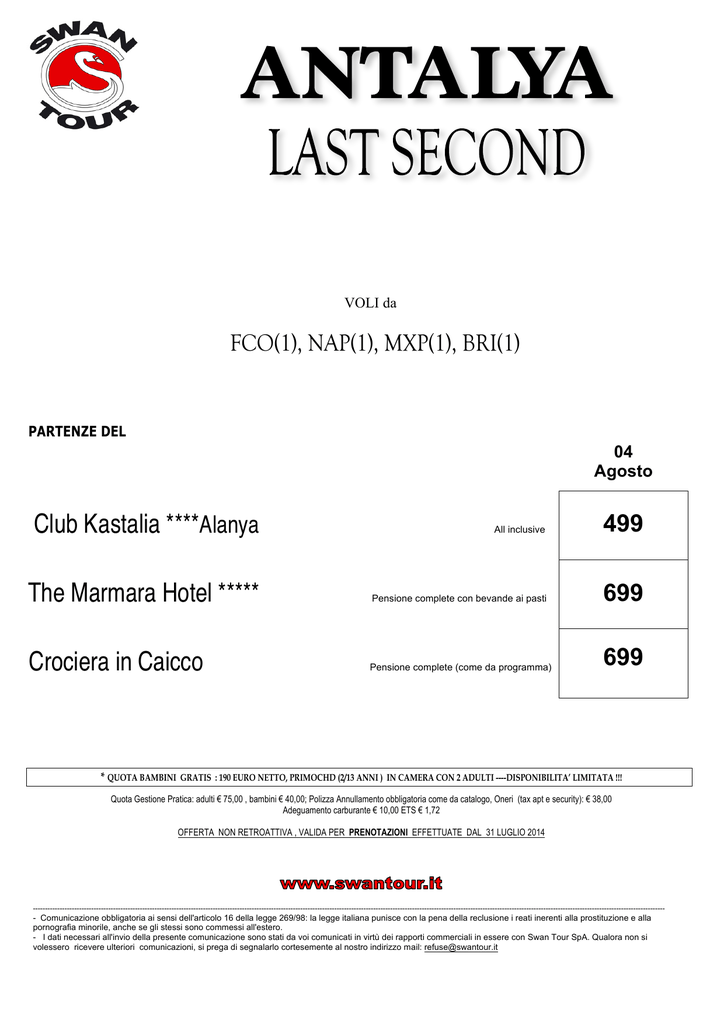 VOLI da FCO(1), NAP(1), MXP(1), BRI(1) PARTENZE DEL 04 Agosto Club Kastalia ****Alanya All inclusive 499 The Marmara Hotel ***** Pensione complete con bevande ai pasti 699 Crociera in Caicco Pensione complete (come da programma) 699 * QUOTA BAMBINI GRATIS : 190 EURO NETTO, PRIMOCHD (2/13 ANNI ) IN CAMERA CON 2 ADULTI ----DISPONIBILITA’ LIMITATA !!! Quota Gestione Pratica: adulti € 75,00 , bambini € 40,00; Polizza Annullamento obbligatoria come da catalogo, Oneri (tax apt e security): € 38,00 Adeguamento carburante € 10,00 ETS € 1,72 OFFERTA NON RETROATTIVA , VALIDA PER PRENOTAZIONI EFFETTUATE DAL 31 LUGLIO 2014 -------------------------------------------------------------------------------------------------------------------------------------------------------------------------------------------------------------------------------------------------------------------- - Comunicazione obbligatoria ai sensi dell'articolo 16 della legge 269/98: la legge italiana punisce con la pena della reclusione i reati inerenti alla prostituzione e alla pornografia minorile, anche se gli stessi sono commessi all'estero. - I dati necessari all'invio della presente comunicazione sono stati da voi comunicati in virtù dei rapporti commerciali in essere con Swan Tour SpA. Qualora non si volessero ricevere ulteriori comunicazioni, si prega di segnalarlo cortesemente al nostro indirizzo mail: [email protected]