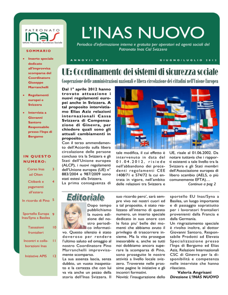 L’INAS NUOVO Periodico d’informazione interna e gratuita per operatori ed agenti sociali del Patronato Inas Cisl Svizzera SOMMARIO Inserto speciale dedicato all’improvvisa scomparsa del Coordinatore Regolamenti Intervista a Giovanni Santoro Responsabile presso l’Inps di Bergamo IN QUESTO NUMERO: Corso Inas 3 ad Olten Citibank e 4 pagamenti all’estero Sportello Europa 9 Inas/Syna a Basilea 10 frontalieri Incontri e colla- 11 borazioni Inas Iniziative APIS 2 0 1 2 Dal 1° aprile 2012 hanno tro v a to a ttu a z io n e i nuovi regolamenti europei anche in Svizzera. A tal proposito intervistiamo Elias Aziz relazioni i n te rn a z io n a l i Ca s sa Svizzera di Compensazione di Ginevra, per chiedere quali sono gli attuali cambiamenti in proposito. Con il terzo ammendamento dell’Accordo sulla libera circolazione delle persone concluso tra la Svizzera e gli Stati dell’Unione europea (ALCP), i nuovi regolamenti dell’Unione europea (UE) n° 883/2004 e 987/2009 sono stati estesi alla Svizzera. La prima conseguenza di tale modifica, il cui effetto è intervenuto in data del 01.04.2012, risiede nell’abbandono dei precedenti regolamenti CEE 1408/71 e 574/72 la cui entrata in vigore, nell’ambito delle relazioni tra Svizzera e UE, risale al 01.06.2002. Da notare tuttavia che i rapporti esistenti a tale livello tra la Svizzera e gli Stati membri dell’Associazione europea di libero scambio (AELS, o più comunemente EFTA)… Continua a pag 2 Dopo tempo pubblichiamo la nuova edizione del nostro periodico informativo. Questo silenzio è stato doveroso per rendere l’ultimo saluto ed omaggio al nostro Coordinatore Pino Marranchelli improvvisamente scomparso. La sua assenza lascia, senza dubbio, un vuoto inaspettato e la certezza che con lui va via anche un pezzo della storia dell’Inas Svizzera. Il suo ricordo pero’, sarà sempre vivo nei nostri cuori ed a tal proposito, è stato realizzato all’interno di questo numero, un inserto speciale dedicato in suo onore con le foto piu’ belle dei momenti che abbiamo avuto il privilegio di trascorrere insieme. Ma la vita prosegue inesorabile e, anche se tutti noi dobbiamo ancora superare la scomparsa di Pino, sono proseguite le nostre attività a livello locale svizzero. Troverete nelle prossime pagine le iniziative e gli incontri formativi. Novità: l’inaugurazione dello sportello EU Inas/Syna a Basilea, un luogo importante e di passaggio soprattutto per i lavoratori frontalieri provenienti dalla Francia e dalla Germania. Un ringraziamento speciale è rivolto inoltre, al dottor Giovanni Santoro, Responsabile Prodotti ad Elevata Specializzazio ne presso l’Inps di Bergamo ed Elias Aziz, Relazioni Internazionali CSC di Ginevra per la disponibilità e competenza nelle interviste che hanno rilasciato. Valeria Angrisani Direzione L’INAS NUOVO In ricordo di Pino 5 Tassazioni G I U G N O / L U G L I O Cooperazione delle amministrazioni nazionali e libera circolazione dei cittadini nell’Unione Europea europei e Svizzera N ° 2 0 UE: Coordinamento dei sistemi di sicurezza sociale Giuseppe Marranchelli A N N O V I I 12 PAGINA 2 DIRITTO DI INIZIATIVA PER I CITTADINI EUROPEI Dal 1° Aprile 2012 si rende possibile una nuova forma di partecipazione popolare alle decisioni politiche dell’ Unione Europea, l’ I.C.E. (Iniziativa dei Cittadini Europei). Tale strumento è disciplinato dal regolamento UE n. 211/2011 del Parlamento europeo e del Consiglio, del 16 Febbraio 2011 e dalla relativa rettifica dell’UE del 30 Marzo 2012. Il comitato è composto da un minimo di sette persone che vivono in sette diversi Stati UE. Il comitato sottopone l’iniziativa alla Commissione europea che deve rispondere entro due mesi se la proposta soddisfa le condizioni essenziali, successivamente l’iniziativa viene pubblicata nel registro on-line e si puo’ quindi iniziare la raccolta delle firme. E’ necessario che i firmatari provengano da almeno un quarto degli Stati membri dell’UE (almeno sette Stati). Il numero delle dichiarazioni di sostegno deve essere certificato dalle autorità competenti degli Stati membri. La Commissione Europea successivamente, ha tre mesi a disposizione per decidere cosa fare. http://ec.europa.eu/citizensinitiative/public/welcome L’INAS NUOVO Segue da pag 1 ...ovvero con Islanda, Norvegia e Liechtenstein, rimangono vincolati dai regolamenti CEE 1408/71 e 574/72. Rispetto al 1408/71, la finalità del regolamento 883/04 risiede nel semplificare le regole di coordinamento vigenti tra gli Stati membri dell’UE, e a fortiori, tra gli stessi Stati membri e la Svizzera. In altri termini, se lo strument o non ha subito cambiamenti (il principio del coordinamento delle legislazioni dei singoli stati), i metodi scelti per metterlo in atto sono stati oggetto di una modifica di fondo quanto a reattività e collaborazione nel trattare le richieste delle persone sottoposte a dive rs e leg is la zioni (principi detti di “good administration” and “good office”). Ci sono delle differenze rispetto al passato nella gestione delle pratiche collegate a Stati dell’UE? La principale prospettiva dei cambiamenti menzionati risiede nel favorire l’utilizzo degli scambi telematici tra gli Stati tramite la condivisione di comuni piattaforme. Inoltre, maggior attenzione è stata rivolta alle questioni relative ai molteplici rami assicurativi vigenti tra tutti gli Stati (malattia, infortunio, disoccupazione, ecc.). A livello delle attività della Cassa svizzera di Compensazione (CSC), che nel caso specifico interviene in qualità di organismo di collegamento svizzero per l’applicazione delle assicurazioni AVS e AI negli Stati membri dell’UE, il regolamento 883/04 non ha portato sostanziali differenze al livello dell’istruzione delle pratiche. Per quanto concerne l’esportazione delle prestazioni AVS/AI, va tuttavia sottolineato che l’abbandono delle ultime clausole di restrizione tollerate sotto forma di eccezioni nell’ambito di appl