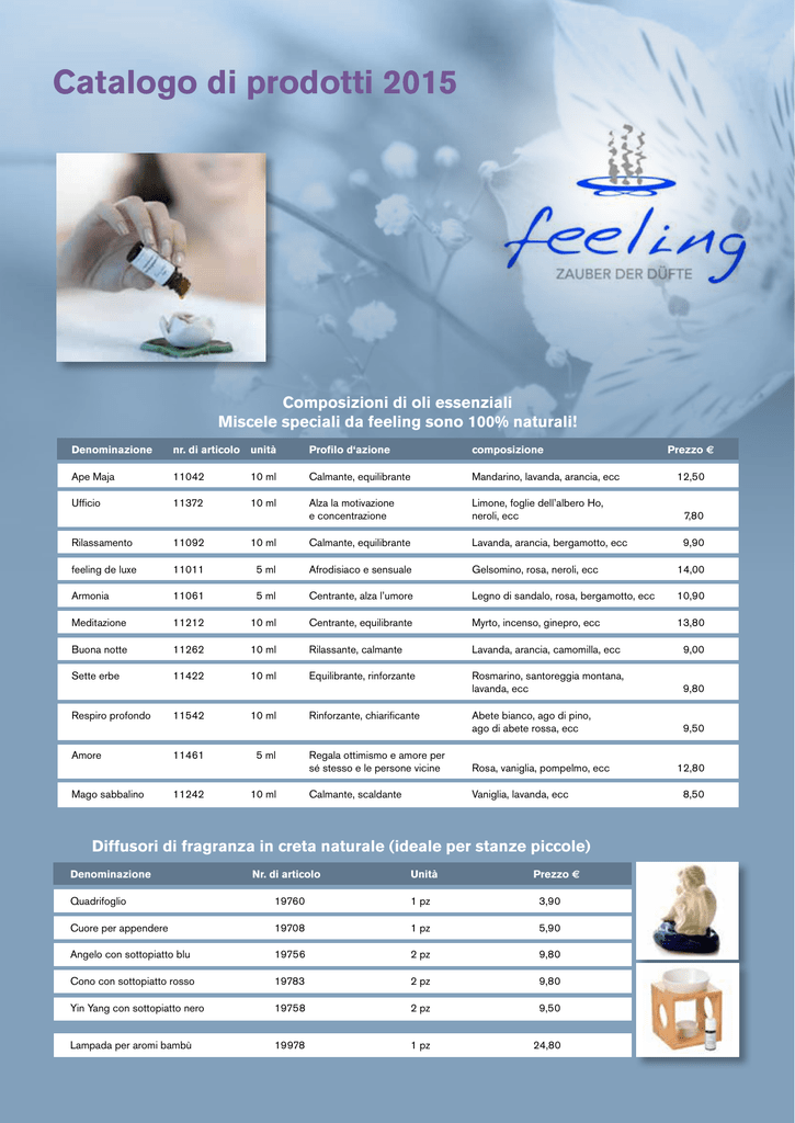 Catalogo di prodotti 2015 Composizioni di oli essenziali Miscele speciali da feeling sono 100% naturali! Denominazione nr. di articolo unità Profilo d‘azione composizione Ape Maja 11042 Calmante, equilibrante Mandarino, lavanda, arancia, ecc Ufficio 11372 10 ml Alza la motivazione e concentrazione Limone, foglie dell’albero Ho, neroli, ecc 7,80 Rilassamento 11092 10 ml Calmante, equilibrante Lavanda, arancia, bergamotto, ecc 9,90 feeling de luxe 11011 5 ml Afrodisiaco e sensuale Gelsomino, rosa, neroli, ecc 14,00 Armonia 11061 5 ml Centrante, alza l’umore Legno di sandalo, rosa, bergamotto, ecc 10,90 Meditazione 11212 10 ml Centrante, equilibrante Myrto, incenso, ginepro, ecc 13,80 Buona notte 11262 10 ml Rilassante, calmante Lavanda, arancia, camomilla, ecc 9,00 Sette erbe 11422 10 ml Equilibrante, rinforzante Rosmarino, santoreggia montana, lavanda, ecc 9,80 Respiro profondo 11542 10 ml Rinforzante, chiarificante Abete bianco, ago di pino, ago di abete rossa, ecc 9,50 Amore 11461 5 ml Regala ottimismo e amore per sé stesso e le persone vicine Rosa, vaniglia, pompelmo, ecc Calmante, scaldante Vaniglia, lavanda, ecc Mago sabbalino 11242 10 ml 10 ml Diffusori di fragranza in creta naturale (ideale per stanze piccole) Denominazione Nr. di articolo Unità Prezzo E Quadrifoglio 19760 1 pz 3,90 Cuore per appendere 19708 1 pz 5,90 Angelo con sottopiatto blu 19756 2 pz 9,80 Cono con sottopiatto rosso 19783 2 pz 9,80 Yin Yang con sottopiatto nero 19758 2 pz 9,50 Lampada per aromi bambù 19978 1 pz 24,80 Prezzo E 12,50 12,80 8,50 Un bel bagno caldo con oli essenziali feeling e oli grassi ha un effetto curante sulla pelle e rafforzante sulle nostre difese autoimmunitarie. Sia in caso di raffreddore, che per rilassarsi o divertirsi in coppia i bagnoschiuma feeling soddisfano ogni desiderio. Tutti i prodotti feeling sono al 100% naturali e privi di emulatori chimici, coloranti e profumi chimici. Il nostro assortimento comprende oli da bagno, bagnoschiuma a base di siero di latte e Sali da bagno. Olio da bagno • Olio da bagno “rilassamento” Il giusto per persone che si sentono stressati e pieno di tensioni. 100 ml – nr. di articolo 13026 – E 16,00 • Olio da bagno “raffreddore” Favorisce l’equilibrio interno e aiuta a poter respirare profondamente. 100 ml – nr. di articolo 13046 – E 14,00 • Olio da bagno “arancia” Confezionato in una bellissima bottiglietta speciale. Favorisce la disintossicazione e regala un rilassamento piacevole. 100 ml – nr. di articolo 13106 – E 14,50 • Olio da bagno “coppia” Confezionato in una bellissima bottiglietta speciale. Riporta movimento nella Vostra convivenza. LasciateVi sorprendere. 100 ml – nr. di articolo 13116 – E 19,50 Sali da bagno • Sale da bagno “fonte d’energia” Ringiovanisce e attiva l’anima ed il corpo. 650 g – nr. di articolo 13098 – E 17,80 • Sale da bagno “disintossicante” Attiva il metabolismo e aiuta la disintossicazione. 700 g – nr. di articolo 13048 – E 17,80 oppure 1 kg nr. di articolo 13148 – E 24,50 • Bagno di siero Un bagno molto particolare! Con un effetto calmante, equilibrante. La sua pelle diventerà morbida come la seta. 400 g – nr. di articolo 13058 – E 14,80 • Sale da bagno per i piedi “Go fresh” Gode ai suoi piedi la cura di essenze rivitalizzante. 200 g – nr. di articolo 13076 – E 11,00 Shampoo e bagno doccia I bagni doccia e gli shampoo feeling sono a base naturale al 100% e per questo si adattano idealmente alla cura giornaliera. I bagni doccia e gli shampoo hanno come elementi base olio di cocco, cera e acido citrico. I nostri prodotti hanno un valore di pH 5,6 e cosi sono ideali anche per persone con la pelle molto delicata e sensibile. • Shampoo extra mite Lo shampoo ideale per adulti e bambini con un profumo delicato e discreto. 200 ml – nr. di articolo 15067 – E 9,50 • Shampoo Frangipani Flair La cura ideale per la pelle ed i capelli con un profumo fiorito – esotico. 200 ml – nr. di articolo 15117 – E 10,80 • Shampoo Fresh Wave Uno shampoo con un profumo fruttato e fresco con una fragranza di cocco. 200 ml – nr. Di articolo 15087 – E 9,50 Nella produzione dei prodotti per la cura del corpo ci serviamo d’ingredienti al 100% naturali e puri. La produzione viene fatta con attenzione e in piccole quantità. Poiché non usiamo conservanti, ci teniamo tanto che la produzione sia sempre fresca presso il nostro laboratorio. Tutti i nostri prodotti sono privi di coloranti e profumi chimici. Bodylotion – Lozione per il corpo Creme per il viso • Soft cream & Bodylotion La base delle nostre lozione, senza profumo. Aggiungendo un olio essenziale può creare la SUA lozione personale. 200 ml – nr. Di articolo 18037 – E 9,50 I nostri prodotti 100% naturali per il viso hanno un effetto nutriente, rassodante e ringiovinante. • Frangipani Flair Lozione con un profumo delicato fiorito – esotico 200 ml -- nr. di articolo 18077 – E 13,00 • Cleopatra Regala la cura della pelle con un profumo seducente 200 ml – nr. di articolo 18017 – E 13,00 Nel vasto assortimento per la cura del corpo vorremmo porre l’accento sui balsami feeling. La nostra grande esperienza in questo settore ci ha portato a poter offrire un balsamo che è liscio e morbido da spalmare. Per la semplicità di utilizzo e per l’effetto positivo e rapido i balsami feeling hanno una grande stima. Gli ingredienti dei balsami feeling sono oli grassi naturali, cera d’api naturale e oli essenziali genuini. Balsami • Balsamo “pronto soccorso” Mitiga piccoli malanni e favorisce la loro guarigione 30 ml – nr. di articolo 18215 – E 11,50 • Balsamo “Cina” Utile in caso di mal di testa, stanchezza, raffreddore, punti d’insetti 15 ml -- nr. di articolo 18003 – E 7,50 • Balsamo per le mani Per la cura ideale delle mani 30 ml -- nr. di articolo 18085 – E 9,90 • Balsamo per i piedi Porta energia immediata ai piedi stanchi e faticati 30 ml -- nr