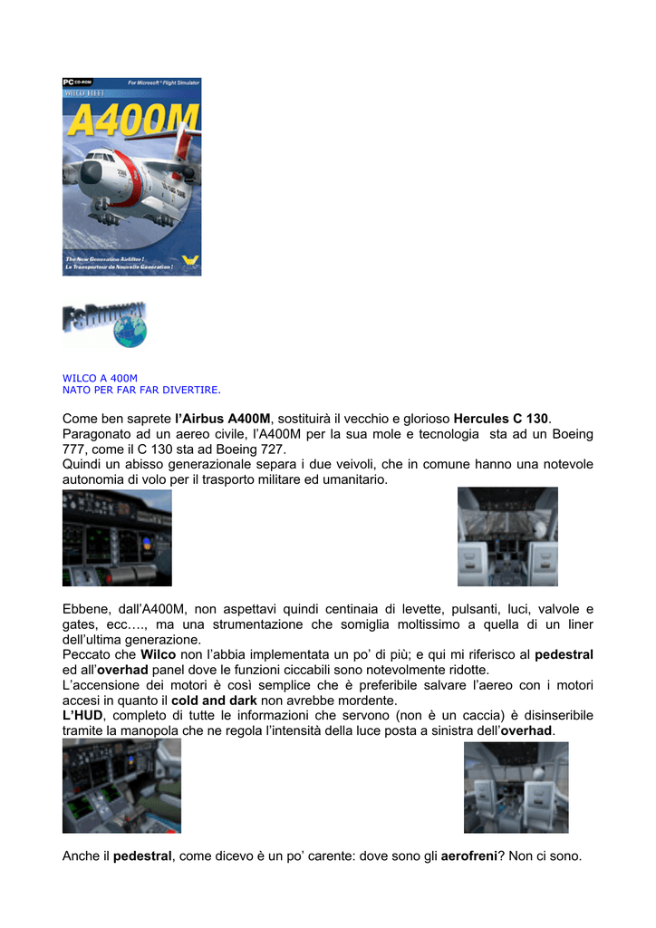 WILCO A 400M NATO PER FAR FAR DIVERTIRE. Come ben saprete l’Airbus A400M, sostituirà il vecchio e glorioso Hercules C 130. Paragonato ad un aereo civile, l’A400M per la sua mole e tecnologia sta ad un Boeing 777, come il C 130 sta ad Boeing 727. Quindi un abisso generazionale separa i due veivoli, che in comune hanno una notevole autonomia di volo per il trasporto militare ed umanitario. Ebbene, dall’A400M, non aspettavi quindi centinaia di levette, pulsanti, luci, valvole e gates, ecc…., ma una strumentazione che somiglia moltissimo a quella di un liner dell’ultima generazione. Peccato che Wilco non l’abbia implementata un po’ di più; e qui mi riferisco al pedestral ed all’overhad panel dove le funzioni ciccabili sono notevolmente ridotte. L’accensione dei motori è così semplice che è preferibile salvare l’aereo con i motori accesi in quanto il cold and dark non avrebbe mordente. L’HUD, completo di tutte le informazioni che servono (non è un caccia) è disinseribile tramite la manopola che ne regola l’intensità della luce posta a sinistra dell’overhad. Anche il pedestral, come dicevo è un po’ carente: dove sono gli aerofreni? Non ci sono. Tranquilli, probabilmente Wilco, essendo la loro escursione ridottissima, per non appesantire l’aereo con comandi che avrebbero avuto poco senso, ha preferito abilitare e disabilitare la funzione attraverso la lettera “ù “ della tastiera. Questi a nostro parere i punti di debolezza. Pochi se vogliamo e comunque non fondamentali ai fini di una buona simulazione e quindi del piacere ludico. Proseguendo andiamo a scoprire il meglio dell’A400M. Iniziamo dalle dinamiche di volo: semplicemente eccellenti. Come nella realtà la maneggevolezza è sorprendente, quasi da sembrare che i limiti imposti dalle leggi della fisica si possano superare; virate quasi a 90° senza che l’odiosa vocina ripeta a raffica TAKE AND GO. Il FADEC- Full Authority Digital Engine Control- anche nel virtuale fa un ottimo lavoro. L’aereo per i perfezionisti, andrebbe pilotato con il Joystick e non con il Yoke, ma provando sia l’uno che l’altro ( CH Products) non abbiamo rilevato differenze particolari, se non quella di maggiore dolcezza a discapito della prontezza da parte del Yoke, comunque sono dettagli irrilevanti. Venti, vuoti d’aria, termiche vengono riprodotte in maniera “perfetta” dal potente quadrimotore turboelica, il quale vanta di una velocità massima di 0.77 mach a 37.000 ft: niente male. Il Load-Manager implementa solamente il peso di stipare nel vano cargo. Attenzione, la cosa è abbastanza macchinosa, il L.M. prevede merci ed autoveicoli caricando o l’uno o l’altro. All’avvio di FS2004 di default abbiamo una Jeep o due, una jeep ed un camion. Ciò che si opziona va ad aggiungersi al peso delle merci. Se non Load-Manager vengono selezionati tre camion, il default di FS mi darà sempre la sequenza di quanto sopra, ma il carico assumerà il peso del Load-Manager. Per aprire e chiudere il portellone posteriore il classico menù Concorde non funziona molto bene, quindi meglio provare con il control+shift+lettera o numero; noi abbiamo provato con c+s+s e lo si chiude con c+s+2 (tn). Il VC, pur essendo molto meno luminoso del 2d, non rallenta minimamente il Frame rate e tutte le funzioni sono cliccabili avvicinandosi adeguatamente con la rotellina del mouse. Con la stessa rotellina si accede al vano cargo, dove andremo a verificare le nostre preziose merci. FMGC, si proprio lui, ovvero Flight Managemet and Guidance Computer. Dimenticate l’FMC di qualsiasi altro add-on che possedete, nell’FMCG ad esempio è sufficiente ciccare sull’aereporto di destinazione ( nel visore, qui non esistono i tasti L/R ), si apre un sottomenù dal quale si seleziona la pista. Se è previsto l’ILS, la frequenza radio ed il CRS si memorizzano automaticamente sia nell’FMGC sia sul pannello radio del cruscotto dell’aereo. Clicchiamo sulla star e quindi sull’eventuale transitino e nel giro di un secondo il tutto viene memorizzato. Si può importare anche il piano di volo da FS, ma lo sconsigliamo poiché si può solamente cancellare un FIX ma non si può riscrivere. Consigliamo pertanto un buon programma di rotta come FS BUILD e le immancabili mappe Jeppesen. L’avvicinamento e l’atterraggio si possono fare sia in ILS che in Autoland. Anche chi preferisce il volo VOR to VOR non sarà scontentato. • • • • • • • • • • • • • • • • • • • • • • • • • • • • • • GENERAL FEATURES Highly detailed replica of the Airbus A400M GMax exterior/interior models Complete and detailed 2D cockpit 3D Interactive Virtual Cockpit Fully textured 3D Cargo Bay with detailed interior Numerous liveries : German Air Force, French Air Force, Camouflage, Spanish Air Force, Royal Air Force (green), Red Cross, Royal Air Force (grey), Belgian Air Force, French Air Force (dark), Turkish Air Force, Unicef, U.S.COAST GUARD (Liveries list available here) Frame-rate friendly Easy-to-use Paint Kit to create your own liveries (Photoshop required) AIRCRAFT FEATURES Unique flight characteristics Sound effects Numerous animations : Animated 3D pilots, reverses, hydraulic suspension, flaps, landing gear, cargo and pilots doors,... Fly-By-Wire Flight Control System : bank angle limiter and automatic stall recovery system NEW : Load manager for cargo and vehicles NEW : 8-bladed propellers with de-icing and reversing features High resolution reflectives textures, dynamic shine, realistic night lighting,… PANEL FEATURES NEW : Hotspots on the panel to access multiple 2D panels Vector gauges for the Primary Flight Display, ND, Engine/Warning Display and System Display NEW : Head Up Display (HUD) with basic navigation instruments NEW : Realistic FMGC: new Airbus generation with large digital clickable screen SIDs and STARs included in the FMS database ND with arc, rose, nav and plan mode Ground Proximity Warnin