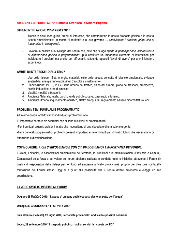AMBIENTE E TERRITORIO. Raffaele Straniero e Chiara Pagano STRUMENTI E AZIONI: PRIMI OBIETTIVI? - Tracciare delle linee guida, ambiti di interesse, che caratterizzino la nostra proposta politica e la nostra azione amministrativa in merito al territorio e al suo governo … (Individuare i problemi prima che si trasformino in emergenza); - Favorire la nascita e lo sviluppo del Forum che, oltre che "luogo aperto di partecipazione, discussione e di elaborazione politica e programmatica", può costituire un importante elemento di interazione per individuare i problemi ma anche per affrontarli, istituendo appositi "tavoli di lavoro" per amministratori, esperti, ecc. AMBITI DI INTERESSE: QUALI TEMI? 1. Uso delle risorse: rifiuti, energia, materiali, ciclo delle acque; concetto di bilancio ambientale, sviluppo sostenibile, energie rinnovabili; rifiuti (raccolta e smaltimento); 2. Pianificazione: PTCP, PRG, Piano urbano del traffico, piano del rumore, piano dei trasporti, emergenze, rischio industriale, aree di smesse; 3. Viabilità mobilità e trasporti; 4. Ambiente Naturale, tutela, parchi, verde pubblico, cave, paesaggio e turismo. 5. Ambiente Urbano: inquinamento(acustico, elettro smog, aria) regolamento edilizi e bioarchitettura, ecc. PROBLEMI: TEMI PUNTUALI E PROGRAMMATICI All’interno di ogni ambito vanno individuati i problemi in atto. E’ importante per fare ciò ricordarsi che ci sono due livelli di problematicità: -Temi puntuali urgenti: problemi in atto che necessitano di una risposta e di una azione urgente. -Temi generali programmatici: problemi presenti importanti e determinanti per il nostro futuro che necessitano di attenzione e di valorizzazione. COINVOLGERE: A CHI CI RIVOLGIAMO E CON CHI DIALOGHIAMO? L’IMPORTANZA DEI FORUM. I Circoli, i cittadini, le associazioni ambientaliste del territorio, le Istituzioni e le amministrazioni (Provincia e Comuni). Consapevoli della forza e del valore dei forum abbiamo cattivato e condotto tutte le iniziative attraverso il Forum (in qualità di responsabili della delega per territorio ed ambiente a livello provinciale) proprio per dare una spinta alla formazione del Forum stesso. Oggi si è giunti alla possibilità che il Forum diventi autonomo e elegga un suo coordinatore. LAVORO SVOLTO INSIEME AL FORUM Oggiono 25 MAGGIO 2010, “L’acqua e’ un bene pubblico: costruiamo un patto per l’acqua” Osnago, 30 GIUGNO 2010, “il PGT vizi e virtù’” Sala al Barro (Galbiate), 28 luglio 2010, La viabilità provinciale: nodi caldi e possibili soluzioni Lecco, 29 settembre 2010 “Il trasporto pubblico: tagli ai servizi, la risposta del PD” SINTESI :lavoro svolto insieme al FORUM Oggiono 25 MAGGIO 2010, “L’acqua e’ un bene pubblico: costruiamo un patto per l’acqua” 1. l'acqua, fonte insostituibile di vita, deve essere considerata un bene comune e patrimonio dell'umanità 2. l'accesso all'acqua – in particolare potabile - é un diritto umano e sociale che deve essere garantito in una logica di mutuo sostegno a tutti gli esseri umani indipendentemente dalla disponibilità del bene, dall’etnia, età, sesso, classe, reddito, nazionalità, religione 3. la copertura finanziaria dei costi necessari per garantire l'accesso effettivo di tutti gli essere umani all'acqua, nella quantità e qualità sufficienti alla vita, deve essere a carico della collettività pur prevedendo un costo del servizio che eviti gli sprechi e sia adeguato al valore di un bene non rinnovabile all’infinito 4. che impegna il CC inserire nello Statuto del Comune in fase di revisione il principio che l'acqua deve essere considerata un bene comune dell'umanità e che l'accesso all'acqua – in particolare potabile - é un diritto umano e sociale che deve essere garantito a tutti gli esseri umani indipendentemente dalla disponibilità del bene, dall’etnia, età, sesso, classe, reddito, nazionalità, religione A PROPOSITO DI SINDACI E ATO, lavoro sindaci e ATO: - costruzione percorso per mantenimento proprietà reti e erogazione in mano pubblica NELLE CONDIZIONI DATE (legge lombarda acque) - costituzione IL proprietaria delle reti e responsabile investimenti e manutenzioni straordinarie - costituzione LRH capace di competere nel servizio di erogazione - percorso stravolto da pronunciamento Corte Costituzionale, che ha sanzionato proprio la divisione prevista dal modello lombardo - in attuale periodo di vuoto normativo percorso per affidamento IN-HOUSE PROVVISORIO a IL A PROPOSITO DEL REFEREDUM Proposta referendum UTILE ma NON esaustiva; è giusto che nei territori si dia sostegno e aiuto per la raccolta delle firme mio gruppo consiliare ha già raccolto oltre 150 firme; il referendum non è sufficiente a condurre la necessaria battaglia politica per regolamentare questa materia come necessario, 24 referendum su 24 negli ultimi 15 anni sono stati persi perché non é stato raggiunto il quorum, Limite referendum: abroga parti di leggi e quindi non è in grado di ridefinire un quadro articolato di norme coerenti come invece richiede un bene così importante come è l'acqua, e un servizio così complesso come è il servizio idrico integrato. A PROPOSITO DI UNA LEGGE DI INIZIATIVA POPOLARE: OTTIMA la costruzione DAL BASSO di una proposta organica di legge mi sembra un’idea interessante vanno coinvolti in modo APERTO e PARTECIPATO, EELL, Associazioni, Strutture periferiche del partito, Cittadini CAPISALDI NUOVA LEGGE: Costruzione aziende pubbliche efficienti: altrimenti il discorso non passa nei cittadini; Servizi di livello elevato e controllabili; Articolazione regionale per consentire – in un quadro unitario – la gestione di differenze di tipo storico o morfologiche; Scala industriale per gestione del servizio; Possibilità di articolazione tariffaria; Costa poco, ne sprechiamo molta: “tariffe eque” e tariffe “sociali” ma disincentivo allo spreco Incentivo all’utilizzo di acqua non potabile per lavorazioni industriali Garanzia dell’effettuazione 