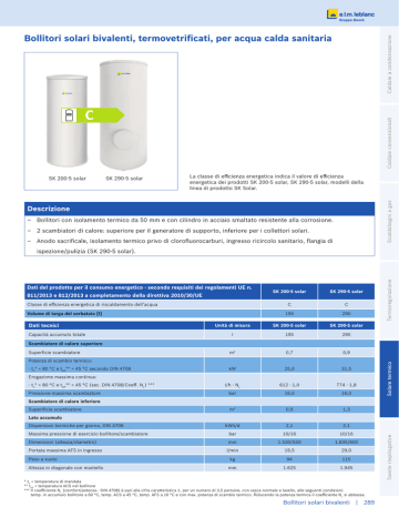 Caldaie convenzionali Caldaie a condensazione Bollitori solari bivalenti, termovetrificati, per acqua calda sanitaria SK 290-5 solar La classe di efficienza energetica indica il valore di efficienza energetica dei prodotti SK 200-5 solar, SK 290-5 solar, modelli della linea di prodotto SK Solar. Scaldabagni a gas SK 200-5 solar Descrizione –– Bollitori con isolamento termico da 50 mm e con cilindro in acciaio smaltato resistente alla corrosione. –– 2 scambiatori di calore: superiore per il generatore di supporto, inferiore per i collettori solari. –– Anodo sacrificale, isolamento termico privo di clorofluorocarburi, ingresso ricircolo sanitario, flangia di Dati del prodotto per il consumo energetico - secondo requisiti dei regolamenti UE n. SK 200-5 solar SK 290-5 solar C C 195 290 Unità di misura SK 200-5 solar SK 290-5 solar I 195 290 m2 0,7 0,9 kW 25,0 31,5 I/h - NL 612 - 1,0 774 - 1,8 bar 16,0 16,0 m2 0,9 1,3 kWh/d 2,1 2,1 811/2013 e 812/2013 a completamento della direttiva 2010/30/UE Classe di efficienza energetica di riscaldamento dell’acqua Volume di targa del serbatoio [l] Dati tecnici Capacità accumulo totale Termoregolazione ispezione/pulizia (SK 290-5 solar). Superficie scambiatore Potenza di scambio termico: - tV* = 80 °C e tSP** = 45 °C secondo DIN 4708 Erogazione massima continua: - tV* = 80 °C e tSP** = 45 °C (sec. DIN 4708/Coeff. NL) *** Pressione massima scambiatore Solare termico Scambiatore di calore superiore Scambiatore di calore inferiore Superificie scambiatore Dispersioni termiche per giorno, DIN 4708 Massima pressione di esercizio bollitore/scambiatore bar 10/16 10/16 Dimensioni (altezza/diametro) mm 1.530/550 1.835/600 l/min 19,5 29,0 kg 94 115 mm 1.625 1.945 Portata massima AFS in ingresso Peso a vuoto Altezza in diagonale con mantello * tV = temperatura di mandata ** tSP = temperatura ACS nel bollitore *** Il coefficiente NL (comfort/potenza - DIN 4708) è pari alla cifra caratteristica 1, per un numero di 3,5 persone, con vasca normale e lavello, alle seguenti condizioni: temp. in accumulo bollitore a 60 °C, temp. ACS a 45 °C, temp. AFS a 10 °C e con max. potenza di scambio termico. Riducendo la potenza termica il coefficiente NL si abbassa. Bollitori solari bivalenti | 289 Tavole riepilogative Lato accumulo