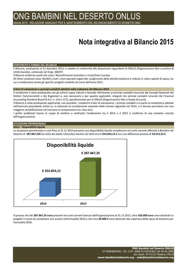 ONG BAMBINI NEL DESERTO ONLUS Attività 2015 - RELAZIONE ANNUALE PER IL MANTENIMENTO DEL RICONOSCIMENTO DI IDONEITÀ ONG Nota integrativa al Bilancio 2015 CONTENUTO E FORMA DEL BILANCIO Il Bilancio, predisposto al 31 dicembre 2015, è redatto in conformità alle disposizioni riguardanti le ONLUS (Organizzazioni Non Lucrative di Utilità Sociale), contenute nel D.lgs. 460/97. Il Bilancio evidenzia quelli che sono i Ricavi/Proventi (entrate) e i Costi/Oneri (uscite). Gli Oneri sostenuti sono riferibili a tutti i costi operativi legati allo svolgimento delle attività statutarie e indicati in sotto capitoli di spesa, tra cui si evidenziano anche gli specifici progetti condotti nel corso dell’anno 2015. Criteri di valutazione e principi contabili adottati nella redazione del Bilancio 2014 Il rendiconto è stato predisposto con gli schemi sopra indicati e facendo riferimento ai principi contabili enunciati dai Consigli Nazionali dei Dottori Commercialisti e dei Ragionieri e, ove necessario e per quanto applicabili, integrati dai principi contabili emanati dal Financial Accounting Standard Board (F.A.S. n. 116 e 117), specificamente per le ONLUS (Organizzazioni Non a Scopo di Lucro). Il Bilancio è stato predisposto applicando, ove possibile, i medesimi criteri di valutazione, i principi contabili e in parte la modulistica adottati nell’esercizio precedente anche se, in relazione al considerevole aumento delle entrate registrate nel 2014, si é dovuto procedere con una maggiore semplificazione nel tracciare la comparazione tra i due anni. I grafici pubblicati hanno lo scopo di mettere a confronto l’andamento tra il 2014 e il 2015 a conferma di una costante crescita dell’organizzazione. SITUAZIONE PATRIMONIALE Attivi - Disponibilità liquide La situazione patrimoniale o cash flow al 31.12.2015 presenta una disponibilità liquida complessiva nei conti correnti afferenti a Bambini nel Deserto di 387.867,35€ (al netto dei debiti v/banche) mentre nel 2014 era di 354.854,12 € con una differenza positiva di 33.013,23 €. Disponibilità liquide € 387.867,35 € 354.854,12 2014 2015 Si precisa che dei 387.867,35 euro presenti nei conti correnti bancari dell’organizzazione al 31.12.2015, oltre 320.000 euro sono destinati su progetti in corso da completare e/o avviare nell’annualità 2016 e che circa 40.000 € sono destinati alla copertura delle spese di Gestione per l’annualità 2016. ONG Bambini nel Deserto ONLUS CF 94094820365 - Ric. D.M. 2008/337/001638/3 del 06.05.2008 Via Casoli, 45 41123 Modena ITALIA www.bambinineldeserto.org – [email protected] ONG BAMBINI NEL DESERTO ONLUS Attività 2015 - RELAZIONE ANNUALE PER IL MANTENIMENTO DEL RICONOSCIMENTO DI IDONEITÀ ONG RENDICONTO DELLA GESTIONE Proventi I Proventi raccolti attraverso donazioni da sostenitori privati hanno avuto, come in passato, in gran parte dei casi una destinazione specifica per attività o progetti individuati dai donatori confermando ancora una volta che questi tendono a personalizzare sempre più la loro scelta. I Proventi complessivi al 31.12.2015 corrispondono a 1.105.830,48 € derivanti da: Eventi e manifestazioni; 0,44% 5x1000; 3,43% Interessi attivi; 0,03% Sostenitori privati ; 12,61% Contributi Aziende; 0,29% Quote associative ; 0,28% Contributi Enti; 82,92% Rispetto al 2014, che aveva visto realizzarsi una raccolta di fondi complessivi pari a 1.085.317,77 € il 2015 con i suoi 1.105.830,48 € si conclude con una crescita di 20.512,71 €. Oneri Progetti e Programmi Ai costi elencati nel Bilancio alla voce “Servizi Terzi alla Produzione” è sommata la quota parte dei costi indicati alle voci “Prestazioni professionali”, “INPS c/ditta” e “Collaboratori a Progetto”, in quanto trattasi di persone direttamente impiegate nell’ambito della realizzazione di progetti specifici come previsto nei budget dei progetti stessi. Viene inoltre aggiunto l’ammontare relativo all’automezzo utilizzato nell’ambito di un progetto. Complessivamente le spese per la realizzazione dei Progetti e dei Programmi dell’organizzazione nel 2015 sono di 1.023.205 €€ contro gli 808.046 € del 2014 e dunque con un incremento positivo di 215.158 €. Nel precedente anno (Bilancio 2014) alla voce “Servizi Terzi alla Produzione” era invece sommata quota parte delle spese indicate alle voci “Prestazioni professionali”, “Salari e Compensi Co.Co.Pro.”, “INPS c/ditta Co.Co.Pro.” e “INAIL c/ditta Co.Co.Pro.” della macrovoce “Costo per Servizi”, in quanto trattavasi di persone direttamente impiegate nell’ambito della realizzazione di progetti specifici come previsto nei budget dei progetti stessi. ONG Bambini nel Deserto ONLUS CF 94094820365 - Ric. D.M. 2008/337/001638/3 del 06.05.2008 Via Casoli, 45 41123 Modena ITALIA www.bambinineldeserto.org – [email protected] ONG BAMBINI NEL DESERTO ONLUS Attività 2015 - RELAZIONE ANNUALE PER IL MANTENIMENTO DEL RICONOSCIMENTO DI IDONEITÀ ONG Senegal; € 3.136,00 Totale per Paese altro; € 9.770,35 Benin; € 5.460,00 Niger; € 326.132,29 Burkina Faso; € 510.704,98 Ciad; € 112.847,04 Myanmar; € 2.500,00 Marocco; € 19.334,61 Mali; € 13.496,00 Italia; € 19.823,75 Gestione Le spese di Gestione sono invece state di 57.131 euro contro i 60.709 euro del 2014 e dunque con una diminuzione di 3.579 euro. PROGETTI E PROGRAMMI GESTIONE 60.709 1.023.205 808.046 57.131 2014 2015 2014 2015 ONG Bambini nel Deserto ONLUS CF 94094820365 - Ric. D.M. 2008/337/001638/3 del 06.05.2008 Via Casoli, 45 41123 Modena ITALIA www.bambinineldeserto.org – [email protected] ONG BAMBINI NEL DESERTO ONLUS Attività 2015 - RELAZIONE ANNUALE PER IL MANTENIMENTO DEL RICONOSCIMENTO DI IDONEITÀ ONG Oneri: percentuali di spesa tra Gestione e Progetti/Programmi Riassumendo gli oneri complessivi al 31.12.2015 corrispondono dunque a 1.080.335 euro di cui i costi di Gestione sono stati di solo di 57.131 euro pari al 5% e quelli relativi a Progetti, Programmi e Attiv