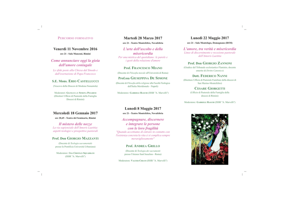 PERCORSO FORMATIVO Venerdì 11 Novembre 2016 ore 21 - Sala Manzoni, Rimini Come annunciare oggi la gioia dell'amore coniugale Le sfide poste alla Chiesa dal Sinodo e dall'esortazione di Papa Francesco S.E. Mons. ERIO CASTELLUCCI (Vescovo della Diocesi di Modena-Nonantola) Moderatori: GIANLUCA E SIMONA PESARESI (Direttori Ufficio di Pastorale della Famiglia Diocesi di Rimini) Martedì 28 Marzo 2017 Lunedì 22 Maggio 2017 ore 21 - Teatro Montefeltro, Novafeltria ore 21 - Sala Montelupo, Domagnano (RSM) L'arte dell'ascolto e della misericordia L'amore, tra verità e misericordia Per una mistica del quotidiano: le parole e i gesti della relazione d'amore Prof. FRANCESCO MIANO (Docente di Filosofia morale all'Università di Roma) Prof.ssa GIUSEPPINA DE SIMONE (Docente di Filosofia della religione alla Facoltà Teologica dell'Italia Meridionale - Napoli) Moderatore: GABRIELE RASCHI (ISSR "A. Marvelli") Linee di discernimento e recezione pastorale dell'Amoris Laetitia Prof. Don GIORGIO ZANNONI (Giudice del Tribunale ecclesiastico Flaminio, docente emerito di Diritto Canonico) Dott. FEDERICO NANNI (Direttore Ufficio di Pastorale Familiare della diocesi di San Marino-Montefeltro) CESARE GIORGETTI (Ufficio di Pastorale della Famiglia della diocesi di Rimini) Moderatore: GABRIELE RASCHI (ISSR "A. Marvelli") Lunedì 8 Maggio 2017 Mercoledì 18 Gennaio 2017 ore 21 - Teatro Montefeltro, Novafeltria ore 20,45 - Teatro del Seminario, Rimini Accompagnare, discernere e integrare le persone con le loro fragilità Il mistero delle nozze La via sapienziale dell'Amoris Laetitia: aspetti teologici e prospettive pastorali Prof. Don GIORGIO MAZZANTI "Quando accettiamo di entrare in contatto con l'esistenza concreta la vita ci si complica sempre meravigliosamente" (Docente di Teologia sacramentale presso la Pontificia Università Urbaniana) Prof. ANDREA GRILLO Moderatore: Don CRISTIAN SQUADRANI (ISSR "A. Marvelli") (Docente di Teologia dei sacramenti presso l'Ateneo Sant'Anselmo - Roma) Moderatore: VALTER CHIANI (ISSR "A. Marvelli") Lesortazione apostolica Amoris Laetitia di Papa Francesco ha suscitato un notevole dibattito sia allinterno che fuori della Chiesa cattolica. Lesortazione non è sulla dottrina del matrimonio e della famiglia, ma «sullamore nella famiglia», sulla fecondità di questo amore, sulla sua crescita: «Tutto questo si realizza in un cammino di permanente crescita» (AL, 307). Come è stato limpidamente osservato: «È la grammatica delle relazioni quella che viene così disegnata con tratti di grande sapienza, una grammatica delle relazioni che la Chiesa non detta dall'alto ma che essa stessa impara dalla vita delle famiglie. Una Chiesa che è popolo di Dio in cammino ( ). Colpisce il fatto che l'inno alla carità, paradigma della perfezione cristiana dell'amore e posto al cuore di questa esortazione, sia declinato dal Papa nel tempo e nei giorni della vita delle famiglie. La gioia dellamore matura attraverso il dialogo, il darsi tempo, lascoltare laltro facendogli spazio. Questo amore, che è nel tempo e che è gioia, è un amore che non ha paura del cambiamento» (Presentazione dellA.L. dei coniugi F. Miano e G. De Simone, 8.4.2016). Una rivoluzione impegnativa o linizio di un percorso rischioso che non sappiamo dove ci porterà? Il percorso seminariale tenterà di esplorare i temi principali dellesortazione: la sua ispirazione fondamentale, i punti fermi e gli orizzonti che apre, le questioni ancora irrisolte. Il percorso seminariale è promosso e coordinato dall'ISSR "A. Marvelli" in collaborazione con gli Uffici di Pastorale della Famiglia della Diocesi di Rimini e di San Marino-Montefeltro, e tenterà di approfondire i contenuti di fondo dell'esortazione, favorendone una più diffusa assimilazione. Si intende inoltre offrire un contributo al complesso e creativo lavoro di recezione del documento cercando di individuare alcune linee di azione spirituale e pastorale coinvolgendo le comunità ecclesiali nella cura evangelica delle realtà familiari dei nostri tempi. Gli incontri sono aperti a tutti, alle comunità parrocchiali e vicariali, si rivolgono in particolare agli operatori pastorali della famiglia; animatori ed educatori familiari e sociali; studenti dell'ISSR; docenti di religione cattolica; gruppi famiglie; operatori politici ecc. Corsi specifici proposti dall'ISSR nell'A.Ac. 2016/2017: - Teologia della nuzialità - Morale sessuale e familiare - Diritto canonico e Diritto di famiglia Tutti coloro che lo desiderano, possono iscriversi ai corsi come studenti uditori. Info e orari sul sito www.issrmarvelli.it. Per informazioni contattare la segreteria organizzativa: Istituto Superiore di Scienze Religiose "A. Marvelli" Rimini - Via Covignano, 265 - Tel. e fax 0541.751367 Sito internet: www.issrmarvelli.it E-mail: [email protected] La fecondità dell'amore Percorsi di spiritualità nuziale in ascolto dell'Amoris Laetitia Seminari di Teologia Pastorale Novembre 2016 - Maggio 2017