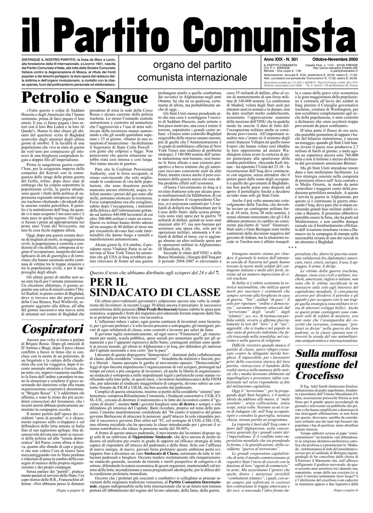 DISTINGUE IL NOSTRO PARTITO: la linea da Marx a Lenin, alla fondazione della III Internazionale, a Livorno 1921, nascita del Partito Comunista dItalia, alla lotta della Sinistra Comunista Italiana contro la degenerazione di Mosca, al rifiuto dei fronti popolari e dei blocchi partigiani; la dura opera del restauro della dottrina e dellorgano rivoluzionario, a contatto con la classe operaia, fuori dal politicantismo personale ed elettoralesco. organo del partito comunista internazionale Petrolio e Sangue «Tutto questo è colpa di Saddam Hussein e degli Americani che lhanno sostenuto, prima di farci pagare il loro errore. E ora, ci fanno pagare i loro errori con il loro Bin Laden e la loro Al Qaeda!». Hanno le idee chiare gli abitanti del quartiere sciita di Baghdad sconvolto dagli attentati degli ultimi giorni di ottobre. È la lucidità di una popolazione che vive in stato di guerra da ventanni per compiacere gli interessi di una borghesia compradora legata a doppio filo allimperialismo. Prima la sanguinosa guerra contro lIran, poi la sciagurata impresa della conquista del Kuwait con la conseguenza delle stragi della prima guerra del Golfo, infine, dopo dieci anni di embargo che ha colpito soprattutto la popolazione civile, la guerra attuale; sono questi i frutti della politica di supremazia regionale intrapresa dal regime iracheno sfruttando i dividendi della enorme rendita petrolifera. Il petrolio è la maledizione dellIraq; da quando vi è stato scoperto loro nero non cè stata pace in quella regione. Gli inglesi furono i primi ad appropriarsene nei primi anni Venti del Novecento, ma non fu cosa facile neppure allora. Oggi, dopo una guerra costata decine di migliaia di morti, in maggioranza civili, la popolazione è costretta a condizioni di vita difficili, sottoposta al regime doccupazione, inasprito dal moltiplicarsi di atti di guerriglia e di terrorismo che hanno seminato molte centinaia di vittime tra le truppe straniere e tra la popolazione civile, e per le rappresaglie degli alleati. Gli ultimi giorni di ottobre non sono stati facili per larmata statunitense. Un elicottero abbattuto; il giorno seguente una salva di missili contro lHotel Rashid, in pieno centro di Baghdad, dove si trovava uno dei pezzi grossi della Casa Bianca, Paul Wolfovitz, segretario aggiunto alla difesa; allalba del giorno successivo una nuova serie di attentati nel centro di Baghdad che Cospiratori Ancora una volta si torna a parlare di Brigate Rosse. Dopo gli omicidi di DAntona e Biagi; dopo il poco chiaro conflitto a fuoco in treno che si concluse con la morte di un poliziotto, di un brigatista e la cattura della clandestina che con lui viaggiava; dopo il recente anomalo attentato a Gorizia, dopo tutto ciò, improvvisamente sarebbero le forze dellordine a prendere in mano la situazione e condurre il gioco assestando dei durissimi colpi alla rinata organizzazione cospirativa denominata Brigate Rosse. Cè addirittura chi afferma, e sono le stime dei più accreditati conoscitori del fenomeno, che i recenti arresti abbiano praticamente annientato la compagine occulta. Il nostro partito dallepoca dei cosiddetti anni di piombo si è chiaramente espresso sullo svilupparsi e sul diffondersi della lotta armata in Italia fino al suo inglorioso epilogo: fine disonorevole dovuta non tanto ai successi della polizia ed alla tenuta democratica del Paese, come allora si diceva, quanto allo sbando di capi e gregari che non videro lora di tirarsi fuori mercanteggiando con lo Stato perdono e riduzioni di pena in cambio della consegna al nemico della propria organizzazione e dei propri compagni. Senza parlare dei pentiti, praticamente passati al servizio dello Stato, lex capo storico delle B.R., Franceschini afferma: «Noi abbiamo preso le distanze (Segue a pagina 4) prendono di mira la sede della Croce Rossa e alcune caserme della polizia irachena. Lo stesso Comando centrale statunitense è costretto ad ammettere che laggressività e luso di armi sofisticate della resistenza stanno aumentando e che gli assalti quotidiani superano i 25 al giorno. «Siamo in una situazione dinsurrezione ha dichiarato il Segretario di Stato Colin Powell con gente che colpisce e fugge. Non pensavamo che questa situazione sarebbe stata così intensa e così lunga. Noi siamo ancora in guerra». Pare che la Coalition Provisional Authority, cioè le forze occupanti, si stiano convincendo che solo migliorando le condizioni di vita delle popolazioni, che sono disastrose poiché mancano ancora elettricità, acqua, telefoni mentre i prezzi del gas sono alle stelle, potranno stroncare la resistenza. Forse comprendono ora che sciogliere, subito dopo loccupazione, i ministeri della difesa e dellinformazione gettando sul lastrico 440.000 lavoratori di cui oltre 300.000 militari è stato un errore. Questi ex militari hanno diritto adesso ad un assegno di 40 dollari al mese ma per riscuoterlo devono fare code interminabili che danno luogo a tumulti e manifestazioni antiamericane. Alcuni giorni fa, il 6 ottobre, il presidente russo Vladimir Putin in unintervista al New York Times ha ammonito che gli USA in Iraq avrebbero potuto ritrovarsi di fronte ad una guerra prolungata simile a quella combattuta dai sovietici in Afghanistan negli anni Ottanta: lui che ne sa qualcosa, certamente di allora, ma probabilmente anche di oggi... Gli Stati Uniti stanno prendendo atto che una cosa è sconfiggere lesercito di Saddam Hussein, male armato e ben poco motivato, una cosa è tenere il terreno, soprattutto i grandi centri urbani. «Tenere sotto controllo Baghdad esigerebbe delle risorse umane enormi, più di quelle che lAmministrazione è in grado di mobilitare» afferma al New York Times uno studioso di problemi strategici. I 140.000 uomini dellarmata statunitense non bastano, non bastano le forze alleate e non esistono prospettive a breve termine che gli americani ricevano consistenti aiuti da altri Paesi, mentre cresce anche il peso economico della guerra senza che es