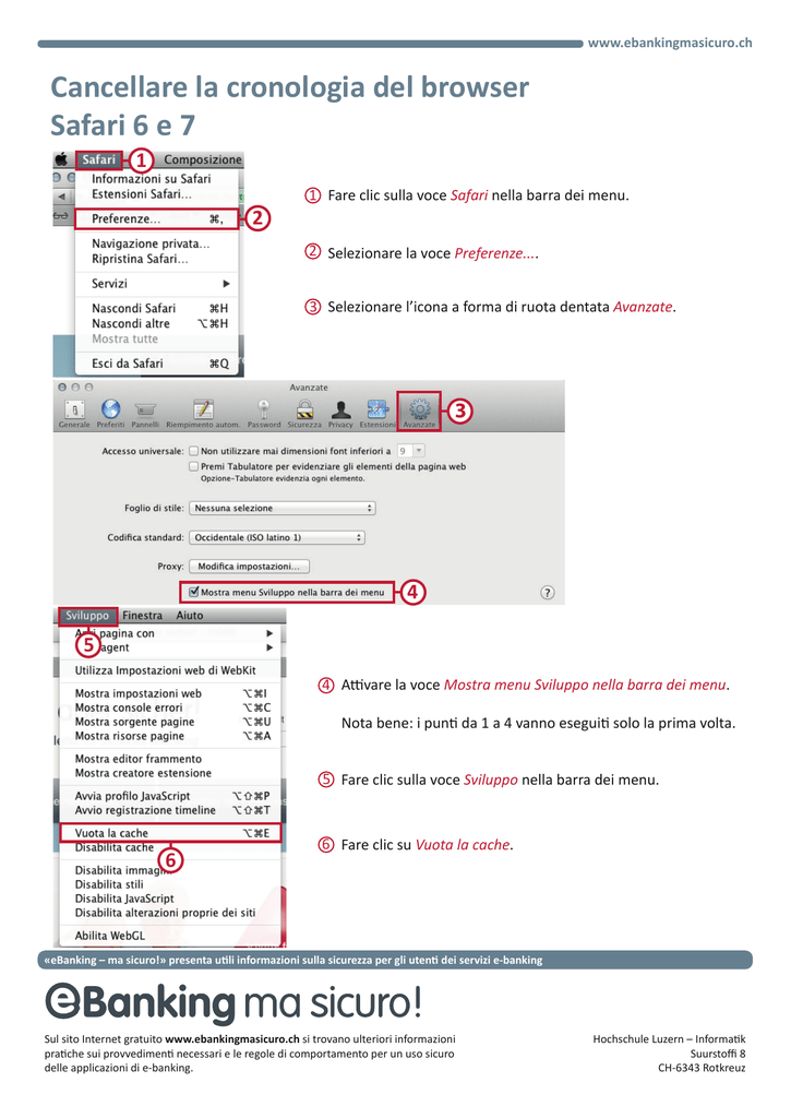 www.ebankingmasicuro.ch Cancellare la cronologia del browser Safari 6 e 7 1 2 1 Fare clic sulla voce Safari nella barra dei menu. 2 Selezionare la voce Preferenze.... 3 Selezionare l’icona a forma di ruota dentata Avanzate. 3 4 5 4 Attivare la voce Mostra menu Sviluppo nella barra dei menu. Nota bene: i punti da 1 a 4 vanno eseguiti solo la prima volta. 5 Fare clic sulla voce Sviluppo nella barra dei menu. 6 6 Fare clic su Vuota la cache. «eBanking – ma sicuro!» presenta utili informazioni sulla sicurezza per gli utenti dei servizi e-banking Sul sito Internet gratuito www.ebankingmasicuro.ch si trovano ulteriori informazioni pratiche sui provvedimenti necessari e le regole di comportamento per un uso sicuro delle applicazioni di e-banking. Hochschule Luzern – Informatik Suurstoffi 8 CH-6343 Rotkreuz