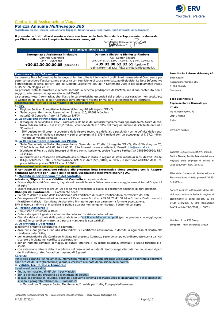Contratto di Assicurazione Viaggi Polizza Annuale Multiviaggio 365 (Assistenza, Spese Mediche, con opzioni: Bagaglio, Garanzia Volo, Resp.Civile, Sport invernali, Annullamento) Il presente contratto di assicurazione viene concluso con la Sede Secondaria e Rappresentanza Generale per l’Italia della società Europäische Reiseversicherung AG. Europäische Reiseversicherung AG RIFERIMENTI IMPORTANTI Emergenza e Assistenza in viaggio Centrale Operativa 24h – 365/anno +39.02.30.30.00.05 (opzione 1) Denuncia Sinistri e Richiesta Rimborsi Call Center Sinistri Lun.-Gio. 9.30-12.30 / 14.30-17.30 ; Ven. 9.30-12.30 +39.02.00.62.02.61 (opzione 2) [email protected]; PEC: [email protected] Premessa e Nota Informativa La presente Nota Informativa ha lo scopo di fornire tutte le informazioni preliminari necessarie al Contraente per poter sottoscrivere l’assicurazione prescelta con cognizione di causa e fondatezza di giudizio. La Nota Informativa è predisposta ai sensi dell’art. 185 del Decreto Legislativo 209 del 7 Settembre 2005 e del Regolamento IVASS n. 35 del 26 Maggio 2010. La presente Nota Informativa è redatta secondo lo schema predisposto dall’IVASS, ma il suo contenuto non è soggetto alla preventiva approvazione dell’IVASS. La presente Nota Informativa, che illustra le caratteristiche essenziali del prodotto assicurativo, non sostituisce le Condizioni di Polizza di cui l’Assicurato deve prendere visione prima della sottoscrizione del contratto. Informazioni relative alla Compagnia di Assicurazione 1. ERV Ragione Sociale: Europäische Reiseversicherung AG (di seguito “ERV”). Sede Legale: Germania, Rosenheimer Strasse 116, 81669 München. Autorità di Controllo: Autorità Tedesca BAFIN. 2. La situazione Patrimoniale al 31/12/2014 • Il margine di solvibilità di ERV – calcolato sulla base dei requisiti regolamentari applicati dall’Autorità di controllo tedesca BaFin – è di € 75,2 milioni, corrispondenti al 150% del margine minimo di solvibilità pari ad € 50 milioni. • ERV detiene fondi propri a copertura delle riserve tecniche e delle altre passività - come definite dalla regolamentazione di vigilanza tedesca – pari a complessivi € 179,4 milioni con un eccedenza di € 27,2 milioni rispetto al minimo richiesto 3. La Rappresentanza Generale per l’Italia Sede Secondaria in Italia: Rappresentanza Generale per l’Italia (di seguito “ERV”), Via G.Washington 70, 20146 Milano; Tel.:+39.02.76.41.66.52; Sito Internet: www.erv-italia.it; E-mail: [email protected] Iscrizione al Registro delle Imprese di Milano con n. iscrizione, codice fiscale e Partita IVA 05856020960; REA 1854153. Autorizzazione all’esercizio dell’attività assicurativa in Italia in regime di stabilimento ai sensi dell’art. 23 del D.Lgs 7/9/2005 n. 209, (comunicazione IVASS in data 27/9/2007, n. 5832), e iscrizione nell’Albo delle Imprese istituito presso l’IVASS al n. I.00071. Informazioni relative al contratto assicurativo Il contratto di assicurazione relativo alla presente Nota Informativa viene concluso con la Rappresentanza Generale per l’Italia della società Europäische Reiseversicherung AG. 1. Modalità di perfezionamento del contratto. Adesione, Stipulazione e Validità del Contratto – La polizza deve: Essere stipulata dal Contraente, il quale nel caso di Persona Fisica deve essere maggiorenne dotato di “capacità di agire”. Essere stipulata entro le ore 24.00 del giorno precedente a quello di decorrenza specifica di ogni garanzia. Obblighi del Contraente - Il Contraente deve: Prendere debita visione delle Condizioni e del Certificato di Polizza verificando la correttezza dei dati. Consegnare all’Intermediario o inviare a ERV a mezzo fax al n. +39.02.76.41.68.62 o E-mail all’indirizzo [email protected] il Certificato Assicurativo firmato in ogni sua parte per la formale accettazione. ERV si riserva il diritto di invalidare la polizza qualora non vengano rispettati i criteri di cui sopra. 2. Persone Assicurabili Domiciliate o residenti in Italia. Dotate di capacità giuridica al momento della sottoscrizione della polizza. Che alla data di stipula della polizza abbiano un’età fino a 70 anni compiuti (per le persone che raggiungono tale età in corso di contratto, la garanzia mantiene la sua validità). 3. Operatività e Decorrenza Il presente prodotto assicurativo è operante: dalle ore e dal giorno e fino alla data indicati sul certificato assicurativo, e decade in ogni caso al rientro alla residenza o domicilio; per le prestazioni e alle Condizioni indicate nel presente Contratto secondo la tipologia di prodotto scelta dall’Assicurato e indicata nel certificato assicurativo; per un numero illimitato di viaggi, di durata inferiore a 45 giorni ciascuno, effettuati a scopo turistico o di studio; con estensione oltre la data di scadenza nel caso in cui la data di rientro venga ritardata per cause non dipendenti dall’Assicurato, fino ad un massimo di 5 giorni. Carenza Per le sola garanzia “Annullamento/Interruzione Viaggio” il presente prodotto assicurativo è operante a decorrere dalle ore 24 del 30° (trentesimo) giorno successivo alla data di emissione della polizza 4. Validità Territoriale e Temporale L’assicurazione è valida: fino ad un massimo di 45 giorni per viaggio; per la destinazione prescelta ed identificata in polizza; in caso di destinazioni plurime, secondo il seguente schema per Macro-Area di destinazione (per le definizioni, si veda il paragrafo “Definizioni - Glossario)”: o Macro-Area “Europa e Bacino Mediterraneo”: valida per Italia, Europa/Mediterraneo, Europäische Reiseversicherung AG – Rappresentanza Generale per l’Italia – Polizza Annuale Multiviaggio 365 R17_20160725_V1 Pagina 1/10 Europäische Reiseversicherung AG Sede Legale Rosenheimer Straße 116 81669 Munich Germania Sede Secondaria e Rappresentanza Generale per l’Italia Via G.Washington, 70 20146 Milano Italia www.erv-italia.it Capitale Sociale: Euro 8