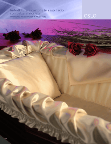 Imbottitura a cartone in raso liscio con balza arricciata PAPERBOARD COFFIN INTERIOR IN POLISH SATIN 236 236 OSLO OSLO Bianco White ART. -CEABA31 Accessori Accessories -CEABC01 Cuscino piedi Feet pillow -CEABC41 Lenzuolo Corpse covering sheet -CEABD51 Fazzoletto coprivolto Face covering handkerchief Champagne Champagne ART. -CEABA32 Accessori Accessories -CEABC02 Cuscino piedi Feet pillow -CEABC42 Lenzuolo Corpse covering sheet -CEABD52 Fazzoletto coprivolto Face covering handkerchief Grigio Grey ART. -CEABA33 Accessori Accessories -CEABC03 Cuscino piedi Feet pillow -CEABC43 Lenzuolo Corpse covering sheet -CEABD53 Fazzoletto coprivolto Face covering handkerchief Le imbottiture sono complete di cuscino testa. Gli accessori sono tutti in raso liscio. Altri colori sono disponibili su richiesta. Coffin interiors completed of head pillow. All accessories are in polish satin. Other colours on request. 237 Imbottitura a cartone in raso trapuntato con balza arricciata PAPERBOARD COFFIN INTERIOR IN EMBROIDERED SATIN 238 238 LISBONA LISBONA Bianco White ART. -CEABA45 Accessori Accessories -CEABC01 Cuscino piedi Feet pillow -CEABC41 Lenzuolo Corpse covering sheet -CEABD51 Fazzoletto coprivolto Face covering handkerchief Champagne Champagne ART. -CEABA46 Accessori Accessories -CEABC02 Cuscino piedi Feet pillow -CEABC42 Lenzuolo Corpse covering sheet -CEABD52 Fazzoletto coprivolto Face covering handkerchief Grigio Grey ART. -CEABA47 Accessori Accessories -CEABC03 Cuscino piedi Feet pillow -CEABC43 Lenzuolo Corpse covering sheet -CEABD53 Fazzoletto coprivolto Face covering handkerchief Le imbottiture sono complete di cuscino testa. Gli accessori sono tutti in raso liscio. Altri colori sono disponibili su richiesta. Coffin interiors completed of head pillow. All accessories are in polish satin. Other colours on request. 239 Imbottitura a cartone in raso trapuntato con balza aderente in raso jacquard PAPERBOARD COFFIN INTERIOR IN EMBROIDERED AND JACQUARD SATIN 240 240 LONDRA LONDRA Bianco White ART. -CEABA61 Accessori Accessories -CEABC01 Cuscino piedi Feet pillow -CEABC61 Lenzuolo Corpse covering sheet -CEABD51 Fazzoletto coprivolto Face covering handkerchief ART. -CEABA62 Accessori Accessories -CEABC02 Cuscino piedi Feet pillow - Coussin pour les pieds Fußkissen - Cojín pies -CEABC62 Lenzuolo Corpse covering sheet - Linceul Bettuch zum Zudeken der Leiche Sábana cubrecadáver -CEABD52 Fazzoletto coprivolto Face covering handkerchief Foulard pour couvrir le visage Gesichtbedeckungstuch Pañuelo cubrecara Grigio Grey ART. -CEABA63 Accessori Accessories -CEABC03 Cuscino piedi Feet pillow -CEABC63 Lenzuolo Corpse covering sheet -CEABD53 Fazzoletto coprivolto Face covering handkerchief Le imbottiture sono complete di cuscino testa. Gli accessori sono: cuscino piedi e fazzoletto in raso liscio, lenzuolo jacquard. Altri colori sono disponibili su richiesta Coffin interiors completed of head pillow. Feet pillows and face covering handkerchief are in polish satin, corpse covering sheet in jacquard. Other colours on request. 241 Imbottitura a cartone in raso jacquard con balza aderente PAPERBOARD COFFIN INTERIOR IN JACQUARD SATIN 242 242 PRAGA PRAGA Bianco White ART. -CEABA71 Accessori Accessories -CEABC01 Cuscino piedi Feet pillow -CEABC71 Lenzuolo Corpse covering sheet -CEABD51 Fazzoletto coprivolto Face covering handkerchief ART. -CEABA72 Accessori Accessories -CEABC02 Cuscino piedi Feet pillow -CEABC72 Lenzuolo Corpse covering sheet -CEABD52 Fazzoletto coprivolto Face covering handkerchief Grigio Grey ART. -CEABA73 Accessori Accessories -CEABC03 Cuscino piedi Feet pillow -CEABC73 Lenzuolo Corpse covering sheet -CEABD53 Fazzoletto coprivolto Face covering handkerchief Le imbottiture sono complete di cuscino testa. Gli accessori sono: cuscino piedi e fazzoletto in raso liscio, lenzuolo jacquard. Coffin interiors completed of head pillow. Feet pillows and face covering handkerchief are in polish satin, corpse covering sheet in jacquard. 243 Imbottitura a cartone in raso con balza arricciata in raso jacquard PAPERBOARD COFFIN INTERIOR WITH CURLED FLOUNCE IN JACQUARD SATIN 244 244 VIENNA VIENNA Bianco White ART. -CEABA74 Accessori Accessories -CEABC01 Cuscino piedi Feet pillow -CEABC74 Lenzuolo Corpse covering sheet -CEABD51 Fazzoletto coprivolto Face covering handkerchief ART. -CEABA75 Accessori Accessories -CEABC02 Cuscino piedi Feet pillow -CEABC75 Lenzuolo Corpse covering sheet -CEABD52 Fazzoletto coprivolto Face covering handkerchief Grigio Grey ART. -CEABA76 Accessori Accessories -CEABC03 Cuscino piedi Feet pillow -CEABC76 Lenzuolo Corpse covering sheet -CEABD53 Fazzoletto coprivolto Face covering handkerchief Le imbottiture sono complete di cuscino testa. Gli accessori sono: cuscino piedi e fazzoletto in raso liscio, lenzuolo jacquard. Coffin interiors completed of head pillow. Feet pillows and face covering handkerchief are in polish satin, corpse covering sheet in jacquard. 245 Imbottitura a cartone in raso jacquard con balza arricciata PAPERBOARD COFFIN INTERIOR WITH CURLED FLOUNCE IN JACQUARD SATIN 246 246 MADRID MADRID Champagne Champagne ART. -CEABA77 Accessori Accessories -CEABC02 Cuscino piedi Feet pillow -CEABC77 Lenzuolo Corpse covering sheet -CEABD52 Fazzoletto coprivolto Face covering handkerchief Grigio Grey ART. -CEABA78 Accessori Accessories -CEABC03 Cuscino piedi Feet pillow -CEABC78 Lenzuolo Corpse covering sheet -CEABD53 Fazzoletto coprivolto Face covering handkerchief Le imbottiture sono complete di cuscino testa. Gli accessori sono: cuscino piedi e fazzoletto in raso liscio, lenzuolo jacquard. Coffin interiors completed of head pillow. Feet pillows and face covering handkerchief are in polish satin, corpse covering sheet in jacquard. 247 Imbottitura a cartone in raso jacquard con balza aderente PAPERBOARD COFFIN INTERIOR WITH TIGHT JACQUARD SATIN FLOUNCE 248 248 STOCCOLMA STOCCOLMA ART. -CEABA79 Accessori Accessories -CEABC02 Cuscino piedi Feet pillow -CEABC79 Lenzuolo Corpse coverin