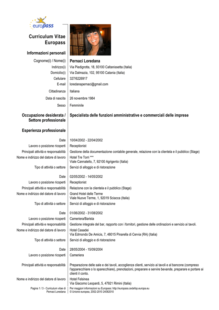Curriculum Vitae Europass Informazioni personali Cognome(i) / Nome(i) Pernaci Loredana Indirizzo(i) Via Piedigrotta, 18, 93100 Caltanissetta (Italia) Domicilio(i) Via Dalmazia, 102, 95100 Catania (Italia) Cellulare E-mail Cittadinanza Data di nascita Sesso 327/6226917 [email protected] Italiana 26 novembre 1984 Femminile Occupazione desiderata / Specialista delle funzioni amministrative e commerciali delle imprese Settore professionale Esperienza professionale Date Lavoro o posizione ricoperti Principali attività e responsabilità Nome e indirizzo del datore di lavoro Tipo di attività o settore Date Lavoro o posizione ricoperti Principali attività e responsabilità Nome e indirizzo del datore di lavoro Tipo di attività o settore Date Lavoro o posizione ricoperti Principali attività e responsabilità Nome e indirizzo del datore di lavoro Tipo di attività o settore Date Lavoro o posizione ricoperti Principali attività e responsabilità Nome e indirizzo del datore di lavoro Pagina 1 / 3 - Curriculum vitae di Pernaci Loredana 10/04/2002 - 22/04/2002 Receptionist Gestione della documentazione contabile generale, relazione con la clientela e il pubblico (Stage) Hotel Tre Torri *** Viale Cannatello, 7, 92100 Agrigento (Italia) Servizi di alloggio e di ristorazione 02/05/2002 - 14/05/2002 Receptionist Relazione con la clientela e il pubblico (Stage) Grand Hotel delle Terme Viale Nuove Terme, 1, 92019 Sciacca (Italia) Servizi di alloggio e di ristorazione 01/06/2002 - 31/08/2002 Cameriera/Barista Gestione integrale del bar, rapporto con i fornitori, gestione delle ordinazioni e servizio ai tavoli. Hotel Casadei Via Edmondo De Amicis, 7, 48015 Pinarella di Cervia (RA) (Italia) Servizi di alloggio e di ristorazione 28/05/2004 - 15/09/2004 Cameriera Preparazione delle sale e dei tavoli, accoglienza clienti, servizio ai tavoli e al bancone (compreso l'apparecchiare o lo sparecchiare), prenotazioni, preparare e servire bevande, preparare e portare ai clienti il conto. Hotel Felsinea Via Giacomo Leopardi, 5, 47921 Rimini (Italia) Per maggiori informazioni su Europass: http://europass.cedefop.europa.eu © Unione europea, 2002-2010 24082010 Tipo di attività o settore Date Lavoro o posizione ricoperti Principali attività e responsabilità Nome e indirizzo del datore di lavoro Tipo di attività o settore Date Lavoro o posizione ricoperti Principali attività e responsabilità Nome e indirizzo del datore di lavoro Tipo di attività o settore Servizi di alloggio e di ristorazione 09/04/2006 - 15/09/2006 Cameriera Servizio ai tavoli, rapporto con la clientela, prendere le ordinazioni, rapporto con i fornitori e preparazione delle bevande. Hotel Casadei Via Edmondo De Amicis, 7, 48015 Pinarella di Cervia (RA) (Italia) Servizi di alloggio e di ristorazione 21/02/2009 → Cassiera Gestione della cassa, delle telefonate e delle ordinazioni, rapporto con i fornitori e gestione contabile giornaliera. La Nuova Pizza Fantasy Di Campanella Vincenzo Via Monserrato, 91, 95128 Catania (Italia) Settore Alimentare Istruzione e formazione Date Titolo della qualifica rilasciata Principali tematiche/competenza professionali possedute Nome e tipo d'organizzazione erogatrice dell'istruzione e formazione Date Titolo della qualifica rilasciata Principali tematiche/competenza professionali possedute Nome e tipo d'organizzazione erogatrice dell'istruzione e formazione Date Titolo della qualifica rilasciata Principali tematiche/competenza professionali possedute Nome e tipo d'organizzazione erogatrice dell'istruzione e formazione Date Principali tematiche/competenza professionali possedute Nome e tipo d'organizzazione erogatrice dell'istruzione e formazione Pagina 2 / 3 - Curriculum vitae di Pernaci Loredana 07/2001 Segreteria e Ricevimento L’operatore ai servizi di segreteria e ricevimento svolge attività di varia natura. Gestisce i servizi di economato e controllo, conosce gli impianti e i reparti dell’albergo, usa macchine e attrezzature tecnologicamente avanzate. Accoglie i clienti alla reception, dà loro informazioni di ogni tipo, aiuta ad organizzare visite ed escursioni. Si occupa della prenotazione delle camere, è in grado di evadere la corrispondenza, anche in lingua straniera, prepara le fatture, tiene la contabilità, ecc. I.P.S.S.A.R. "Federico II" di Enna (Istituto Professionale Statale) Via Nicosia, 2, 94100 Enna (Italia) 07/2003 Diploma Scuola Superiore in Segreteria e Ricevimento con la votazione di 100/100. Tecnologia professionale (principi base, igiene e sicurezza) Conoscenza dell'attività e della relativa economia, contesto giuridico e sociale I.P.S.S.A.R. "Federico II" di Enna (Istituto Professionale Statale) Via Nicosia, 2, 94100 Enna (Italia) 24/03/2009 Laurea in “Economia e Gestione delle Imprese Turistiche” con la votazione di 96/110, discutendo la tesi “Turismo enogastronomico nei Paesi Etnei” (Relatore: Prof. Antonino Longo). Ampia formazione interdisciplinare nel campo dell'economia, dei metodi e delle tecniche matematicostatistiche, delle discipline giuridiche di base e specialistiche. Gestione Aziendale, Contabilità, Controllo Amministrativo e Contabile. Università degli Studi di Catania Corso Italia, 55, 95129 Catania (Italia) 05/10/2009 → Attualmente frequento il Corso di Laurea Magistrale in “Economia e Gestione delle Amministrazioni Pubbliche”. Il corso è caratterizzato da conoscenze degli strumenti avanzati di analisi microeconomica e quantitativa necessari per una valutazione delle variabili rilevanti per operare scelte razionali nel settore pubblico, delle tecniche di management di aziende pubbliche e private, dei principi e degli isituti giuridici propri di tale settore. Università degli Studi di Catania Corso Italia, 55, 95129 Catania (Italia) Per maggiori informazioni su Europass: http://europass.cedefop.europa.eu © Unione europea, 2002-2010 24082010 Capacità e competenze personali Madrelingua(e) Altra(e) lingua(e) Italiano (*) Quadro comune europeo di rife