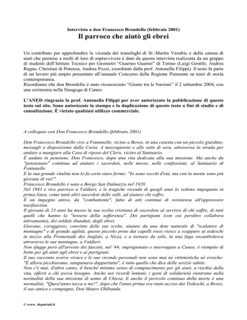 Intervista a don Francesco Brondello (febbraio 2001) Il parroco che aiutò gli ebrei Un contributo per approfondire la vicenda dei transfughi di St.-Martin Vésubie e della catena di aiuti che permise a molti di loro di sopravvivere è dato da questa intervista realizzata da un gruppo di studenti dell’Istituto Tecnico per Geometri “Guarino Guarini” di Torino (Luigi Gentile, Andrea Ragno, Christian di Potenza, Andrea Pozzi, coordinati dalla prof. Antonella Filippi). Il testo fa parte di un lavoro più ampio presentato all’annuale Concorso della Regione Piemonte su temi di storia contemporanea. Ricordiamo che don Brondello è stato riconosciuto “Giusto tra le Nazioni” il 2 settembre 2004, con una cerimonia nella Sinagoga di Cuneo. L’ANED ringrazia la prof. Antonella Filippi per aver autorizzato la pubblicazione di questo testo sul sito. Sono autorizzate la stampa e la duplicazione di questo testo a fini di studio e di consultazione. È vietato qualsiasi utilizzo commerciale. A colloquio con Don Francesco Brondello (febbraio 2001) Don Francesco Brondello vive a Fontanelle, vicino a Boves, in una casetta con un piccolo giardino, messagli a disposizione dalla Curia. A mezzogiorno e alle sette di sera, attraversa la strada per andare a mangiare alla Casa di riposo del Clero, vicino al Santuario. È andato in pensione, Don Francesco, dopo una vita dedicata alla sua missione. Ma anche da "pensionato" continua ad aiutare i sacerdoti, nelle messe, nelle confessioni, al Santuario di Fontanelle. E la sua grande vitalità non lo fa certo stare fermo: "Io sono vecchi d'età, ma con la mente sono più giovane di voi!". Francesco Brondello è nato a Borgo San Dalmazzo nel 1920. Nel 1943 è vice parroco a Valdieri, e le tragiche vicende di quegli anni lo vedono impegnato in prima linea, come tanti altri sacerdoti delle valli, ad aiutare chi soffre. È un impegno attivo, da "combattente", fatto di atti continui di resistenza all'oppressore nazifascista. Il giovane di 23 anni ha messo la sua scelta cristiana di sacerdote al servizio di chi soffre, di tutti quelli che hanno la "tessera della sofferenza". Dei partigiani (con cui peraltro collabora attivamente), dei soldati sbandati, degli ebrei. Giovane, coraggioso, convinto delle sue scelte, aiutato da una dote naturale di "scalatore di montagne" e di grande agilità, questo piccolo prete dai capelli rossi riesce a scappare ai tedeschi in mezzo alla Promenade des Anglais, a Nizza, e a tornare da solo, in una fuga rocambolesca attraverso le sue montagne, a Valdieri. Non sfugge però all'arresto dei fascisti, nel '44; imprigionato e interrogato a Cuneo, è riempito di botte per gli aiuti agli ebrei e ai partigiani. Il suo racconto scorre vivace e le sue vicende personali non sono mai né vittimistiche né eroiche: "E allora picchiavano, sanguinavo dappertutto", è tutto quello che dice delle sevizie subite. Non c'è mai, d'altro canto, il benché minimo senso di compiacimento per gli aiuti, a rischio della vita, offerti a chi aveva bisogno. Anche nei ricordi lontani, i gesti di solidarietà rientrano nella normalità della sua missione di uomo di Chiesa. E anche il pericolo continuo della morte è una normalità: "Quest'anno tocca a me!", dopo che l'anno prima era stato ucciso dai Tedeschi, a Boves, il suo amico e compagno, Don Mauro Ghibaudo. © www. deportati.it Un’intervista a don Francesco Brondello Solo un momento di commozione. Don Francesco ha pianto nel ricordare i due ebrei salvati che nel giorno della liberazione lo riconoscono e gli vengono incontro per ringraziarlo. L'emozione è salita nel ricordo della vita e della salvezza. Don Francesco Brondello, dopo la guerra, ha detto basta al mondo e si è rifugiato sulle montagne, dove ha vissuto in alcune baite con una chiesetta, sopra Limone, per 35 anni. Ha vissuto nella natura, dove ha trovato il contatto più vero con Dio: "Senza acqua corrente, senza luce, senza servizi, neh! E senza telefono". Abbiamo intervistato Don Francesco Brondello il 4 febbraio2001, nella sua casa di Fontanelle. Per l'importanza degli avvenimenti ricordati e per la scorrevolezza della narrazione di Don Francesco, abbiamo scelto di trascrivere integralmente l'intervista, di cui abbiamo omesso solo brevi parentesi fuori dalla storia o accenni ad episodi insignificanti per il senso del discorso globale. D.: Don Francesco, che cosa è successo a Valdieri, dopo l'8 settembre? Era il 12, io dico il 12 settembre, però non bisogna prendere il 12 limitato a 24 ore, può essere l'11 come può essere il 13, perché erano avvenimenti… però si focalizza col 12, perché all’8 settembre c’era stato lo sfascio della IV Armata, la famosa IV Armata, che era la più attrezzata e ben armata di tutta l’Italia ed era quella che governava il sud-est della Francia, Nizza, Montecarlo, da quelle parte lì, e avevano anche la zona di San Martin1. Noi l'abbiam saputo prima, noi, quei pochi che eravamo lì, perché i Reali avevano le ville a Sant’Anna di Valdieri, quindi venivano sempre in villeggiatura; quindi noi li conoscevamo, perché la Regina andava sempre a pescare; poi c’era la questione della caccia dei camosci. E abbiam capito, alla fine di agosto, qualcosa qui funsiuna nen2, perché i Reali che erano lì con le principesse ecc… le avevano pregate di andar via ed erano andate in Svizzera. C’erano i guardiacaccia, che erano del posto: qui c’è qualcosa… E di fatti poi è arrivato l’armistizio, l’8 settembre: ecco perché noi abbiamo capito prima che c’era qualcosa che non funzionava. E lì c’è stato proprio lo sfascio perché… son cose anche dolorose per noi, come dire, queste cose qui; perché gli ufficiali, sono i primi che l’han saputo e se ne sono andati; e han detto niente ai soldati. La caserma aveva tutti i viveri, per sei mesi, per seicento militari per sei mesi, perché eravamo d’autunno, preparazione all’inverno. Io parlo di Valdieri, perché in quei momenti lì noi non sapevamo 