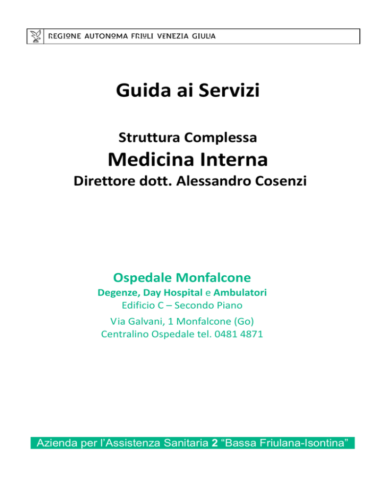 Guida ai Servizi Struttura Complessa Medicina Interna Direttore dott. Alessandro Cosenzi Ospedale Monfalcone Degenze, Day Hospital e Ambulatori Edificio C – Secondo Piano Via Galvani, 1 Monfalcone (Go) Centralino Ospedale tel. 0481 4871 Azienda per l’Assistenza Sanitaria 2 “Bassa Friulana-Isontina” SC Medicina Interna Monfalcone edizione maggio 2016 Direttore: Dott. Alessandro Cosenzi Recapiti: 0481487342 – 0481 487042 - [email protected] Riceve per colloqui dal lunedì al venerdì previo appuntamento. Referente Infermieristico di Dipartimento Medico Sig. Patrizio Grassi Telefono: 0481 487207 - [email protected] Riceve per colloqui compatibilmente con le attività. Coordinatore Infermieristico area degenza: dott. Francesco Cecchini Recapiti: 0481 487041 Riceve per colloqui dal lunedì al venerdì dalle 13.00 alle 14.00 In orari diversi è a disposizione compatibilmente con le attività Obiettivi della S.C. di Medicina Interna La Medicina interna è deputata alle attività di prevenzione, diagnosi, terapia ed eventuale follow up delle patologie di interesse internistico sia in regime ambulatoriale che di day hospital e degenza ordinaria. Il processo di erogazione di queste attività avviene nelle diverse aree: Degenza, Day Hospital, Ambulatoriale: Medicina Interna, Malattie Infettive, Post-ricovero Viene inoltre svolta , da parte di alcuni medici, anche attività ambulatoriale intramoenia (Libera Professione). SC Medicina Interna Monfalcone edizione maggio 2016 Attività di Degenza Il reparto di degenza medica si trova all’Ospedale di Monfalcone Via Galvani, 1 Blocco C - Secondo Piano La Struttura Complessa di Medicina si suddivide nella seguenti aree di degenza: MEDICINA A tel. 0481/487244 e MEDICINA B tel. 0481/487287 ACCOGLIMENTO Il ricovero avviene con le seguenti modalità: • urgente previa valutazione del Pronto Soccorso (questa è la modalità di gran lunga prevalente). • programmato a seguito di richiesta del medico di medicina generale o dello specialista. • per trasferimento da altre strutture od ospedali. Al momento del ricovero ad ogni paziente viene applicato un braccialetto identificativo di sicurezza dove sono riportati il cognome, il nome e la data di nascita di cui vi chiediamo di verificare la correttezza dei dati riportati. Ogni paziente ha a sua disposizione un comodino ed un armadietto, dove riporre i propri effetti personali. Si consiglia vivamente di non portare significative quantità di denaro (in ospedale non servono) od oggetti di valore al momento del ricovero. Il personale di reparto non è responsabile della custodia di oggetti preziosi o di denaro. PER IL RICOVERO È NECESSARIO ESSERE PROVVISTI DI: documento di identità; Documenti sanitari personali come copia di cartelle cliniche, esiti degli ultimi esami ematici, raggi X etc; Un recapito di telefono fisso e uno di telefono cellulare; Elenco dei medicinali eventualmente assunti a domicilio; Biancheria intima, pigiama/camicia da notte, una tuta da ginnastica, fazzoletti di carta, asciugamani, calzature antiscivolo possibilmente chiuse, sapone liquido; Un idoneo contenitore dove riporre e conservare la eventuale protesi (es. dentaria o acustica) Per i ricoveri urgenti dal pronto soccorso, la suddetta documentazione e il necessario per l’igiene personale deve essere portata nel più breve tempo possibile. SC Medicina Interna Monfalcone edizione maggio 2016 Prima di essere sottoposti a determinati esami diagnostici, sierologici, di emotrasfusione e suoi derivati ed interventi chirurgici viene richiesto di sottoscrivere un consenso scritto, dopo aver ricevuto una adeguata informazione su modalità e finalità. MEDICO di riferimento: Al momento del ricovero viene indicato il Medico che seguirà il paziente durante la degenza questa informazione può essere aggiornata in caso di cambiamenti. I medici ricevono per colloqui dal lunedì al venerdì dalle 13.00 alle 14.00 In orari e giorni diversi sono comunque a disposizione compatibilmente con le attività e limitatamente a condizioni d'urgenza INFERMIERE di riferimento: Ogni giorno nella bacheca esposta fuori dalla Sala Infermieri sarà evidenziato il nominativo dell’Infermiere di riferimento per ogni specifico letto di degenza e per ogni turno di assistenza . A tale Infermiere l’utenza potrà rivolgere eventuali richieste specifiche relative all’assistenza. ICA – Infermiere di Continuità Assistenziale: L’ICA è la figura infermieristica responsabile della continuità assistenziale tra Ospedale e Territorio. Nel P.O. di Monfalcone sono presenti due Infermiere (Michela e Sara) reperibili al numero di telefono 0481 487067 nei giorni feriali. A tale figura l’Utenza potrà rivolgersi, fin dall’inizio del ricovero, per segnalare eventuali criticità nella gestione a domicilio del paziente e per organizzare un eventuale supporto assistenziale o sociale a domicilio. INFORMAZIONI SULLE CONDIZIONI DI SALUTE Familiare di riferimento: al momento del ricovero il paziente può indicare, se lo ritiene opportuno, il/i nominativo/i del familiare/i cui il Medico è autorizzato a fornire informazioni cliniche sullo stato di salute. Tale nominativo viene registrato dal personale sulla Cartella Clinica. In caso di presenza di Amministratore di Sostegno o di Tutore, i nominativi devono essere immediatamente comunicati dai familiari al personale al momento dell’ingresso in Reparto. Non vengono fornite informazioni cliniche al telefono o a persone diverse da quelle indicate dal paziente, fatta eccezione per situazioni di urgenza o di criticità, situazioni in cui è il personale stesso a contattare il familiare di riferimento indicato nella Cartella Clinica. SC Medicina Interna Monfalcone edizione maggio 2016 PRIVACY Se non desidera che il suo nome compaia tra i pazienti ricoverati, lo comunichi alla coordinatrice infermieristica che provvederà ad avvertire i centralini dell’ospedale. ORARIO PASTI COLAZIONE: PRANZO: CENA: ore 7.30 ore 12.30 ore 18