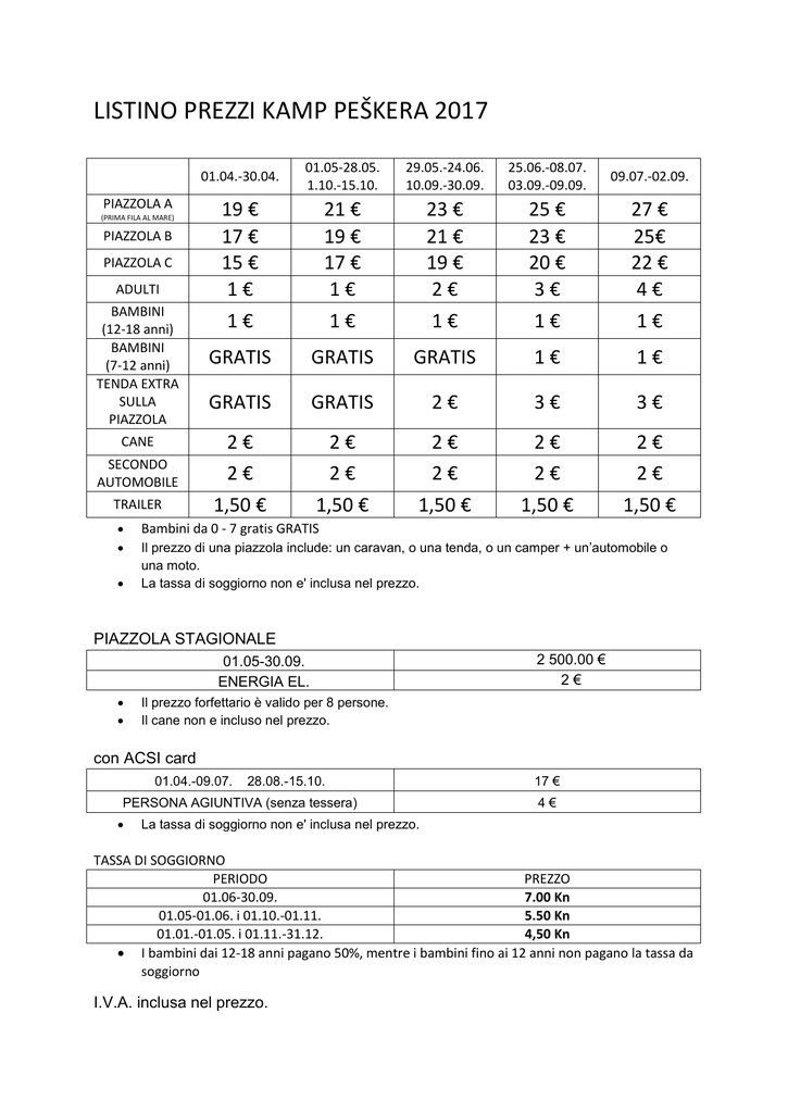 LISTINO PREZZI KAMP PEŠKERA 2017 PIAZZOLA A (PRIMA FILA AL MARE) PIAZZOLA B PIAZZOLA C ADULTI BAMBINI (12-18 anni) BAMBINI (7-12 anni) TENDA EXTRA SULLA PIAZZOLA CANE SECONDO AUTOMOBILE TRAILER 01.04.-30.04. 01.05-28.05. 1.10.-15.10. 29.05.-24.06. 10.09.-30.09. 25.06.-08.07. 03.09.-09.09. 09.07.-02.09. 19 € 17 € 15 € 1€ 1€ 21 € 19 € 17 € 1€ 1€ 23 € 21 € 19 € 2€ 1€ 25 € 23 € 20 € 3€ 1€ 27 € 25€ 22 € 4€ 1€ GRATIS GRATIS GRATIS 1€ 1€ GRATIS GRATIS 2€ 3€ 3€ 2€ 2€ 1,50 € 2€ 2€ 1,50 € 2€ 2€ 1,50 € 2€ 2€ 1,50 € 2€ 2€ 1,50 € Bambini da 0 - 7 gratis GRATIS Il prezzo di una piazzola include: un caravan, o una tenda, o un camper + un’automobile o una moto. La tassa di soggiorno non e' inclusa nel prezzo. PIAZZOLA STAGIONALE 01.05-30.09. ENERGIA EL. 2 500.00 € 2€ Il prezzo forfettario è valido per 8 persone. Il cane non e incluso nel prezzo. con ACSI card 01.04.-09.07. 28.08.-15.10. PERSONA AGIUNTIVA (senza tessera) 17 € 4€ La tassa di soggiorno non e' inclusa nel prezzo. TASSA DI SOGGIORNO PERIODO PREZZO 01.06-30.09. 7.00 Kn 01.05-01.06. i 01.10.-01.11. 5.50 Kn 01.01.-01.05. i 01.11.-31.12. 4,50 Kn I bambini dai 12-18 anni pagano 50%, mentre i bambini fino ai 12 anni non pagano la tassa da soggiorno I.V.A. inclusa nel prezzo. CASE MOBILI: LISTINO PREZZI 2017 (EURO) L'affitto giornaliero per casa mobile PERIODO PREZZO 14.04.-27.05. 21.09.-30.09. 65 € 28.05.-24.06. 11.09.-20.09. 88 € 25.06.-08.07. 03.09-10.09. 98 € 09.07.-15.07. 125 € 27.08.-02.09. 135 € 16.07.-26.08. 160 € Letto extra 5€ TASSA DI SOGGIORNO PERIODO PREZZO 01.06-30.09. 7.00 Kn 01.05-01.06. i 01.10.-01.11. 5.50 Kn 01.01.-01.05. i 01.11.-31.12. 4,50 Kn I bambini dai 12-18 anni pagano 50%, mentre i bambini fino ai 12 anni non pagano la tassa da soggiorno I.V.A. inclusa nel prezzo.