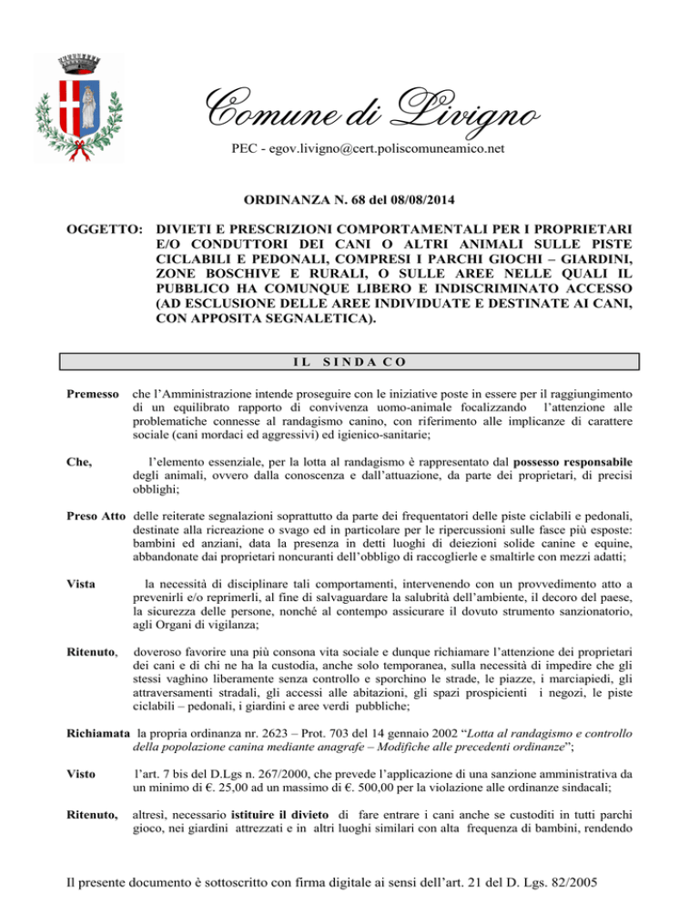 Comune di Livigno PEC - [email protected] ORDINANZA N. 68 del 08/08/2014 OGGETTO: DIVIETI E PRESCRIZIONI COMPORTAMENTALI PER I PROPRIETARI E/O CONDUTTORI DEI CANI O ALTRI ANIMALI SULLE PISTE CICLABILI E PEDONALI, COMPRESI I PARCHI GIOCHI – GIARDINI, ZONE BOSCHIVE E RURALI, O SULLE AREE NELLE QUALI IL PUBBLICO HA COMUNQUE LIBERO E INDISCRIMINATO ACCESSO (AD ESCLUSIONE DELLE AREE INDIVIDUATE E DESTINATE AI CANI, CON APPOSITA SEGNALETICA). IL SINDA CO Premesso che l’Amministrazione intende proseguire con le iniziative poste in essere per il raggiungimento di un equilibrato rapporto di convivenza uomo-animale focalizzando l’attenzione alle problematiche connesse al randagismo canino, con riferimento alle implicanze di carattere sociale (cani mordaci ed aggressivi) ed igienico-sanitarie; Che, l’elemento essenziale, per la lotta al randagismo è rappresentato dal possesso responsabile degli animali, ovvero dalla conoscenza e dall’attuazione, da parte dei proprietari, di precisi obblighi; Preso Atto delle reiterate segnalazioni soprattutto da parte dei frequentatori delle piste ciclabili e pedonali, destinate alla ricreazione o svago ed in particolare per le ripercussioni sulle fasce più esposte: bambini ed anziani, data la presenza in detti luoghi di deiezioni solide canine e equine, abbandonate dai proprietari noncuranti dell’obbligo di raccoglierle e smaltirle con mezzi adatti; Vista la necessità di disciplinare tali comportamenti, intervenendo con un provvedimento atto a prevenirli e/o reprimerli, al fine di salvaguardare la salubrità dell’ambiente, il decoro del paese, la sicurezza delle persone, nonché al contempo assicurare il dovuto strumento sanzionatorio, agli Organi di vigilanza; Ritenuto, doveroso favorire una più consona vita sociale e dunque richiamare l’attenzione dei proprietari dei cani e di chi ne ha la custodia, anche solo temporanea, sulla necessità di impedire che gli stessi vaghino liberamente senza controllo e sporchino le strade, le piazze, i marciapiedi, gli attraversamenti stradali, gli accessi alle abitazioni, gli spazi prospicienti i negozi, le piste ciclabili – pedonali, i giardini e aree verdi pubbliche; Richiamata la propria ordinanza nr. 2623 – Prot. 703 del 14 gennaio 2002 “Lotta al randagismo e controllo della popolazione canina mediante anagrafe – Modifiche alle precedenti ordinanze”; Visto l’art. 7 bis del D.Lgs n. 267/2000, che prevede l’applicazione di una sanzione amministrativa da un minimo di €. 25,00 ad un massimo di €. 500,00 per la violazione alle ordinanze sindacali; Ritenuto, altresì, necessario istituire il divieto di fare entrare i cani anche se custoditi in tutti parchi gioco, nei giardini attrezzati e in altri luoghi similari con alta frequenza di bambini, rendendo Il presente documento è sottoscritto con firma digitale ai sensi dell’art. 21 del D. Lgs. 82/2005 palese il divieto mediante la posa in luogo di idonea segnaletica ad esclusione delle aree e percorsi destinati ai cani; Ritenuto altresì necessario istituire il divieto agli animali da tiro e passeggio (equini) sulle piste ciclabili, rendendo palese il divieto mediante la posa in luogo di idonea segnaletica; Visti: - il Regolamento comunale di “igiene, sanità pubblica e veterinaria"; - il Regolamento di Polizia Urbana; - la legge 24.11.1981 n. 689; - l'art. 107 del D. Lgs. n.° 267 del 18.08.2000; - l’art. 727 del c.p. (abbandono degli animali); Tutto ciò premesso, al fine di salvaguardare la salubrità dell’ambiente, il decoro del paese, la salute pubblica e la sicurezza delle persone: ORDINA ai proprietari e/o detentori di cani o altri animali, di rispettare i seguenti obblighi, divieti e prescrizioni comportamentali, sulle piste ciclabili e pedonali, compresi i parchi giochi – giardini, zone boschive e rurali, o sulle aree nelle quali il pubblico ha comunque libero e indiscriminato accesso (ad esclusione delle aree individuate e destinate ai cani, con apposita segnaletica), salva diversa esplicita indicazione e comunque in conformità all’Ordinanza Ministeriale del 6 agosto 2013: 1. è vietato lasciare incustodito il proprio cane su tutto il territorio comunale, ivi comprese zone boschive o rurali; 2. è obbligatorio condurre l’animale al guinzaglio sulle piste ciclabili, nella Zona Traffico Limitato, comprese le vie e aree nelle quali il pubblico ha comunque libero e indiscriminato accesso (parchi giochi – giardini, zone boschive e rurali,– impianti sportivi - eccc….), ad esclusione delle aree verdi comunali e di quelle di libero accesso, individuate con apposita segnaletica; 3. è fatto obbligo a chiunque conduca il cane, nelle zone sopra individuate, raccogliere le feci ed avere con se strumenti idonei alla raccolta delle stesse, depositando le deiezioni in idonei involucri o sacchetti chiusi nei cestini portarifiuti; 4. è fatto obbligo essere muniti di apposita paletta o sacchetto o altro idoneo strumento per una igienica raccolta e rimozione delle deiezioni, che dovranno essere esibiti su richiesta da parte dei soggetti incaricati dell’osservanza della presente ordinanza. Questa norma non si applica ai cani di soccorso o ricerca e a quelli che accompagnano i non vedenti e/o portatori di handicap; 5. è vietato l’accesso ai cani in aree destinate ed attrezzate per particolari scopi, come le aree giochi per bambini, quando a tal fine siano chiaramente delimitate e segnalate con appositi cartelli di divieto (Via, piazza, giardino o altro) dell’intero territorio comunale; 6. è vietato condurre cani nelle aree individuate con apposita segnaletica; 7. è vietato il transito agli animali da tiro o passeggio (equini) sulle piste ciclabili – pedonali; 8. è fatto obbligo provvedere all’immediata rimozione delle deiezioni solide prodotte dagli animali da tiro o passeggio (equini) su qualsiasi area pubblica o di uso pubblico (Via, piazza, giardino o altro) dell’intero territorio comunale; 9. sono esenti dall’us